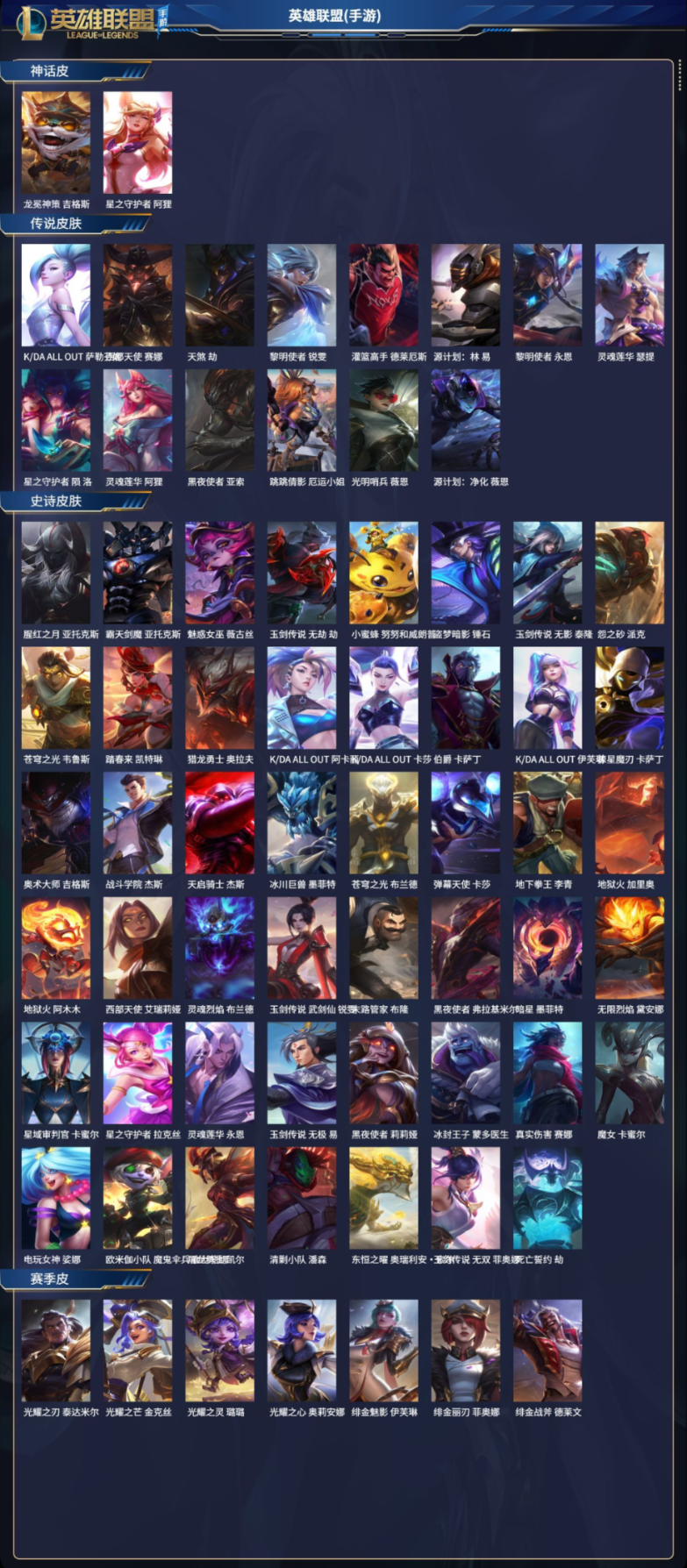实名情况:不可二次实名,131英雄-134皮肤,龙冕神策 吉格斯,星之守护者 阿狸,K/DA ALL OUT 萨勒芬妮,西部天使 赛娜,天煞 劫,黎明使者 锐雯,灌篮高手 德莱厄斯,源计划:林 易,黎明使者 永恩,灵魂莲华 瑟提,星之守护者 陨 洛,灵魂莲华 阿狸,黑夜使者 亚索,跳跳倩影 厄运小姐,光明哨兵 薇恩,源计划:净化 薇恩,腥红之月 亚托克斯,霸天剑魔 亚托克斯,魅惑女巫 薇古丝,