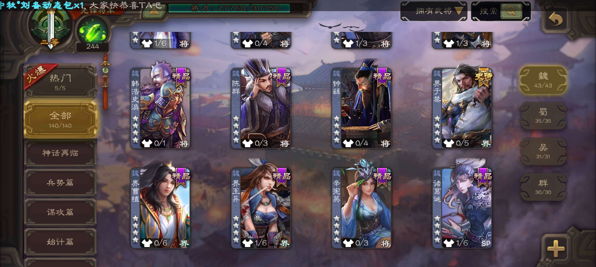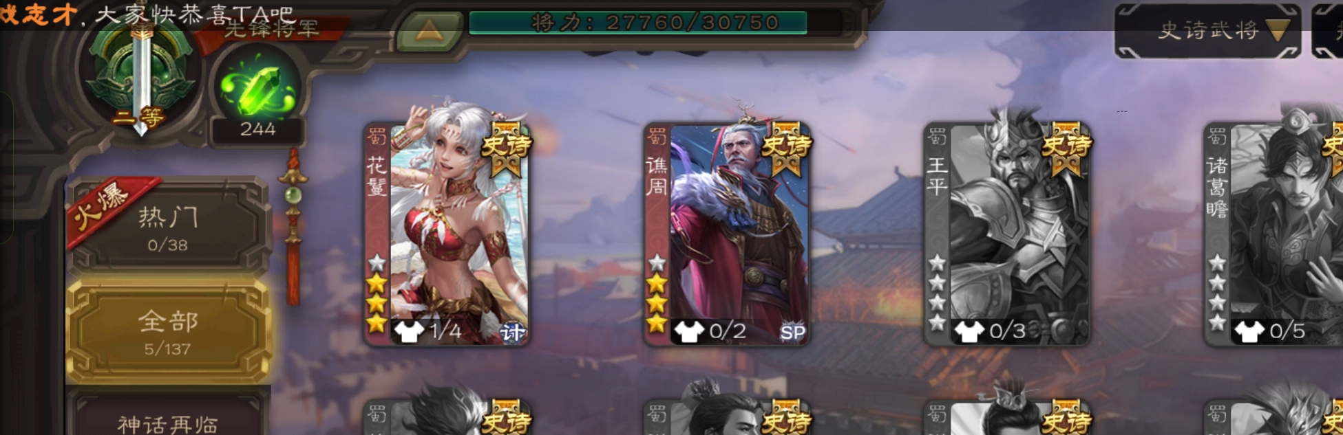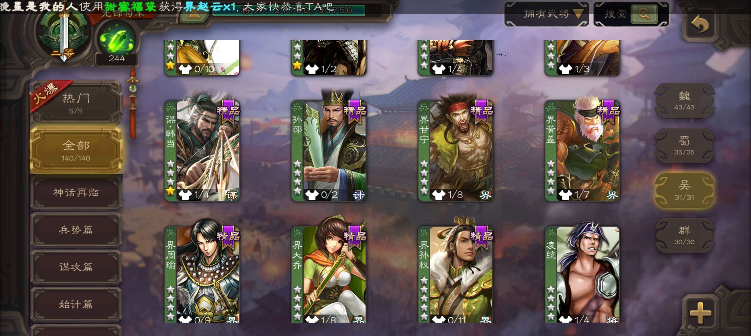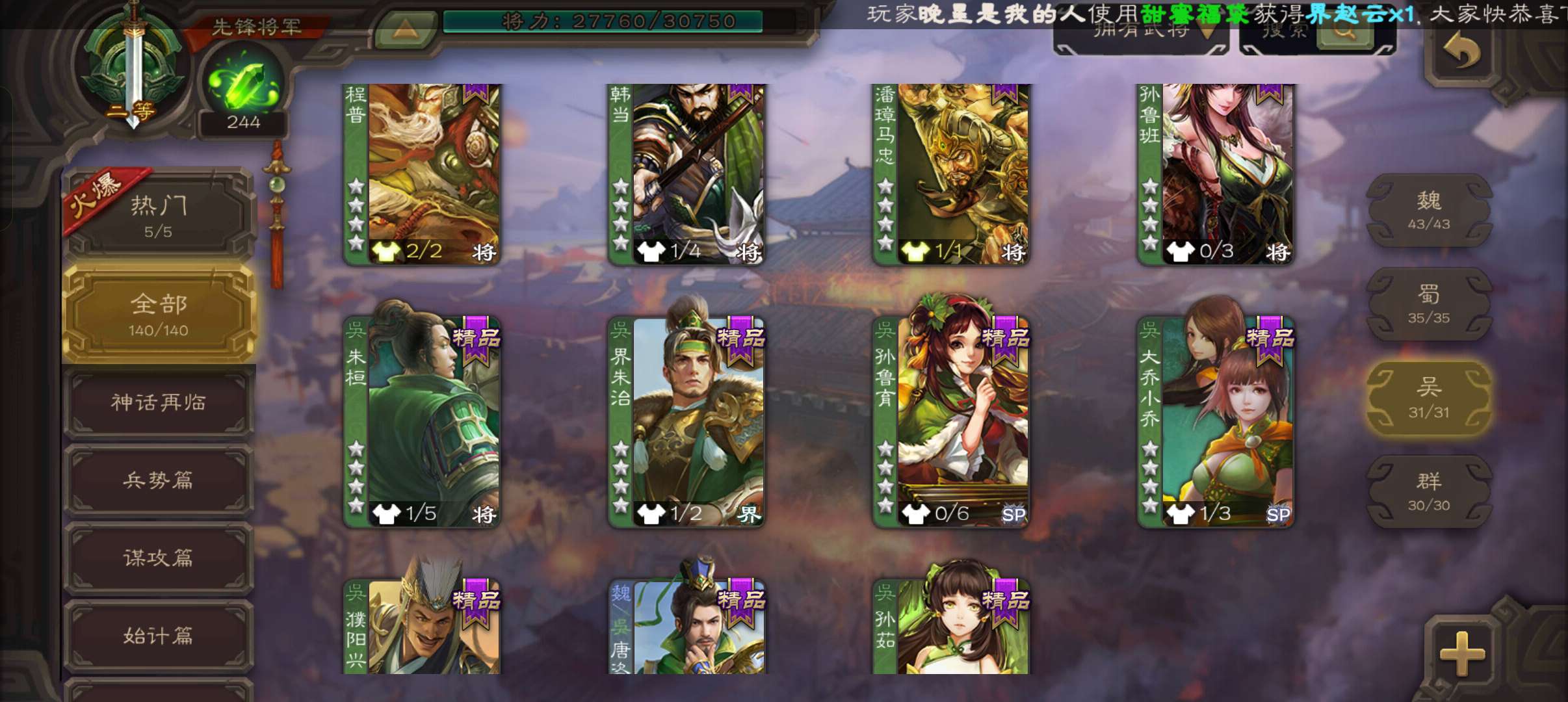 5万豆,天工闫象,回廊动界李儒动花鬘谯周界于禁沮授5史诗先锋,神周瑜神吕蒙谋韩当界孙权关银屏140将