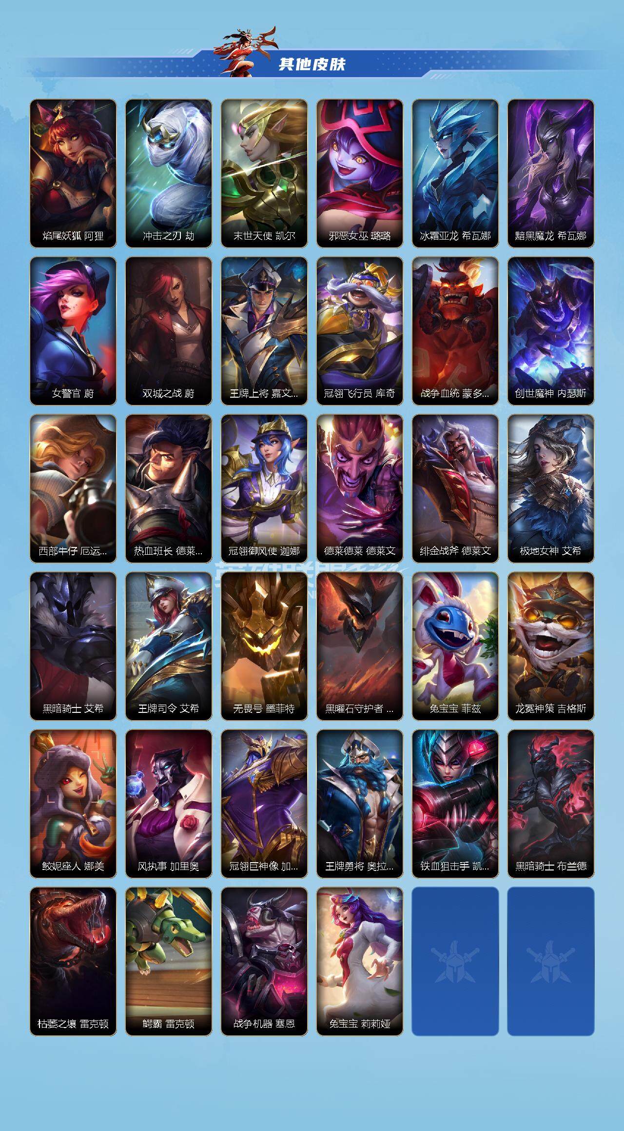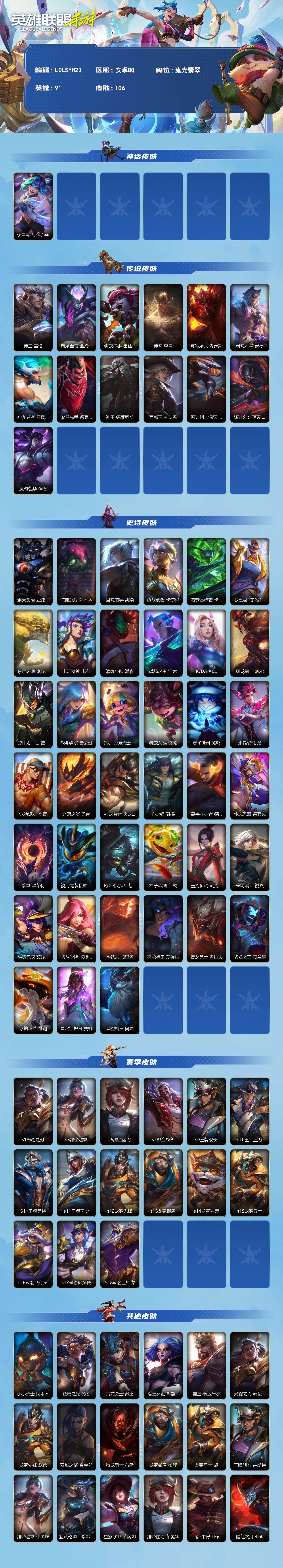 【LOLSYH23】91英雄/106皮肤/流光翡翠/夜星流火 金克丝/神王 盖伦/海魔至尊 亚托克斯/驯龙炮手 崔丝塔娜/神拳 李青/炼狱魔犬 内瑟斯/灵魂莲华 瑟提/神龙尊者 驭风啸龙 易/灌篮高手 德莱厄斯/神王 德莱厄斯/西部天使 艾希/源计划:泯灭 雷克顿/源计划:毁灭 派克/灵魂莲华 锤石/霸天剑魔 亚托克斯/惊悚派对 阿木木/摄魂猎手 凯隐/黎明使者 卡尔玛/猎梦吞噬者 卡兹克/礼物选好了吗? 布隆/东恒之曜 奥瑞利安·索尔/电玩女神 卡莎/清剿小队 潘森/战场之王 亚索/K/DA