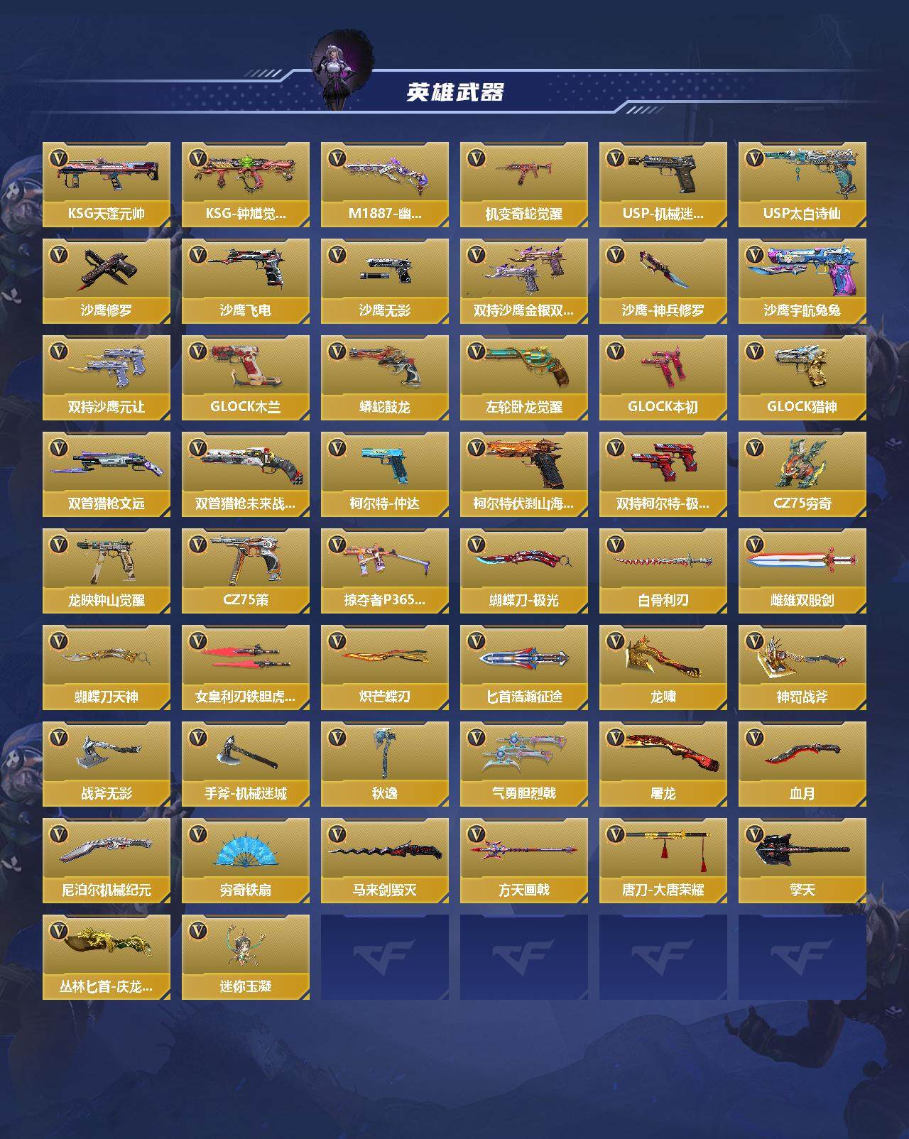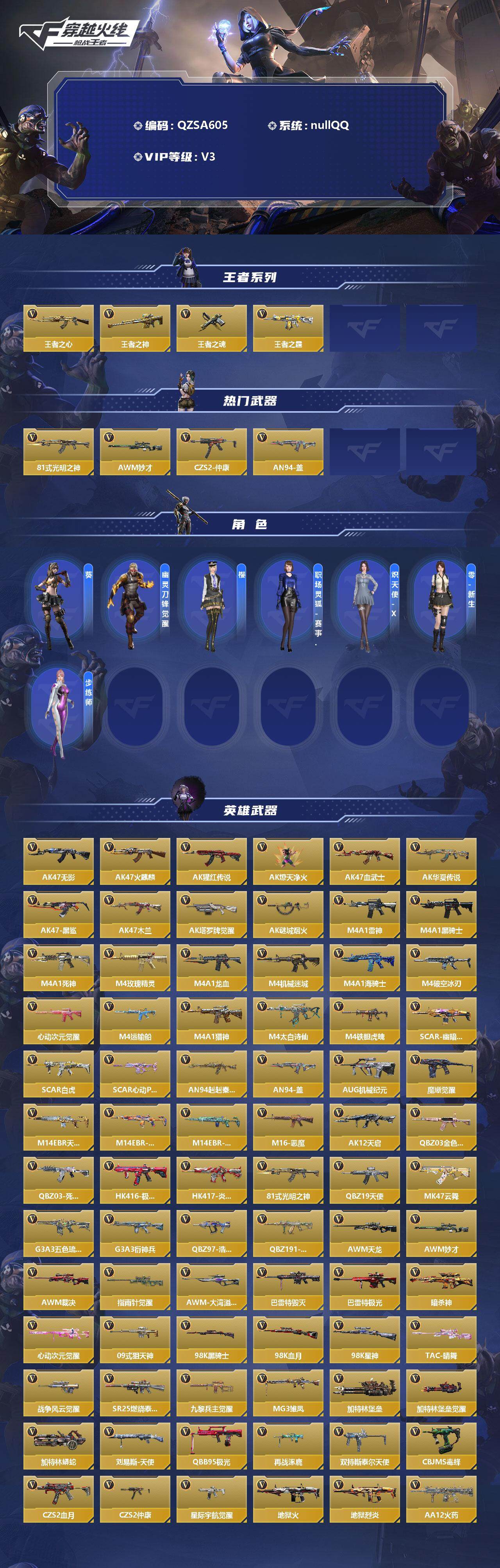 【QZSA605】VIP3/225V/4王者/王者之心/王者之神/王者之魂/王者之霆/81式-光明之神/AWM-妙才/CZS2-仲康/AN94-盖/葵/幽灵刀锋觉醒/樱/职场灵狐赛事经理/炽天使-X/零-新生/步练师/AK47-无影/AK47-火麒麟/AK47-猩红传说/AK47-燎天净火/AK47-血武士/AK47-华夏传说/AK47-黑鲨/AK47-木兰/AK47-塔罗牌觉醒/AK47-谜城烟火/M4A1-雷神/M4A1-黑骑士/M4A1-死神/M4A1-玫瑰精灵/M4A1-龙血/M4A1-