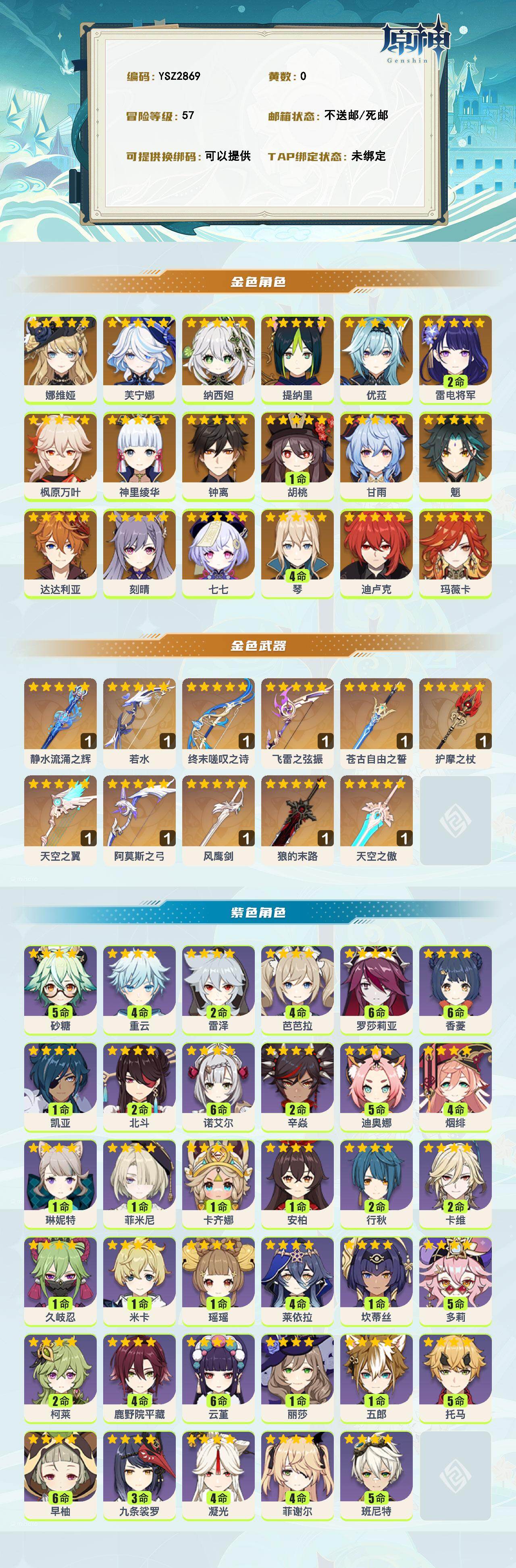 【YSZ2869】57级/女主/20个五星角色/玛薇卡/娜维娅/芙宁娜/纳西妲/提纳里/2命雷电将军/神里绫华/枫原万叶/优菈/1命胡桃/魈/甘雨/钟离/达达利亚/4命琴/刻晴/迪卢克/七七/静水流涌之辉/若水/飞雷之弦振/苍古自由之誓/终末嗟叹之诗/护摩之杖/天空之傲/狼的末路/阿莫斯之弓/风鹰剑/天空之翼/卡齐娜/菲米尼/1命琳妮特/2命卡维/米卡/瑶瑶/4命莱依拉/1命坎蒂丝/5命多莉/2命柯莱/4命鹿野院平藏/久岐忍/满命云堇/1命五郎/5命托马/3命九条裟罗/满命早柚/4命烟绯/满命罗