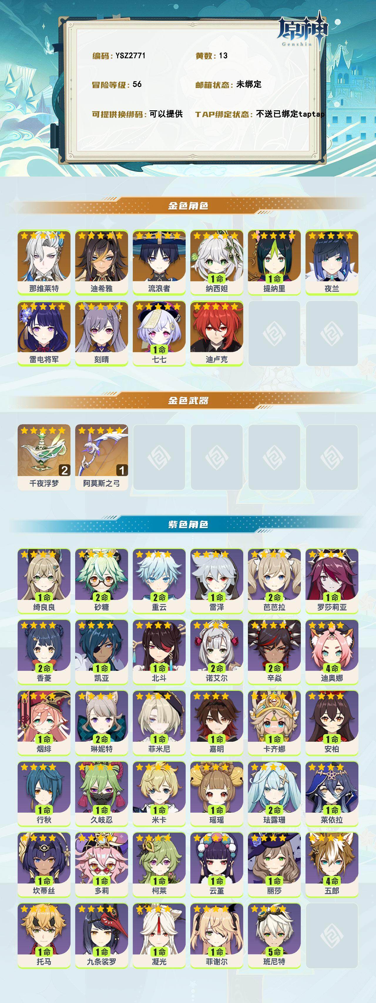【YSZ2771】56级/13黄/女主/11个五星角色/2个五星武器/那维莱特/迪希雅/流浪者/1命纳西妲/1命提纳里/夜兰/雷电将军/刻晴/迪卢克/1命七七/精2千夜浮梦/阿莫斯之弓/卡齐娜/嘉明/菲米尼/2命琳妮特/1命绮良良/1命米卡/1命瑶瑶/2命珐露珊/1命莱依拉/1命坎蒂丝/1命多莉/1命柯莱/久岐忍/1命云堇/4命五郎/1命托马/1命九条裟罗/1命烟绯/罗莎莉亚/2命辛焱/4命迪奥娜/2命砂糖/雷泽/1命菲谢尔/0命丽莎/北斗/2命香菱/安柏/5命班尼特/行秋/2命芭芭拉/1命凝光