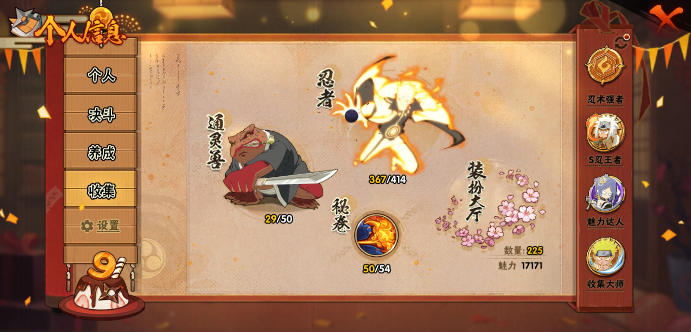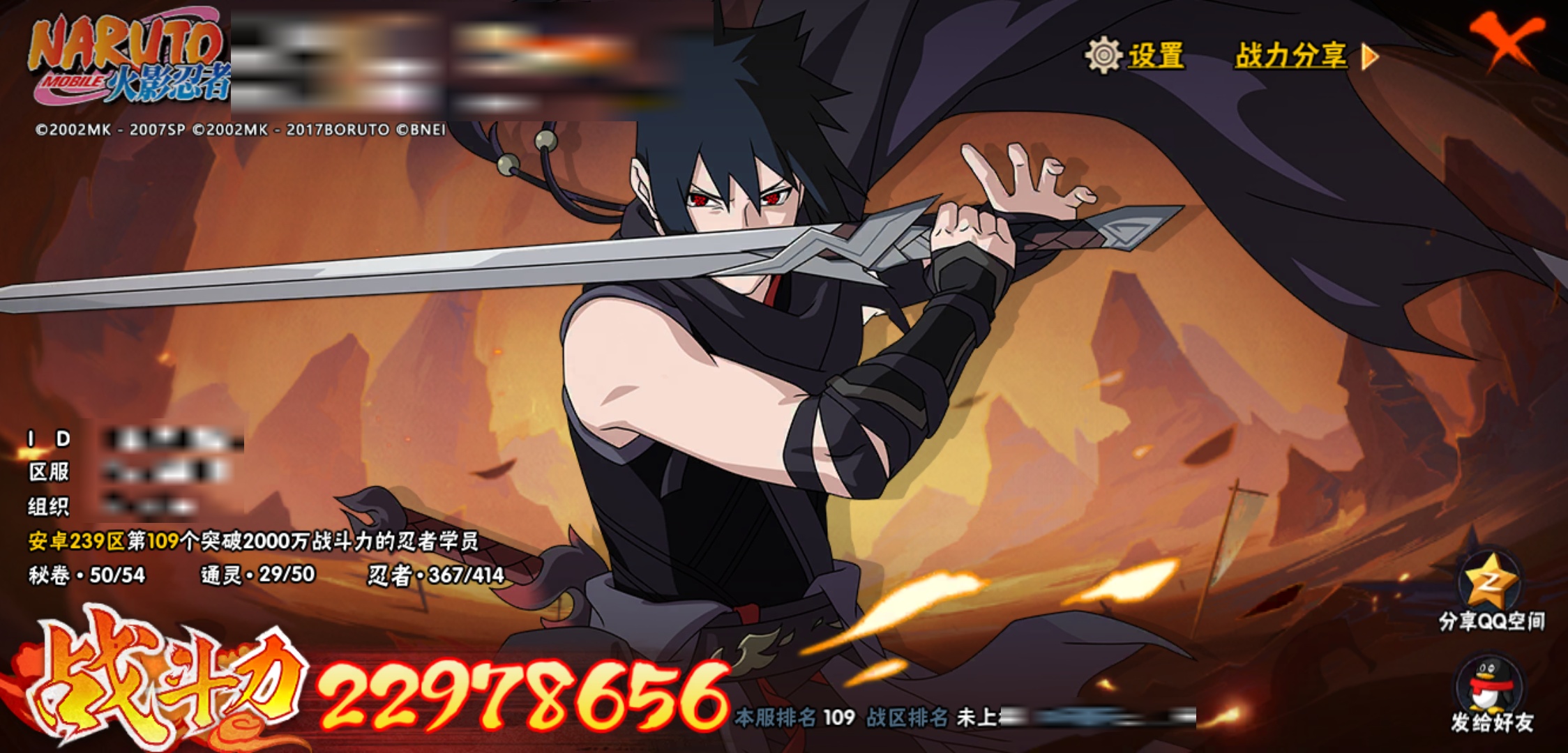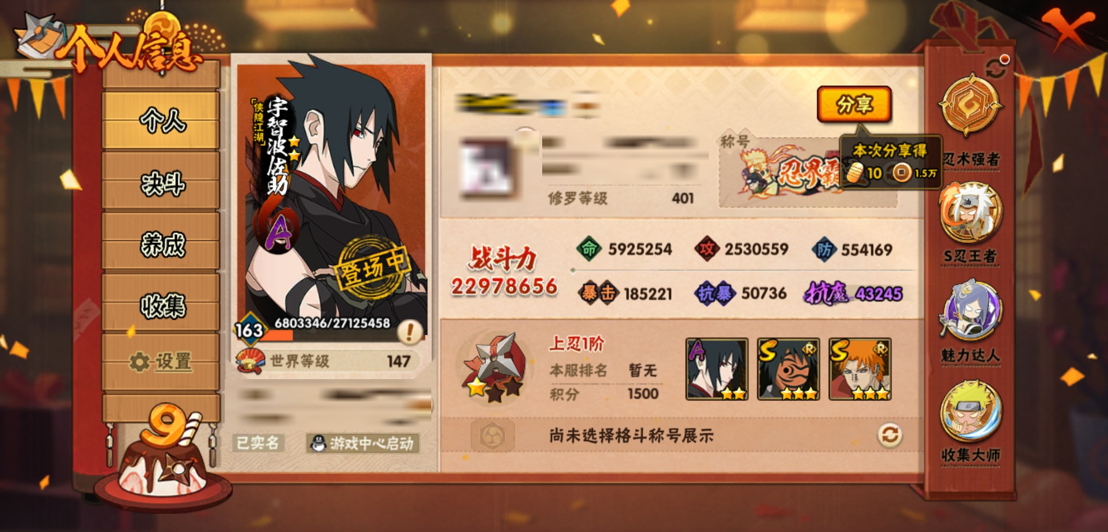 战斗力:2297W+;段位:上忍1阶;本服排名:109;战