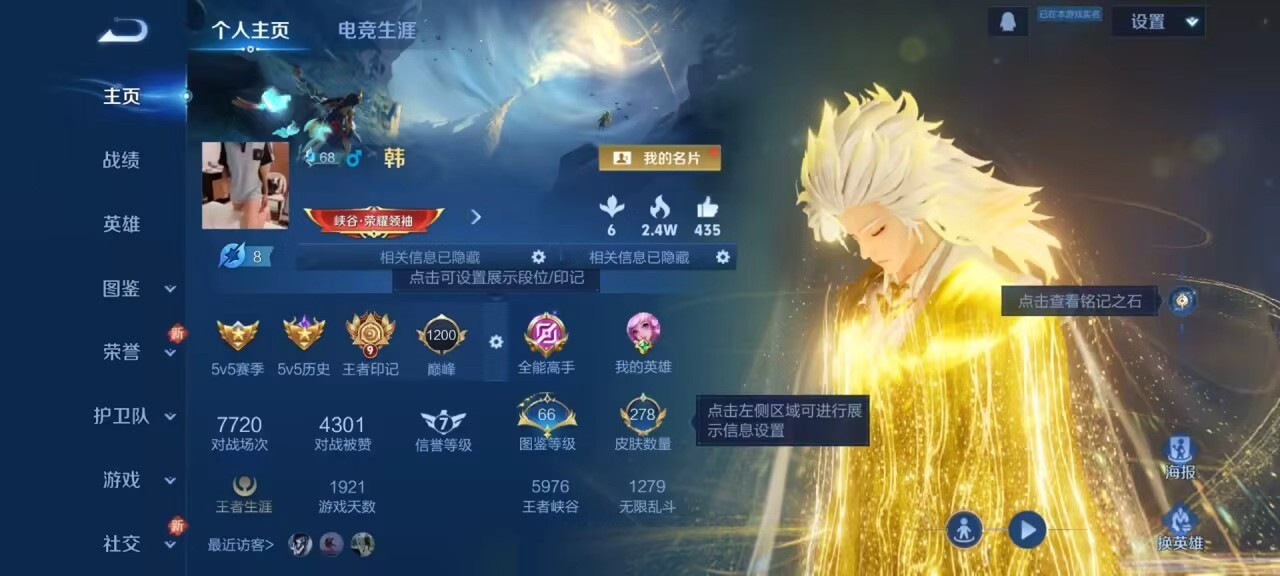 安卓QQ/最强王者/278皮肤/126英雄/1典藏/0珍品无双/1无双/1珍品传说/20传说/88史