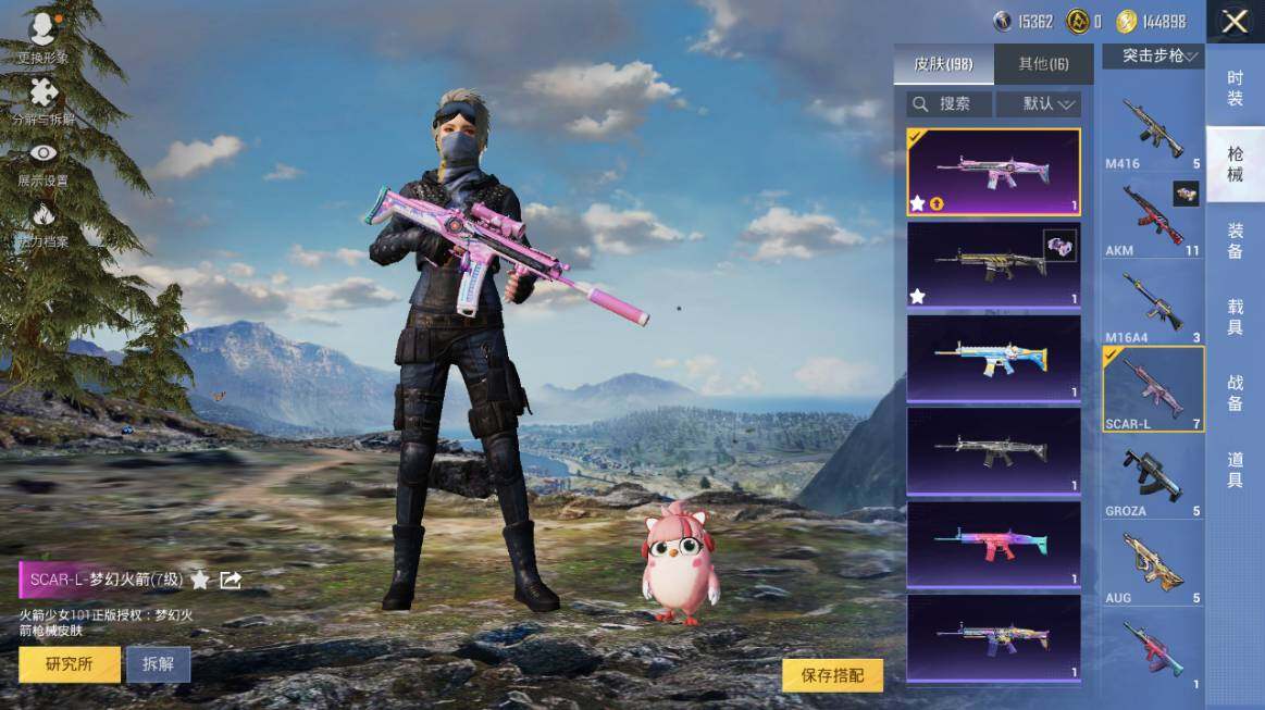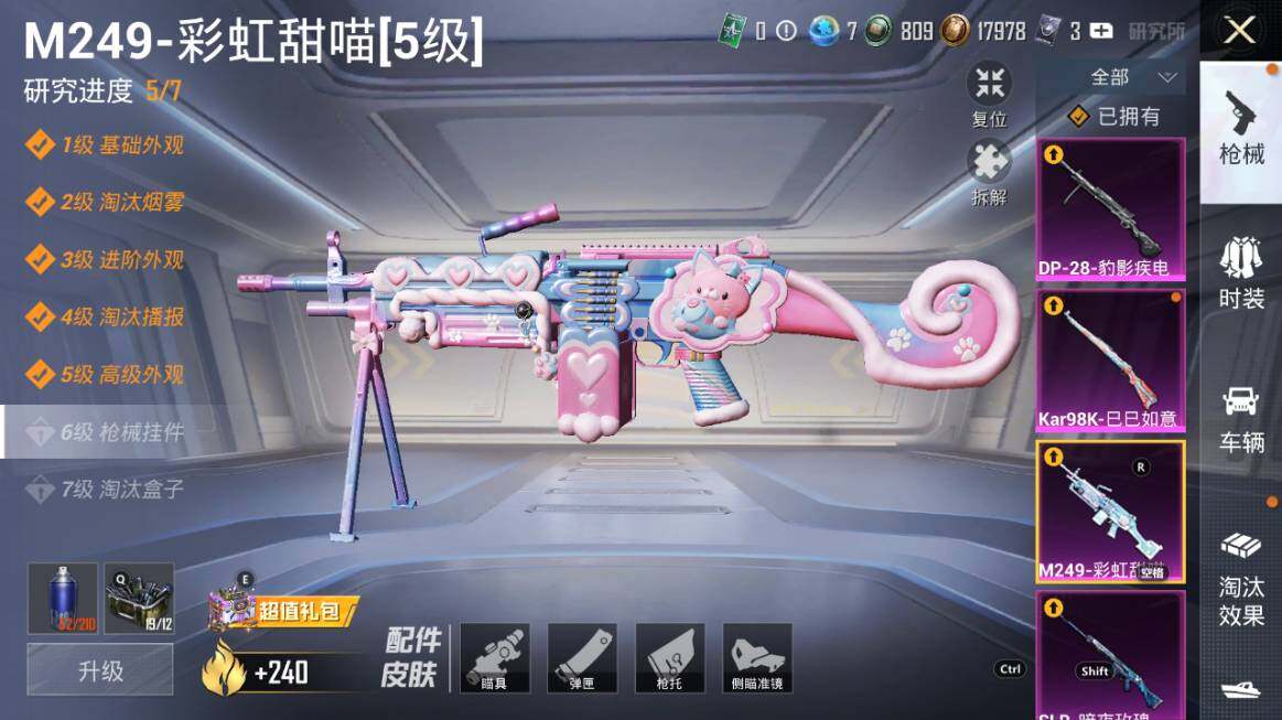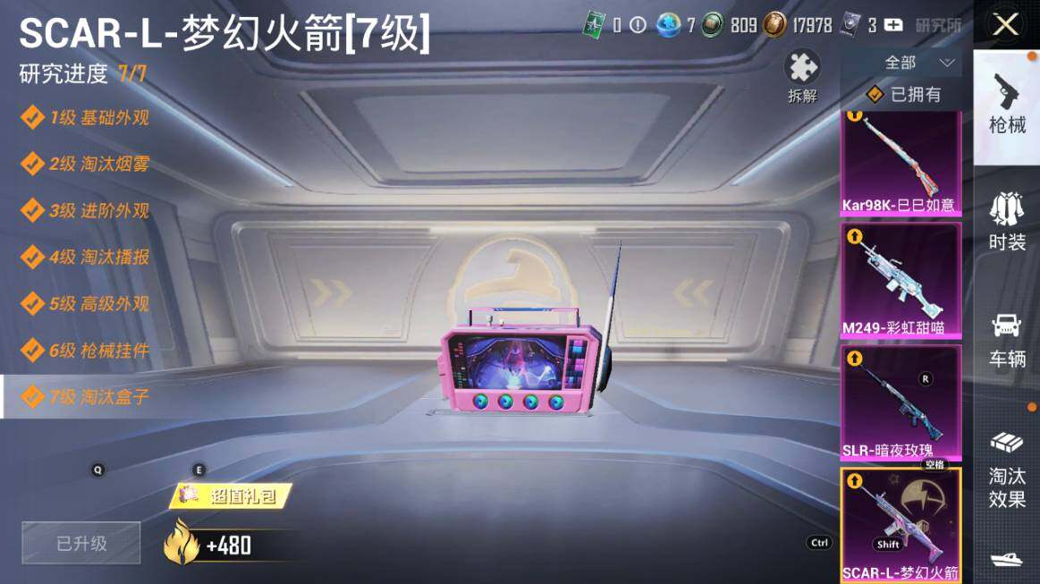 【粉色枪皮等级】:SCAR-L-梦幻火箭(七级),Kar98K-巳巳如意(