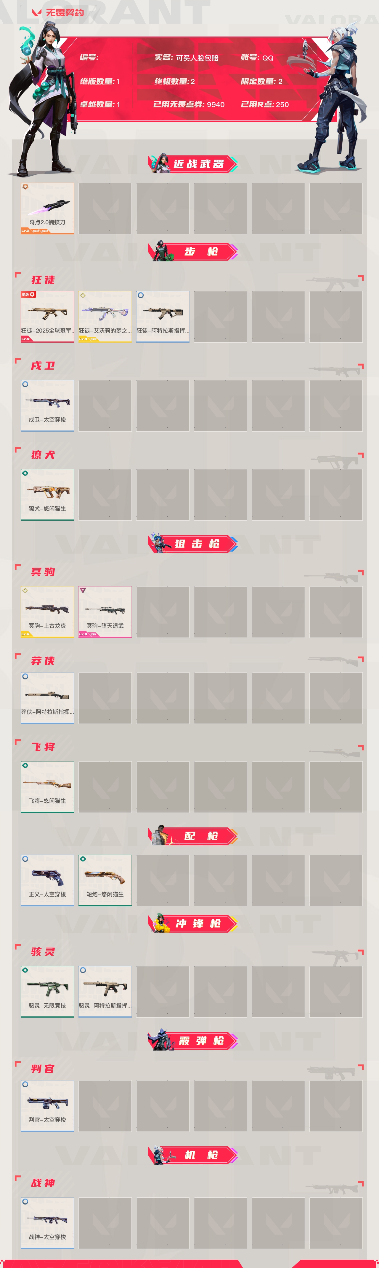 无畏契约【端游】刀皮数量1,枪皮数量15(绝版1限定2终极