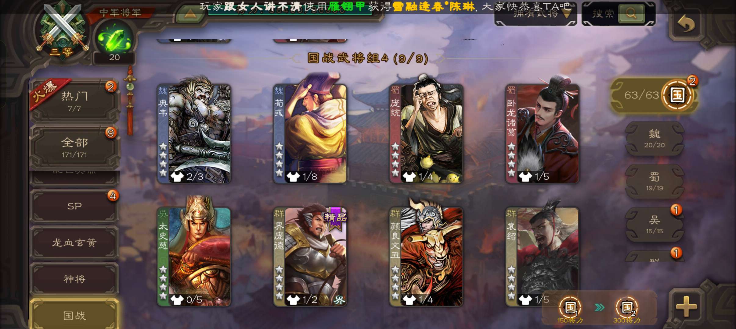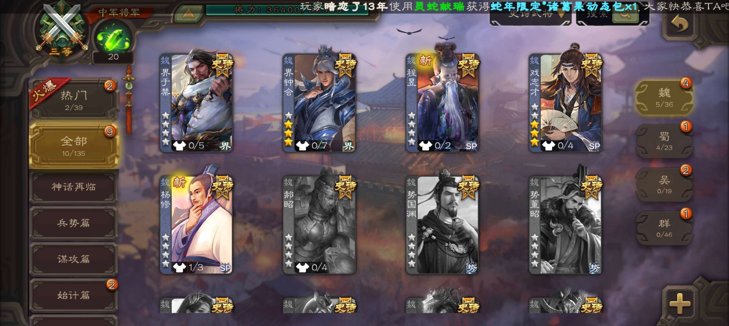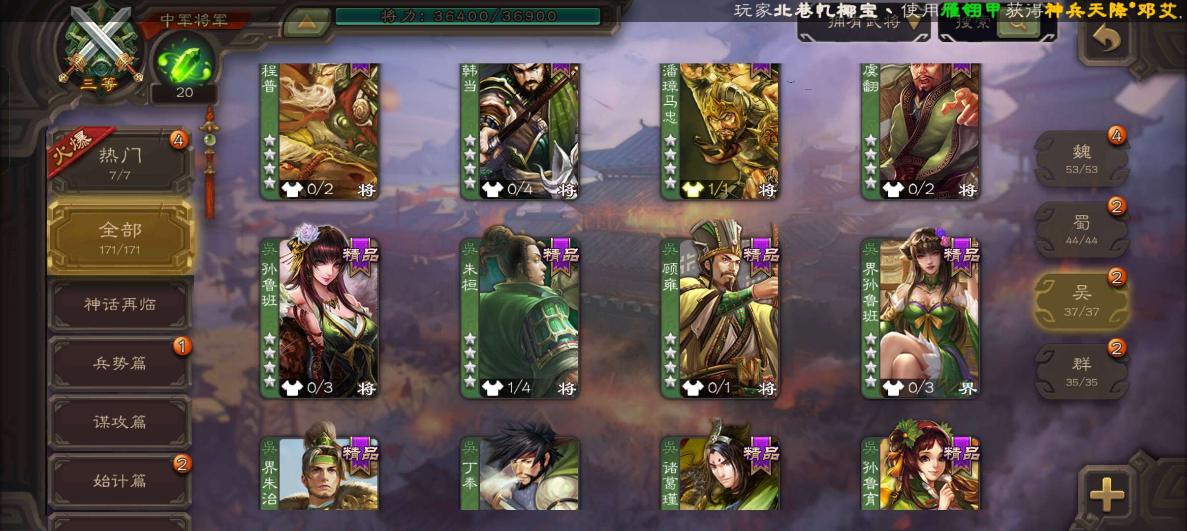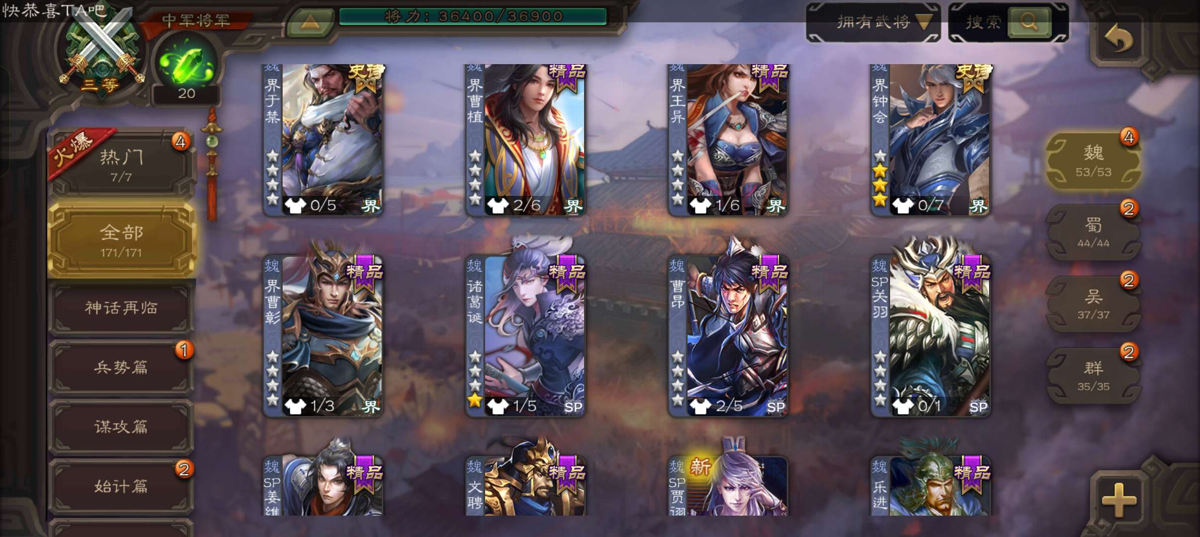 10史诗中军,8万羽毛,天工友徐庶,戏志才界钟会神吕布沙摩柯谋赵云谯周张星彩界于禁杨修程昱,神吕蒙