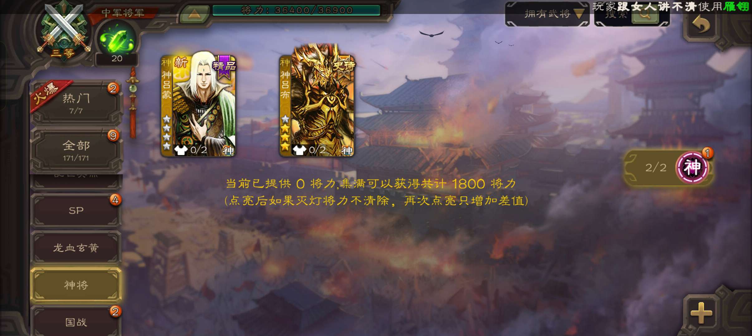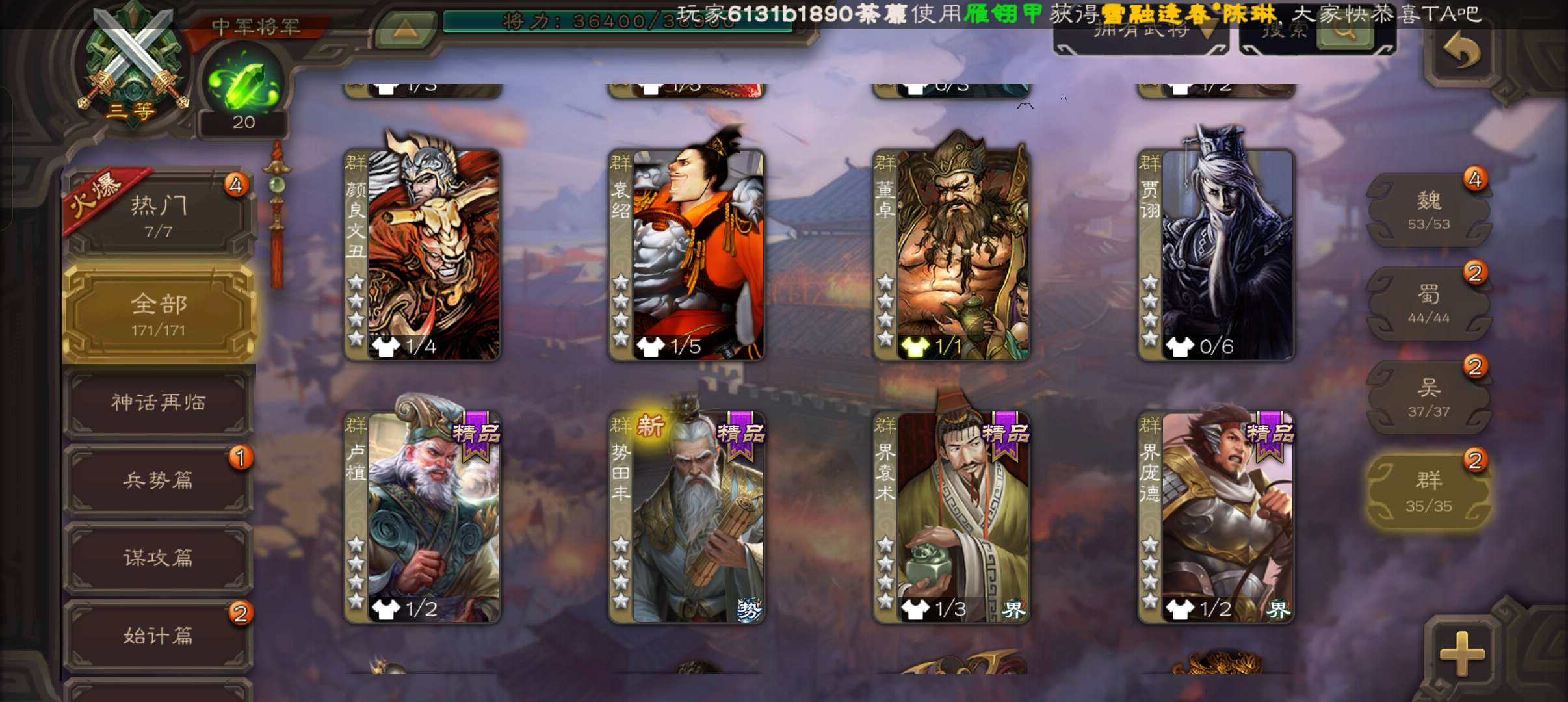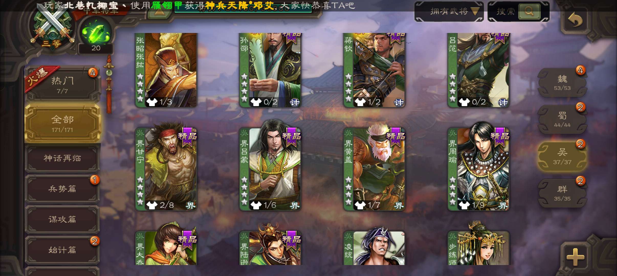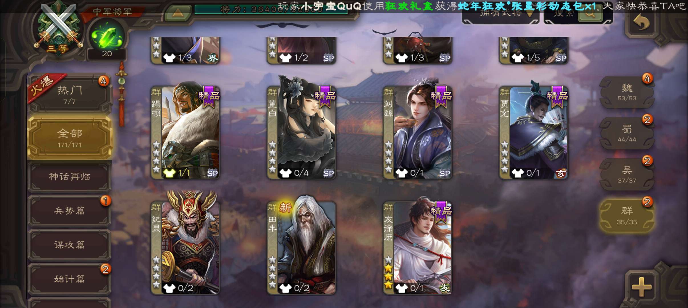 10史诗中军,8万羽毛,天工友徐庶,戏志才界钟会神吕布沙摩柯谋赵云谯周张星彩界于禁杨修程昱,神吕蒙