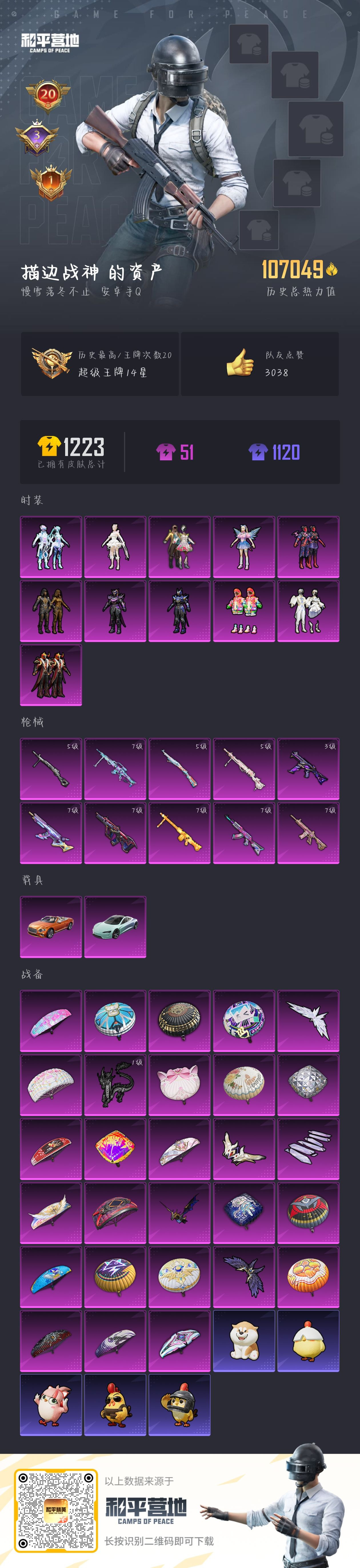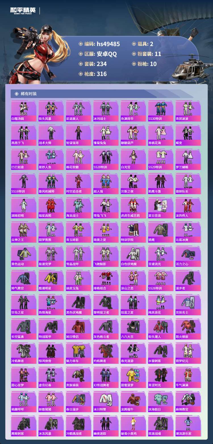 hs49485 安卓手Q-20王牌印记-11粉装-10特效枪-2载具-107049热力值-234套装