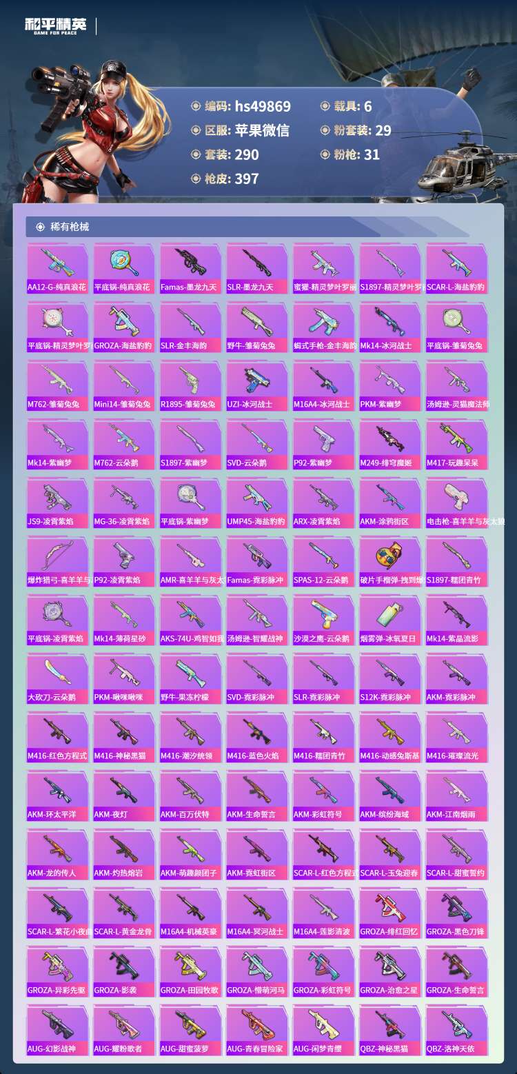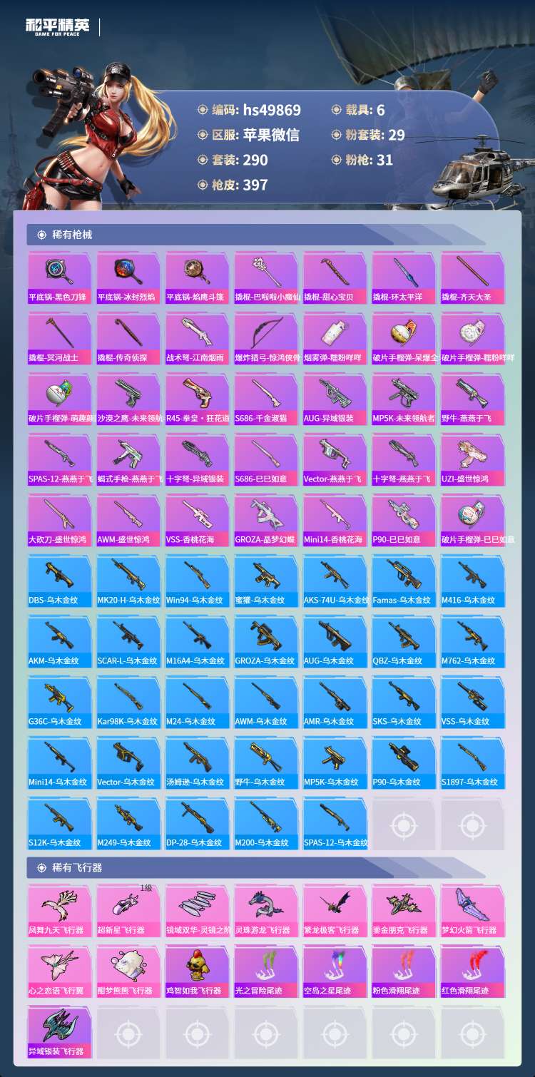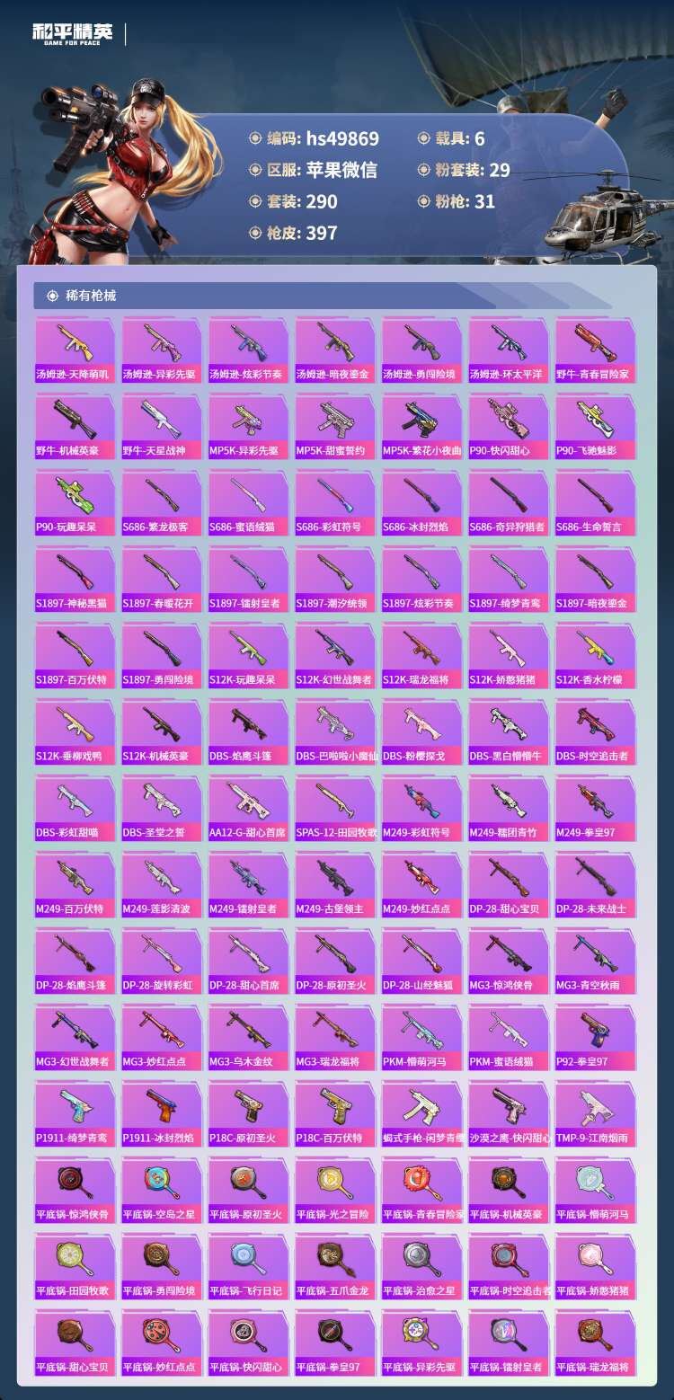 hs49869 苹果微-22王牌印记-有战神框-29粉装-31特效枪-6载具-159814热力值-