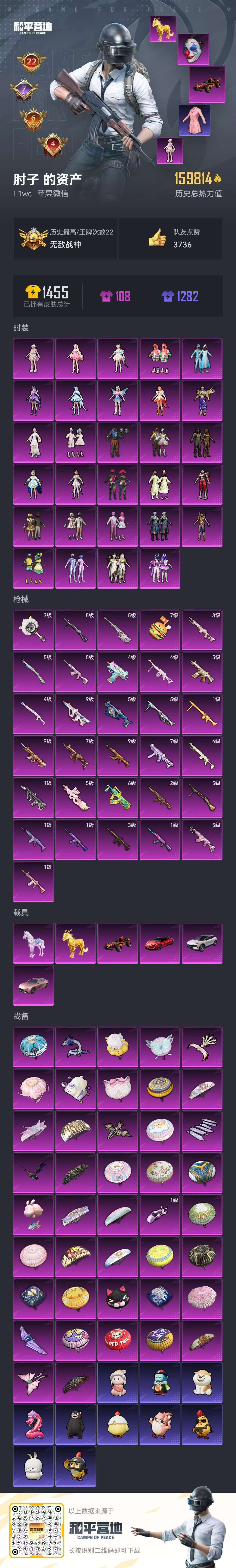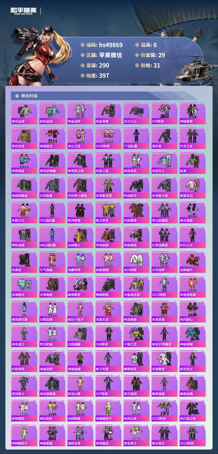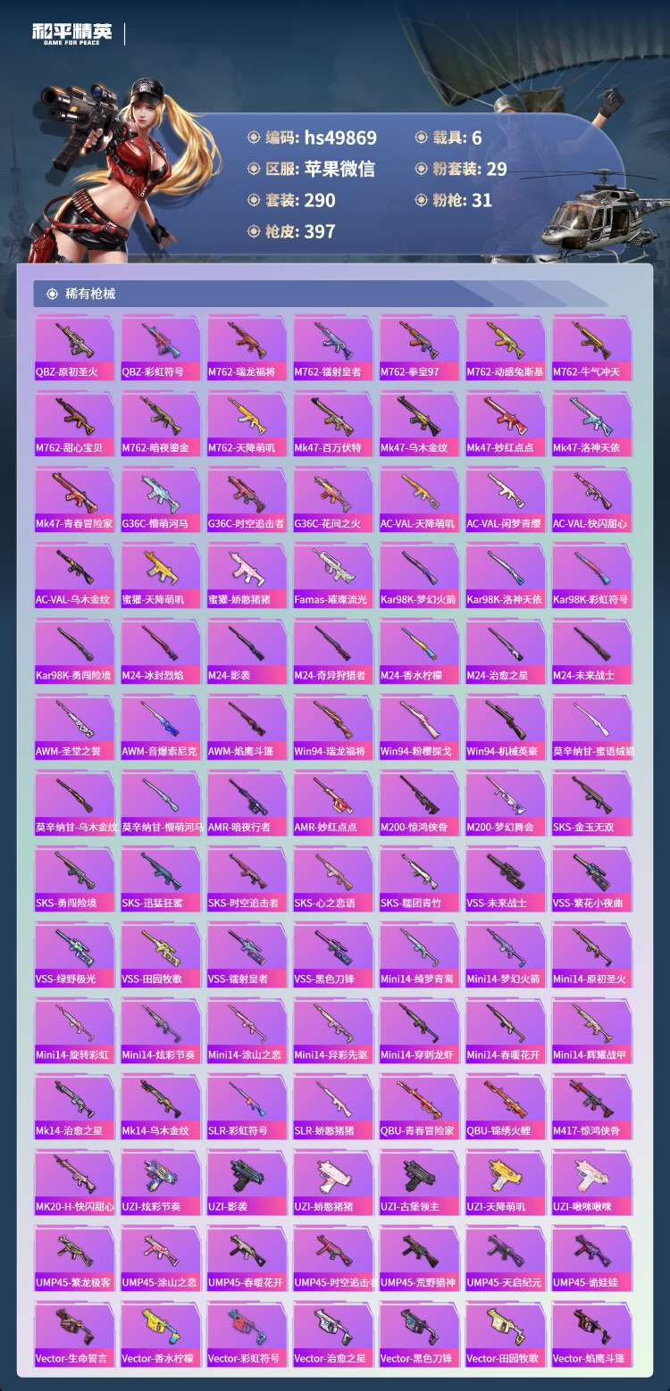 hs49869 苹果微-22王牌印记-有战神框-29粉装-31特效枪-6载具-159814热力值-