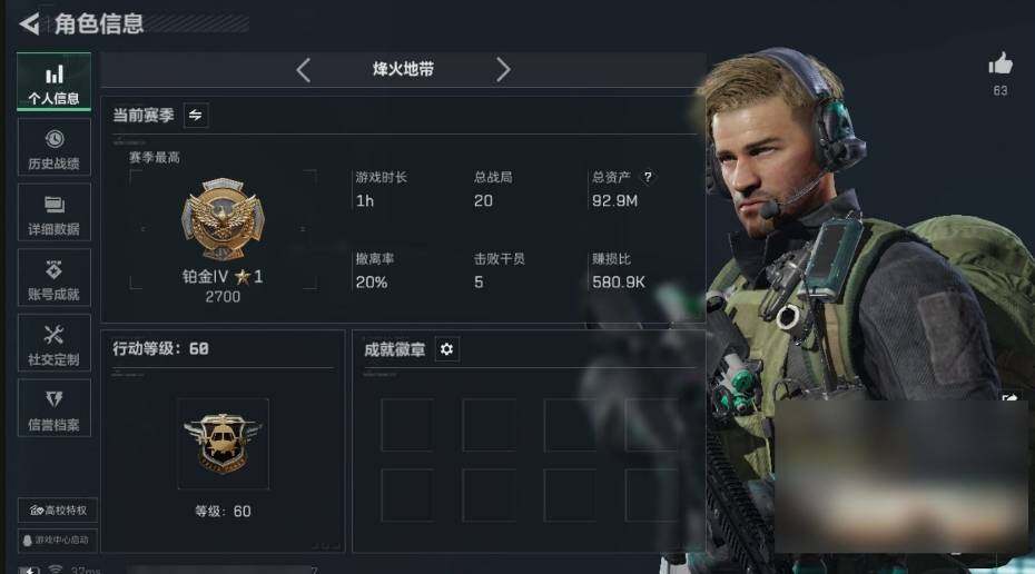 【个人信息】战场等级:14 列兵,行动等级:60 铂金