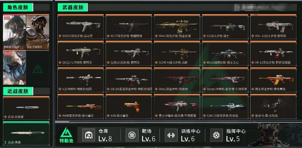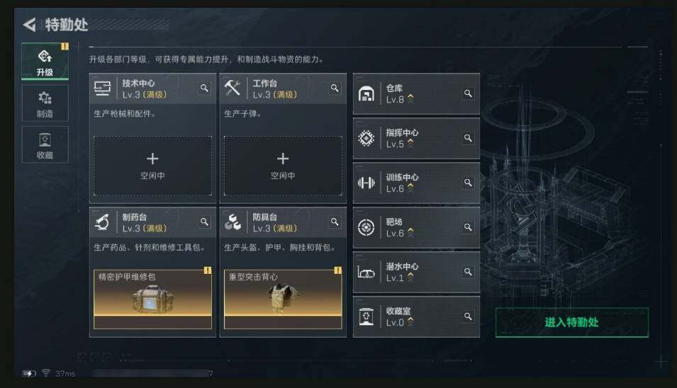【特勤处】制药台Lv.3/工作台Lv.3/仓库Lv.8/防具台Lv.3/训练中心Lv.6/靶场Lv.6/技术中心Lv.3/指挥中心Lv.5/潜
