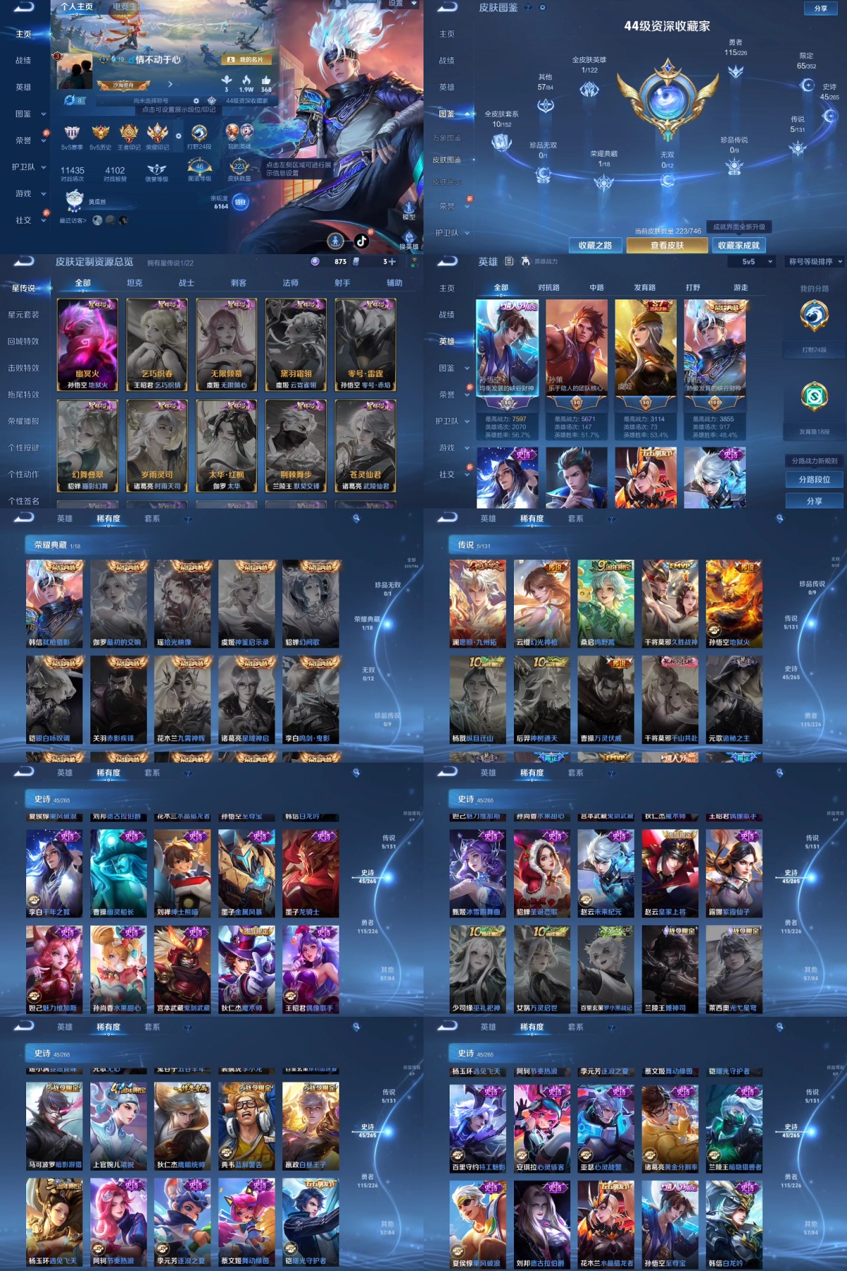 【贵族7 荣耀典藏1 无双0 传说皮肤5 史诗皮肤45 皮肤数量223】当前段位:钻石 贵族积分:25343热门皮肤:弑枪猎影 地狱火 久胜战神 幻光神枪 愿照.九州拓 至尊宝