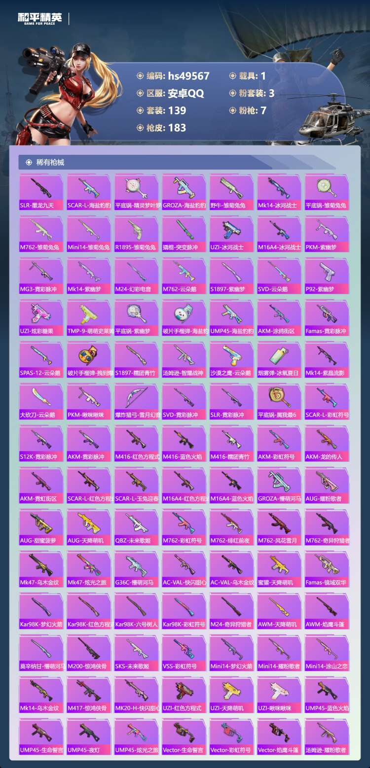 hs49567 安卓手Q-11王牌印记-3粉装-7特效枪-1载具-62274热力值-139套装-18