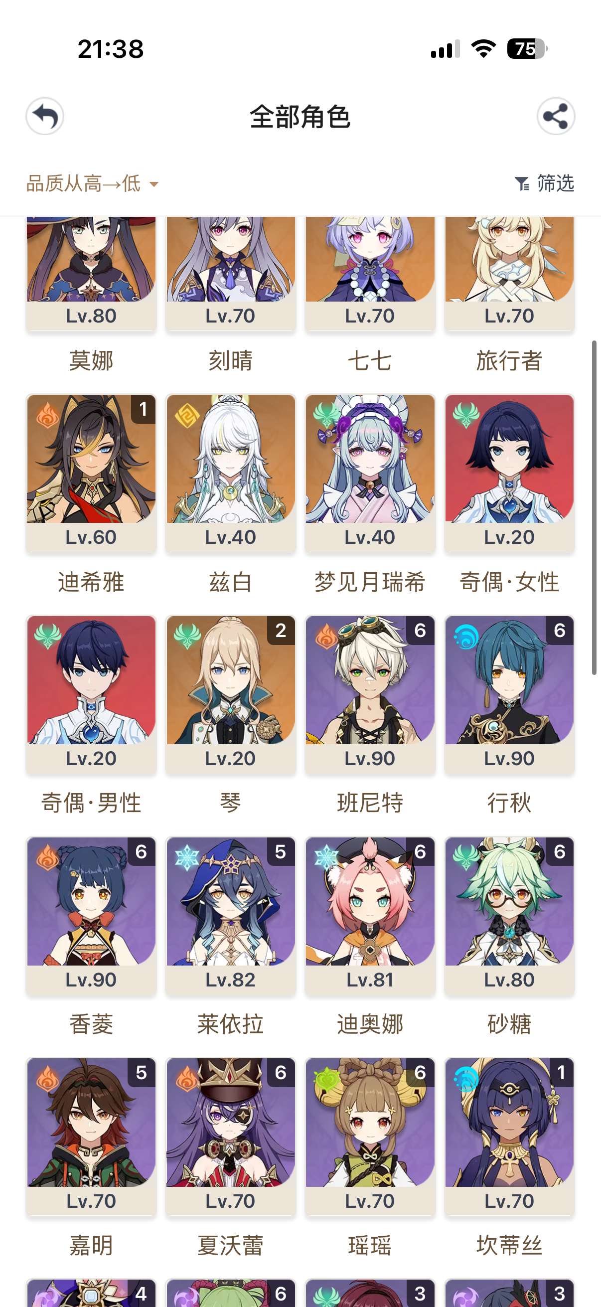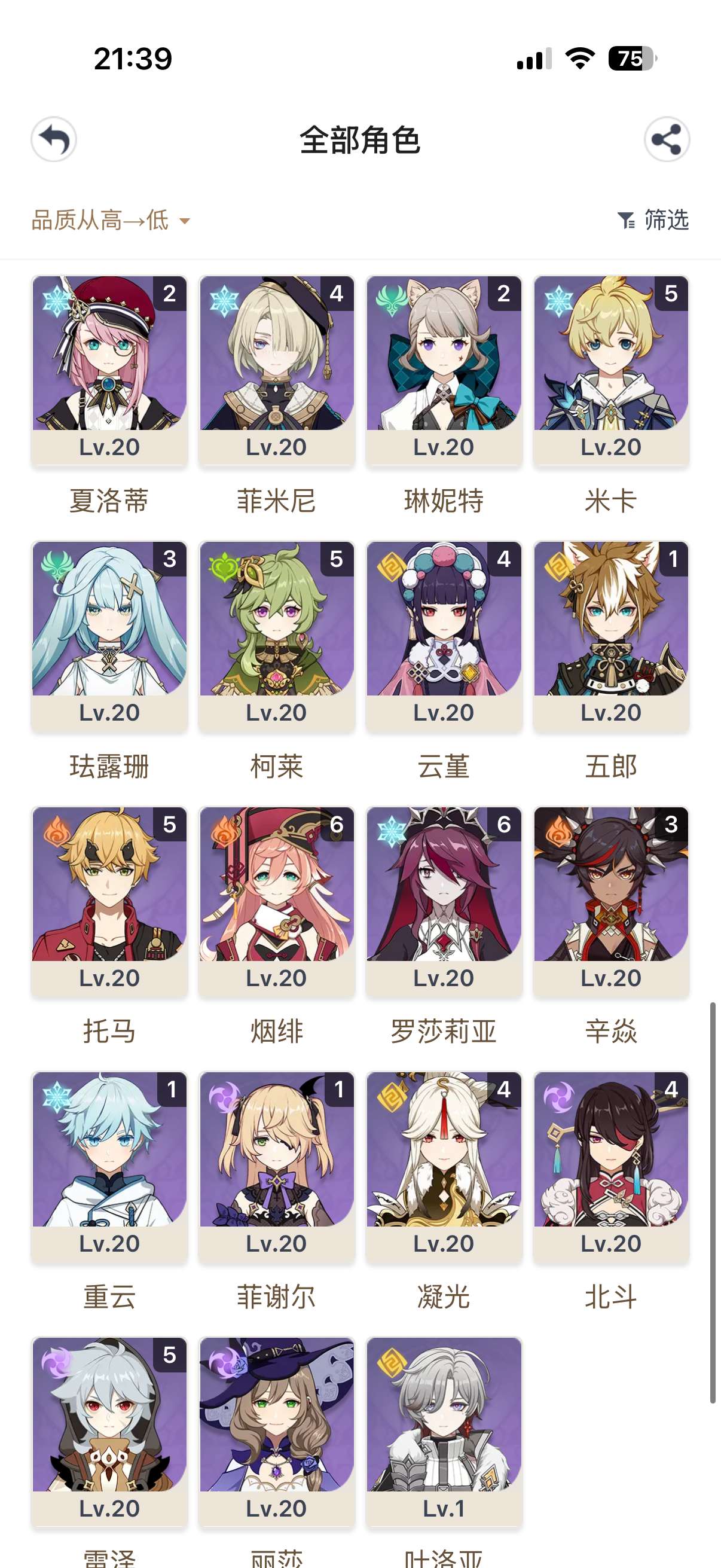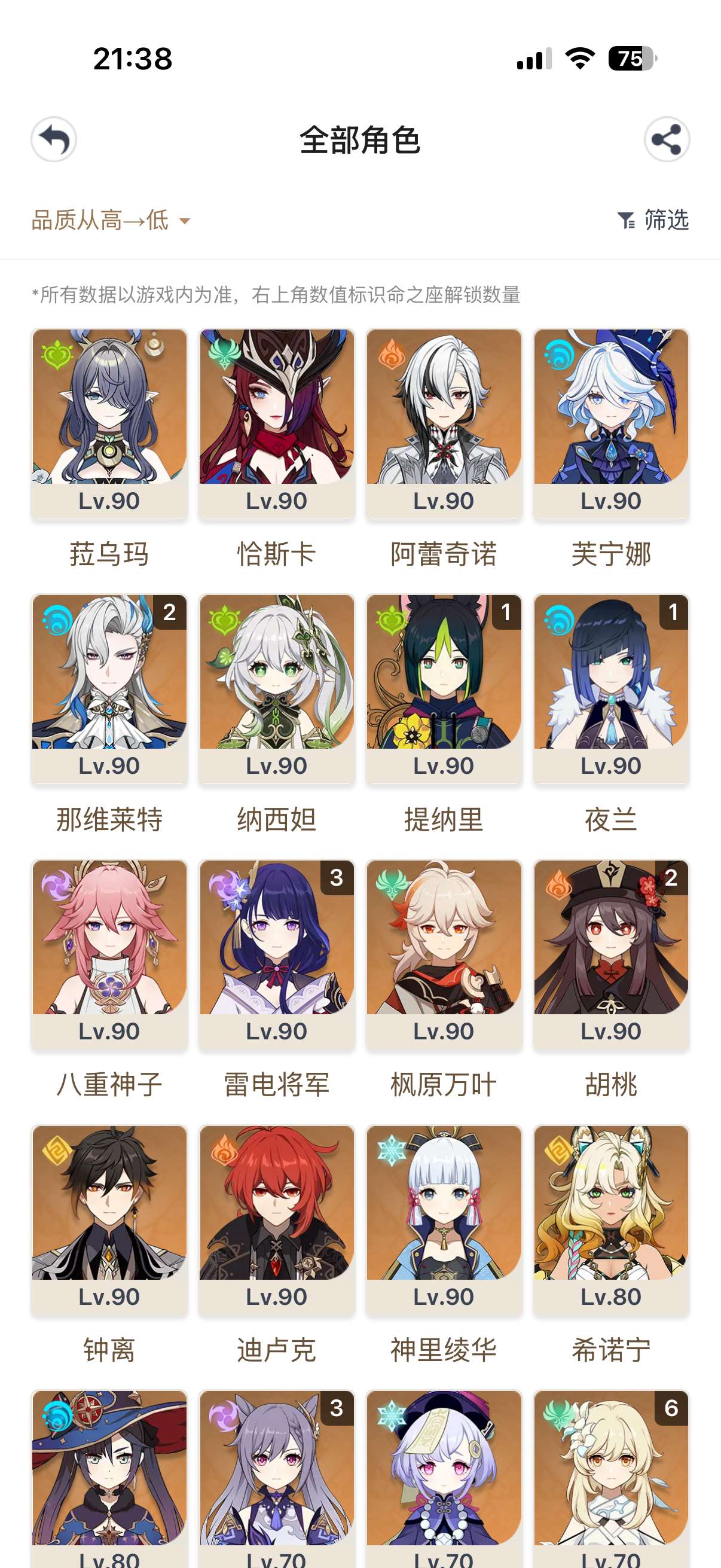 3命雷神2命胡桃2命龙王1命夜兰等,还有好多专武,5星圣遗物,角色练度很高