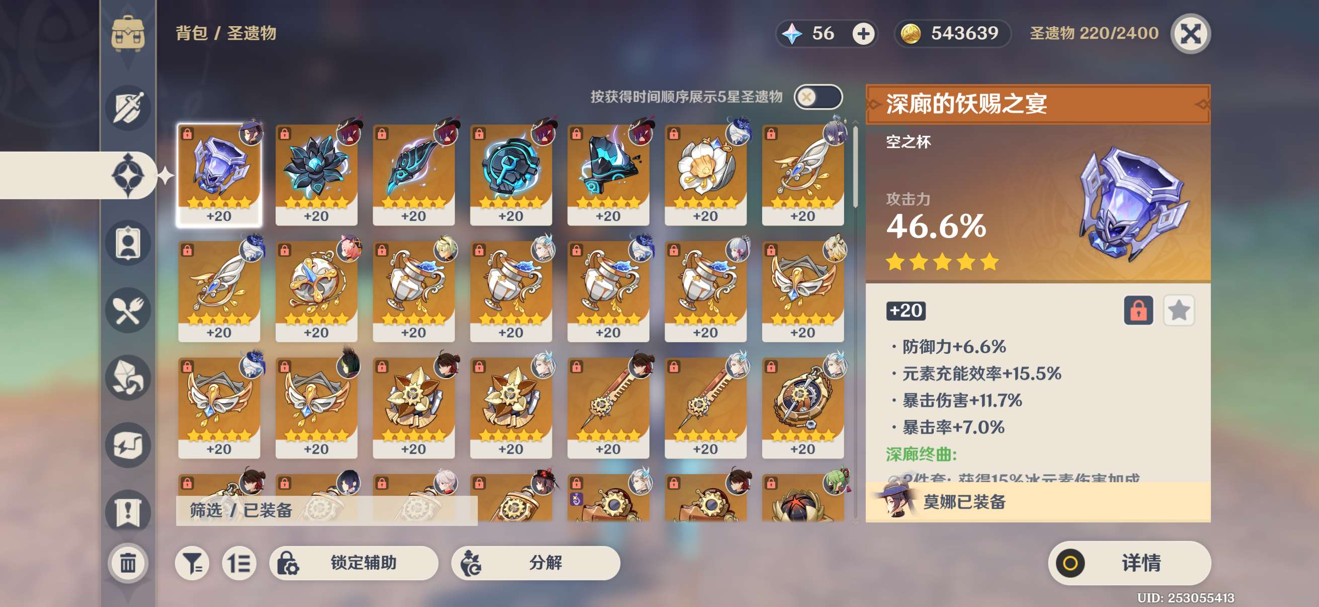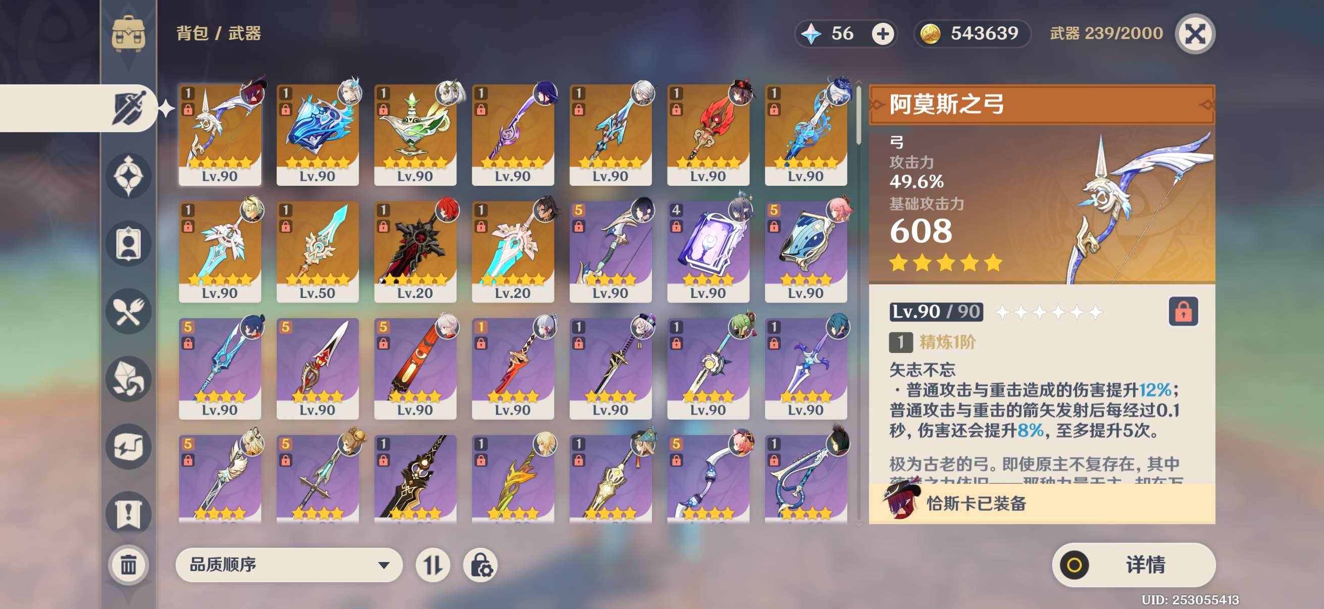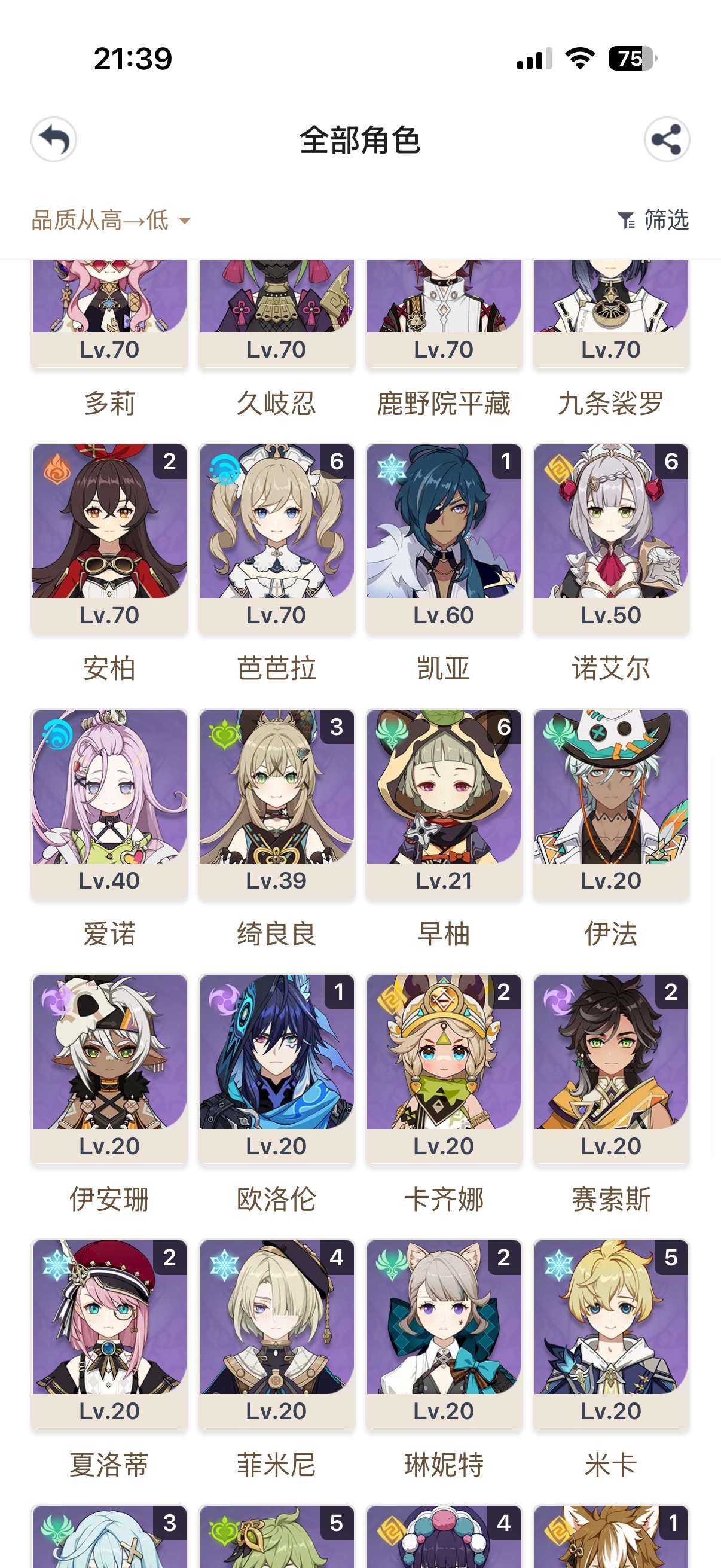 3命雷神2命胡桃2命龙王1命夜兰等,还有好多专武,5星圣遗物,角色练度很高