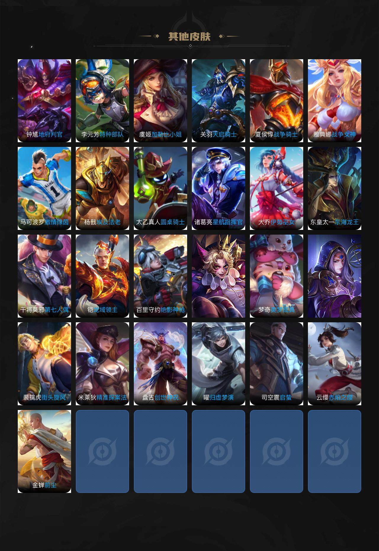【限定皮肤】:姜子牙天穹之誓,狄仁杰阴阳师,赵云皇家上将,芈月重明,芈月白晶晶,夏侯惇朔风刀,狄仁杰魔术师,狄仁杰万华元夜,达摩星际陆战队,达摩沙漠行僧,项羽海滩派对,老夫子醍醐
