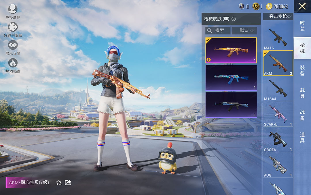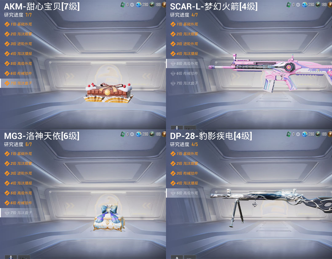 特效枪4:AKM-甜心宝贝7级,SCAR-L-梦幻火箭4级,MG3-洛神天依6级,DP-28-豹影疾电4级
