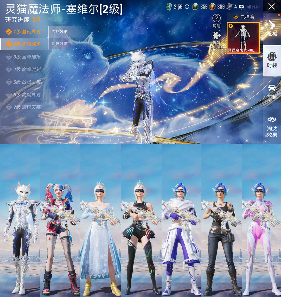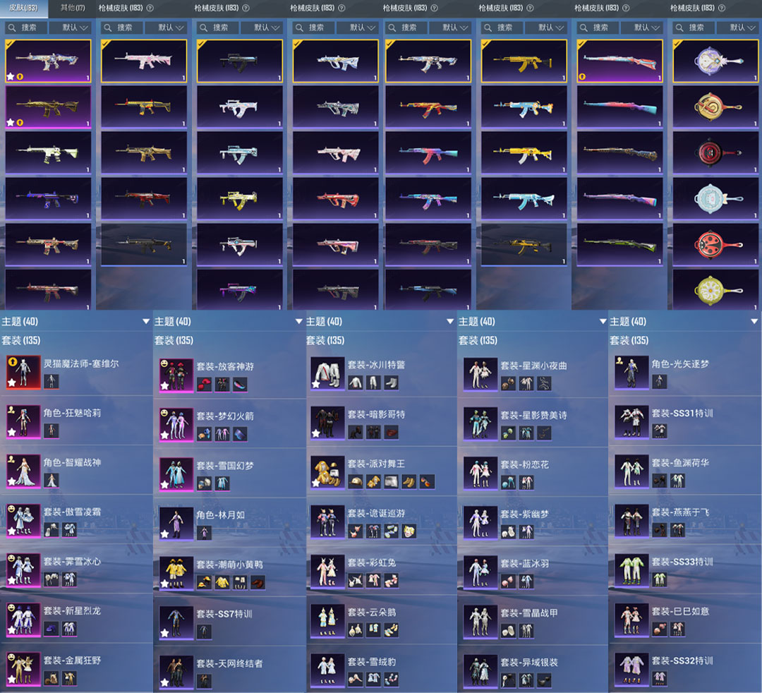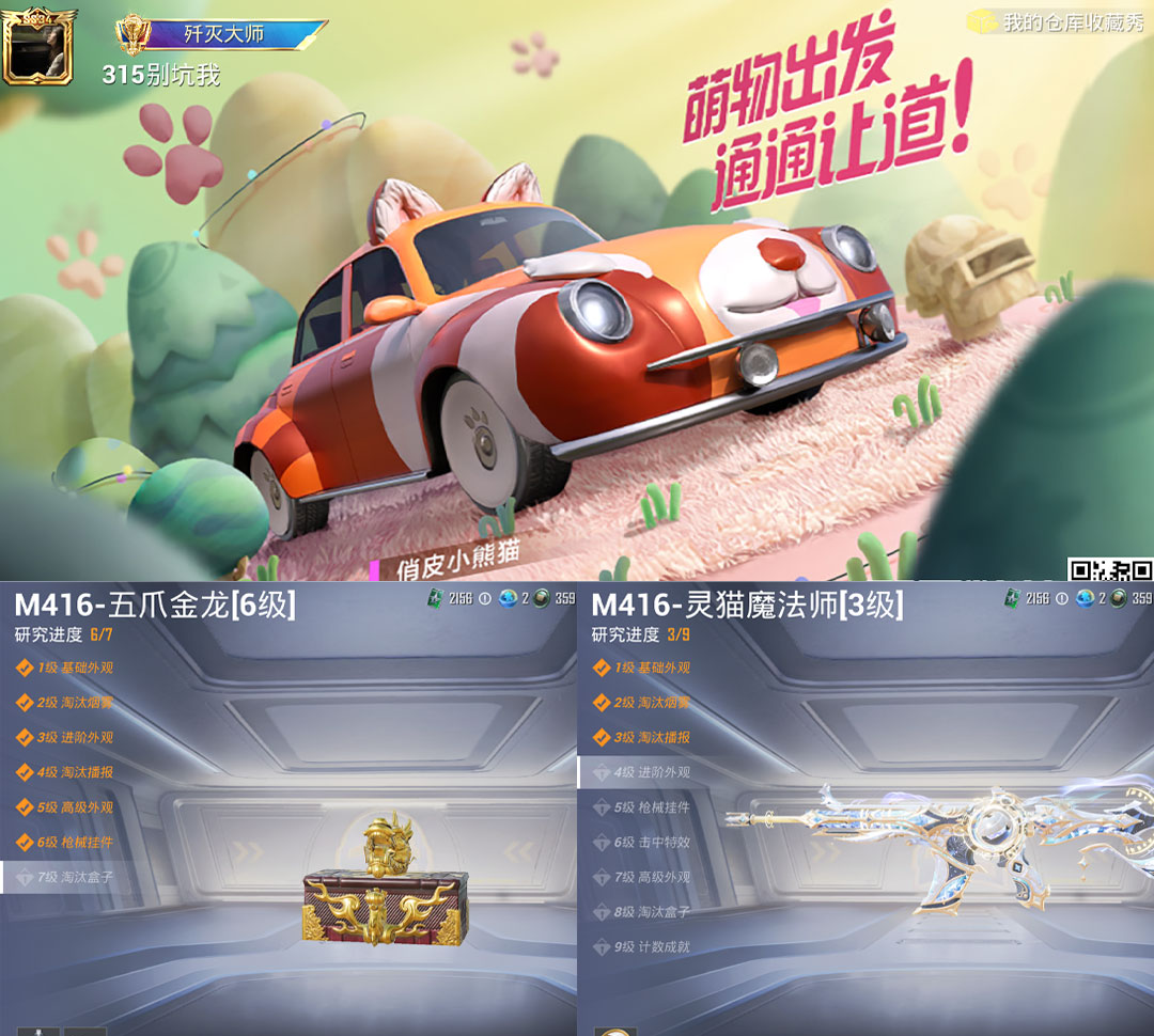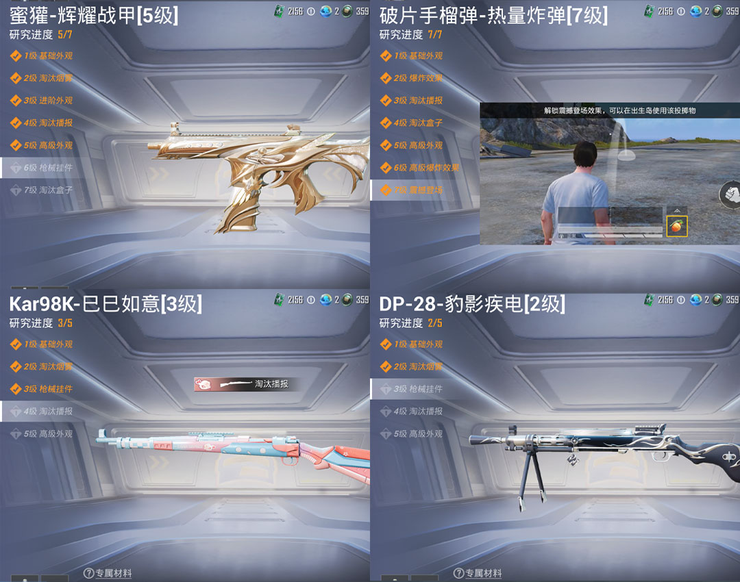 特效枪6:M416-灵猫魔法师/3级,,M416-五爪金龙/6级,,破片手榴弹-热量炸弹/7级,,Kar98K-巳巳如意/3级,,DP-28-豹影疾电/2级,,蜜獾-辉耀战甲/5级,