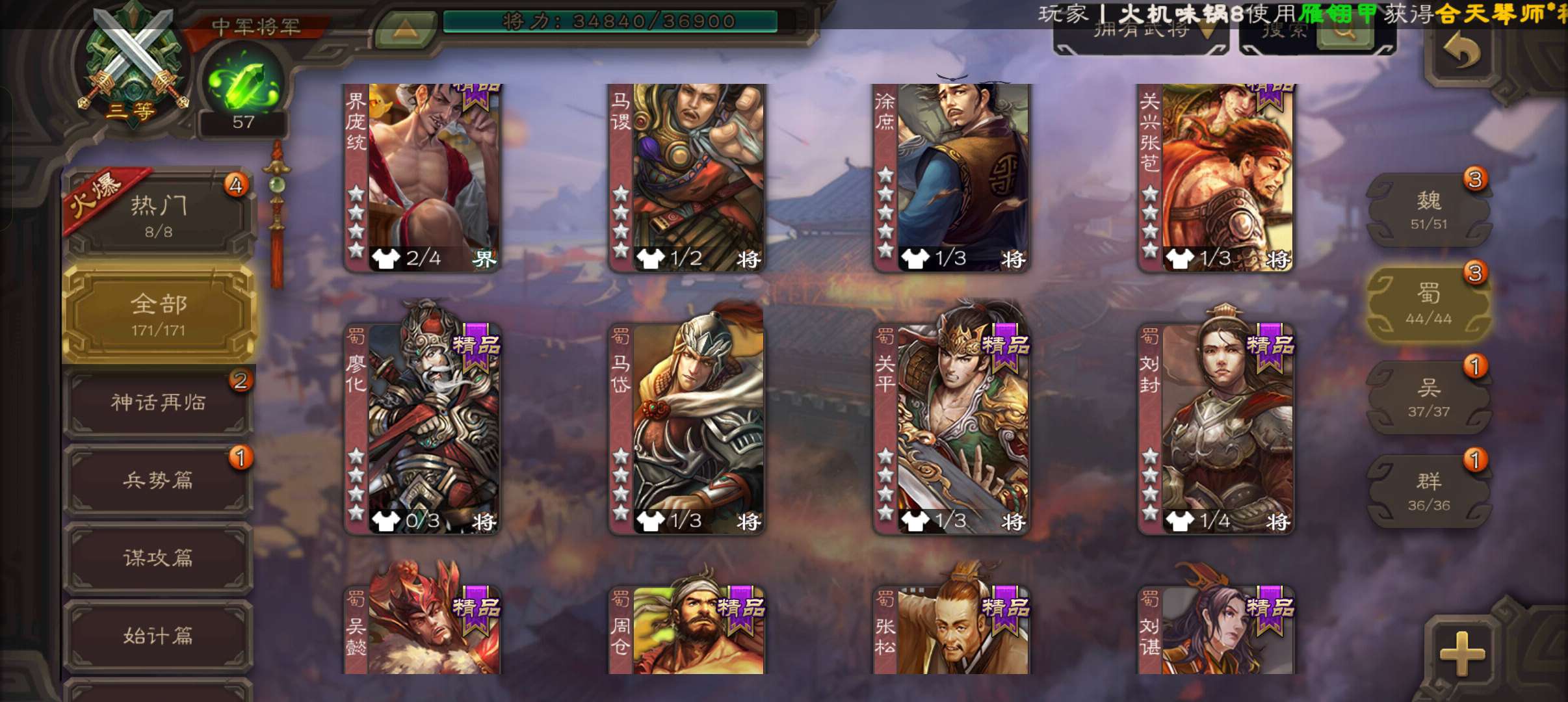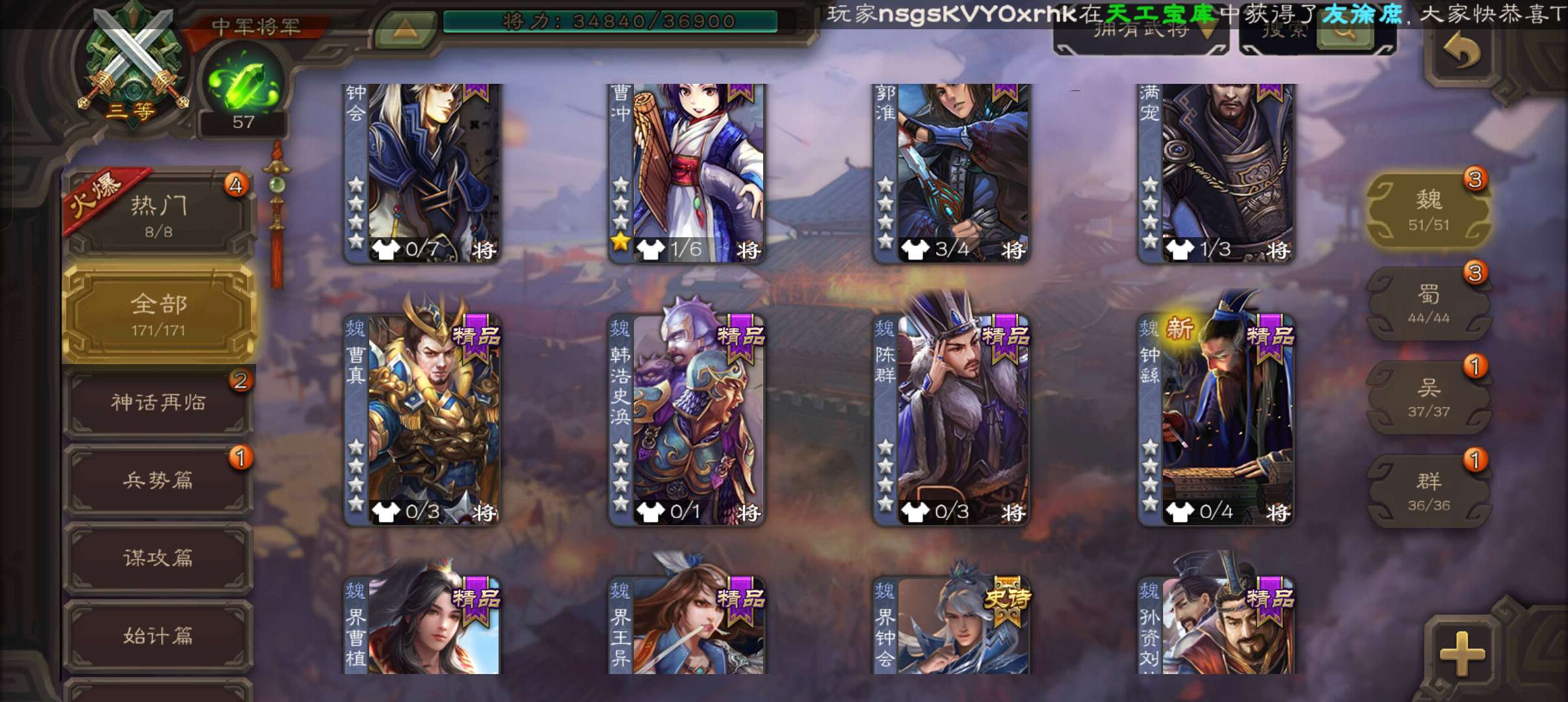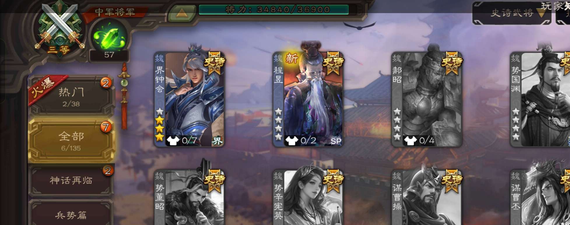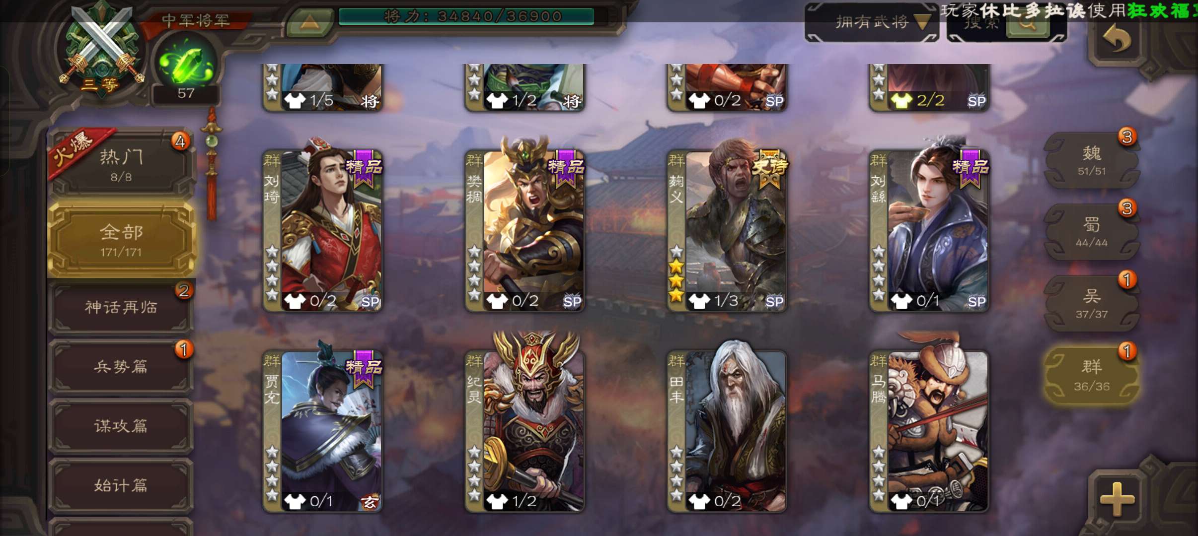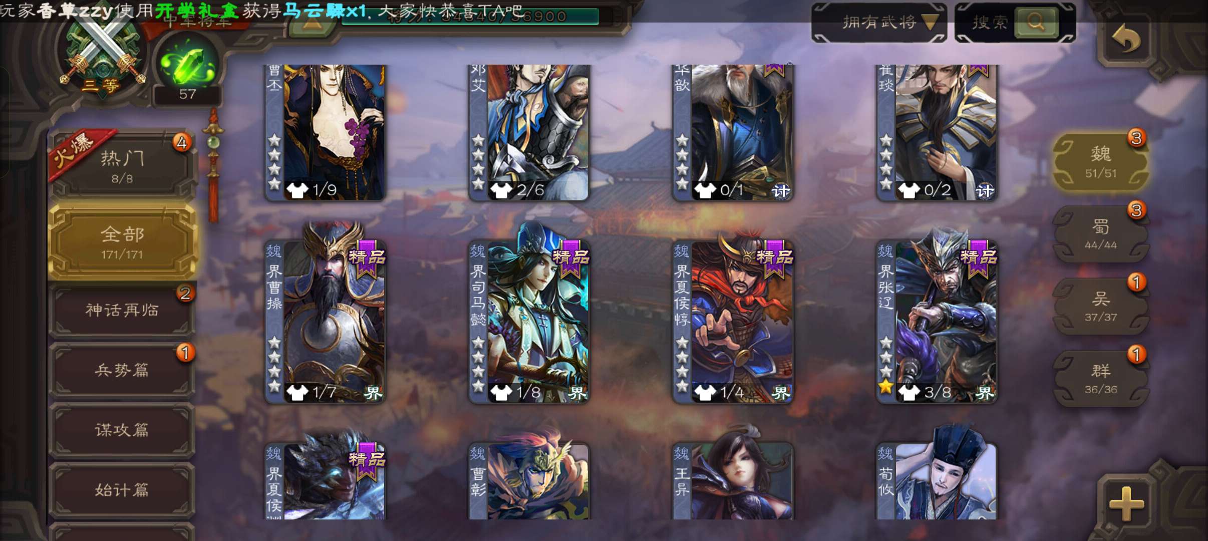 中军将军,8万羽毛7万豆,回廊动白马神赵云神吕布界钟会花鬘程昱6史诗,动态诸葛果神吕蒙谋高顺171将