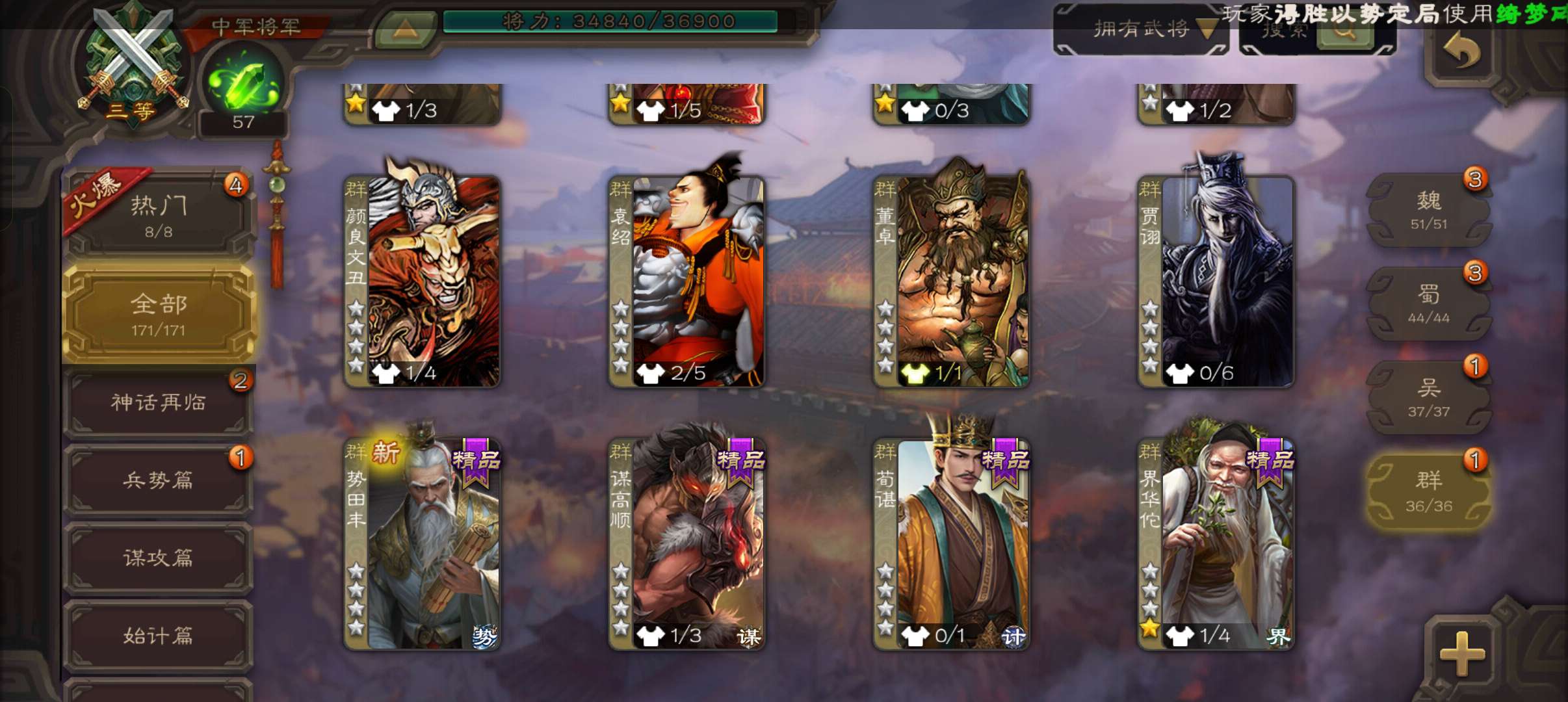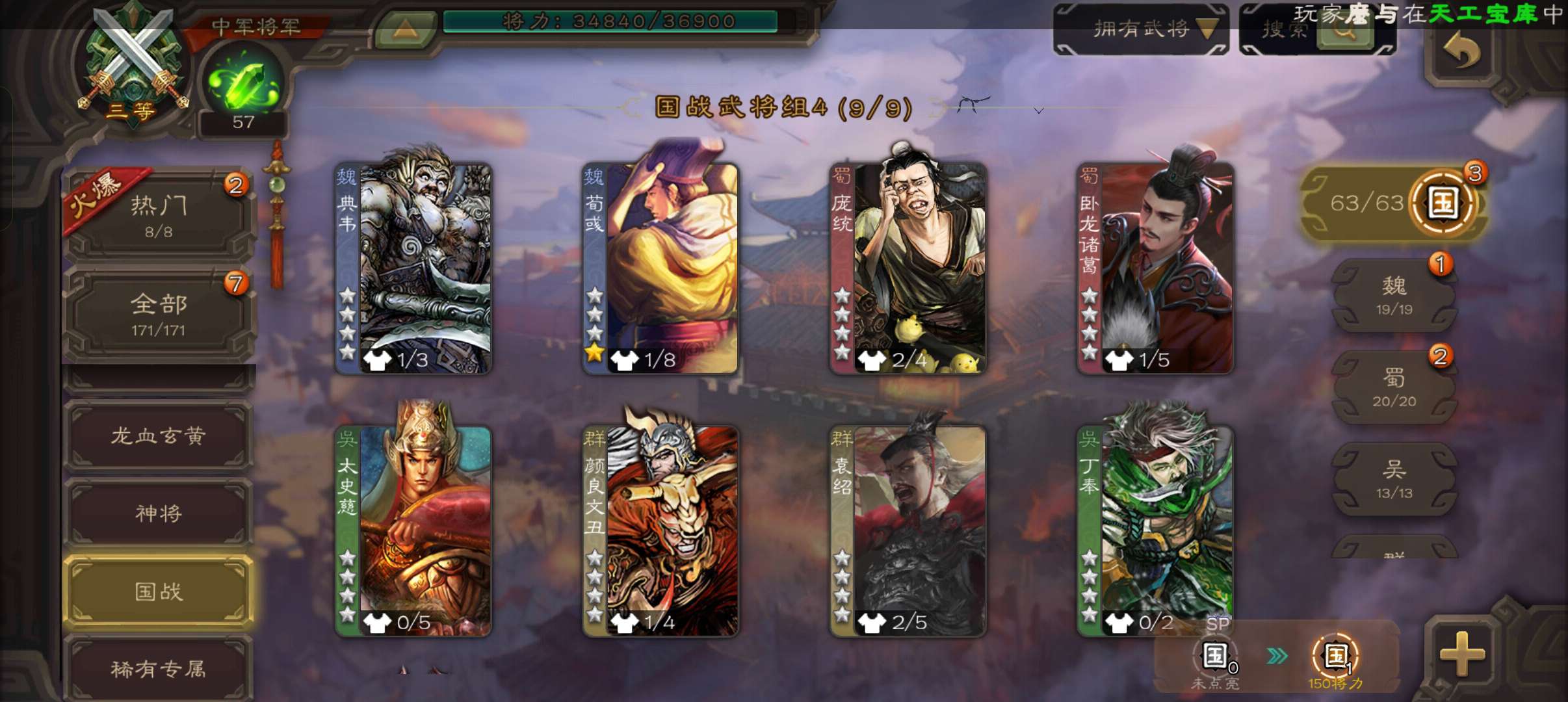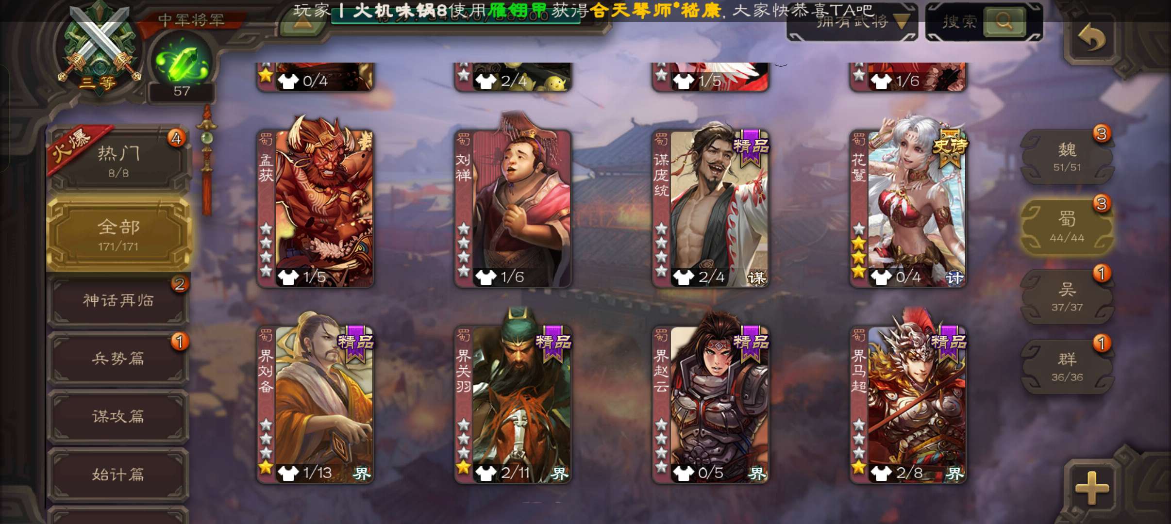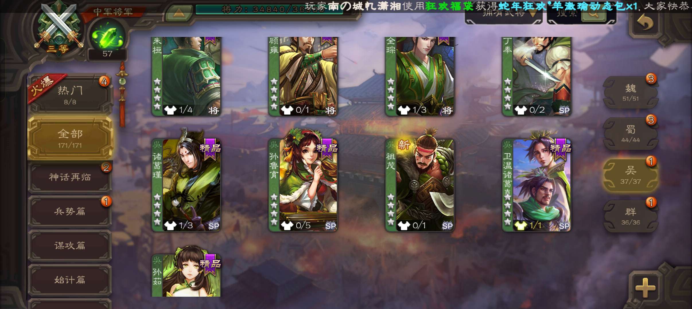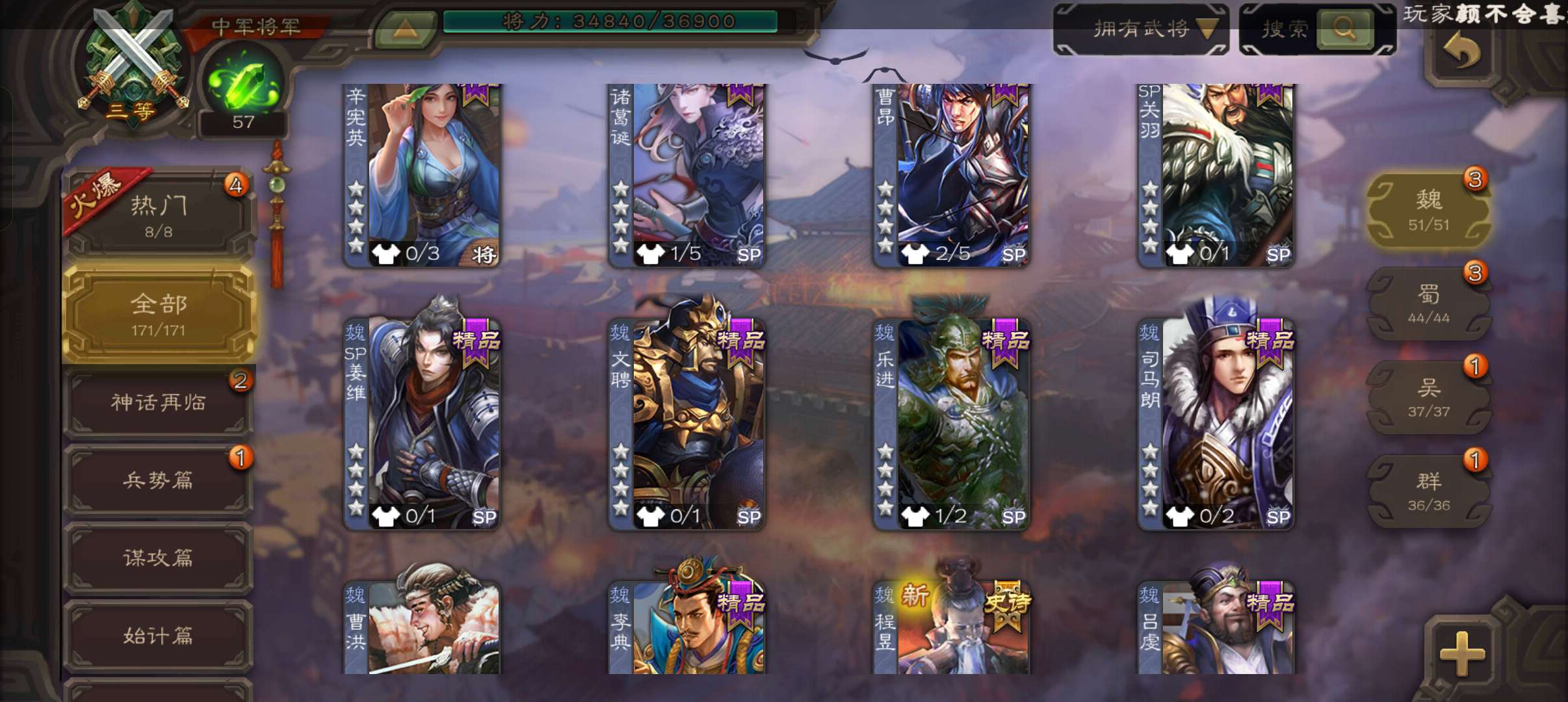 中军将军,8万羽毛7万豆,回廊动白马神赵云神吕布界钟会花鬘程昱6史诗,动态诸葛果神吕蒙谋高顺171将