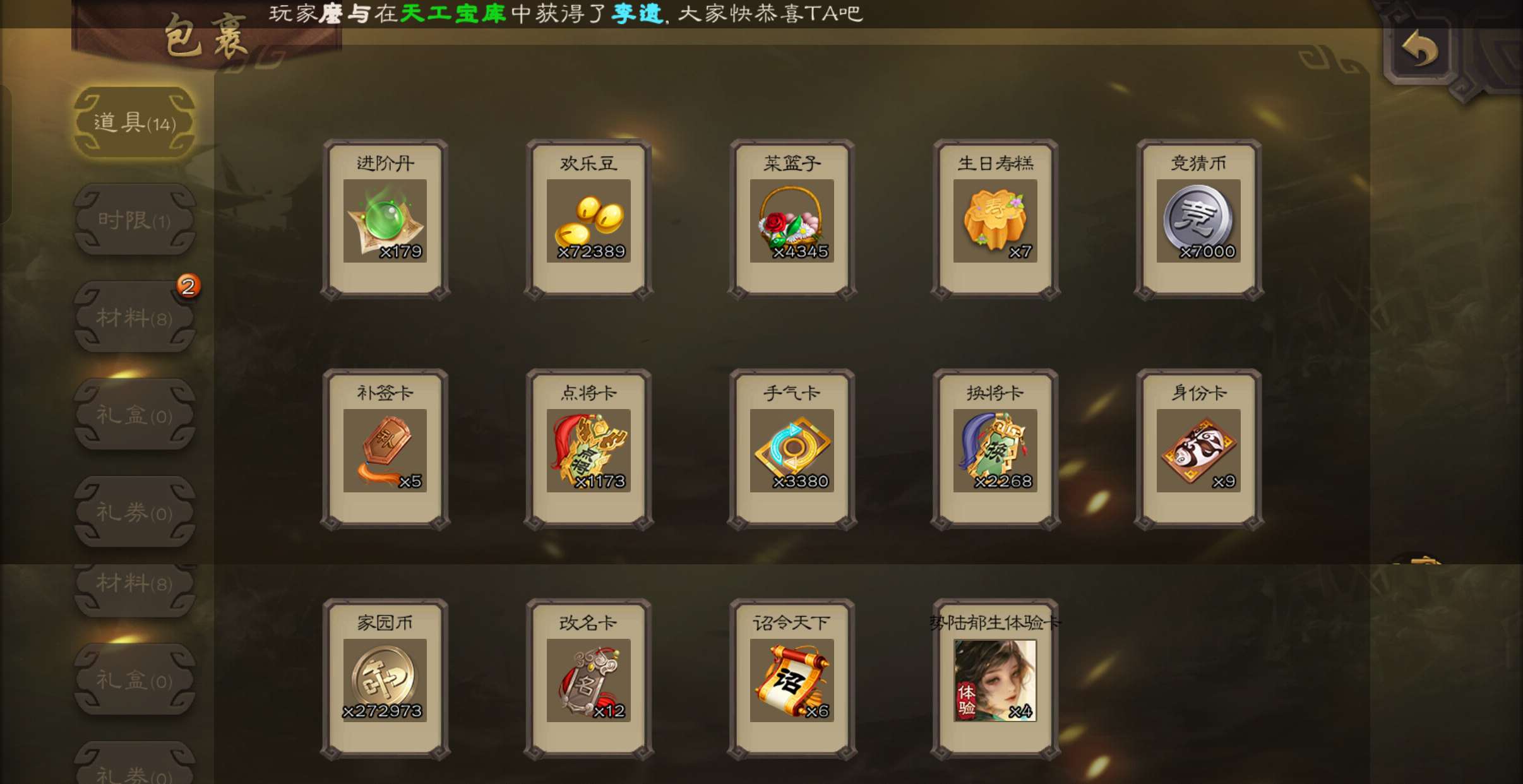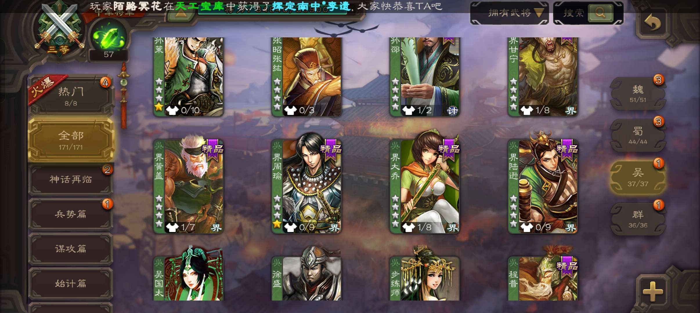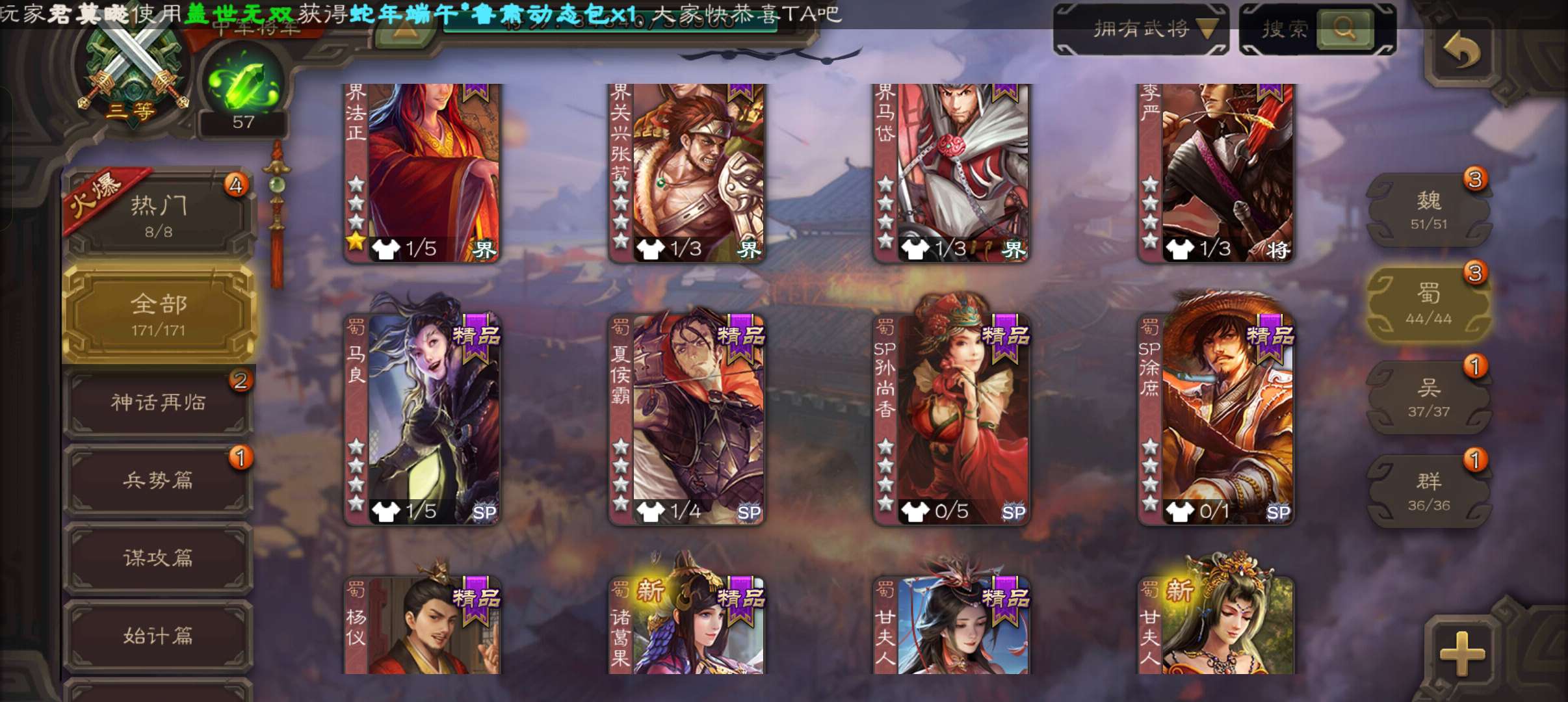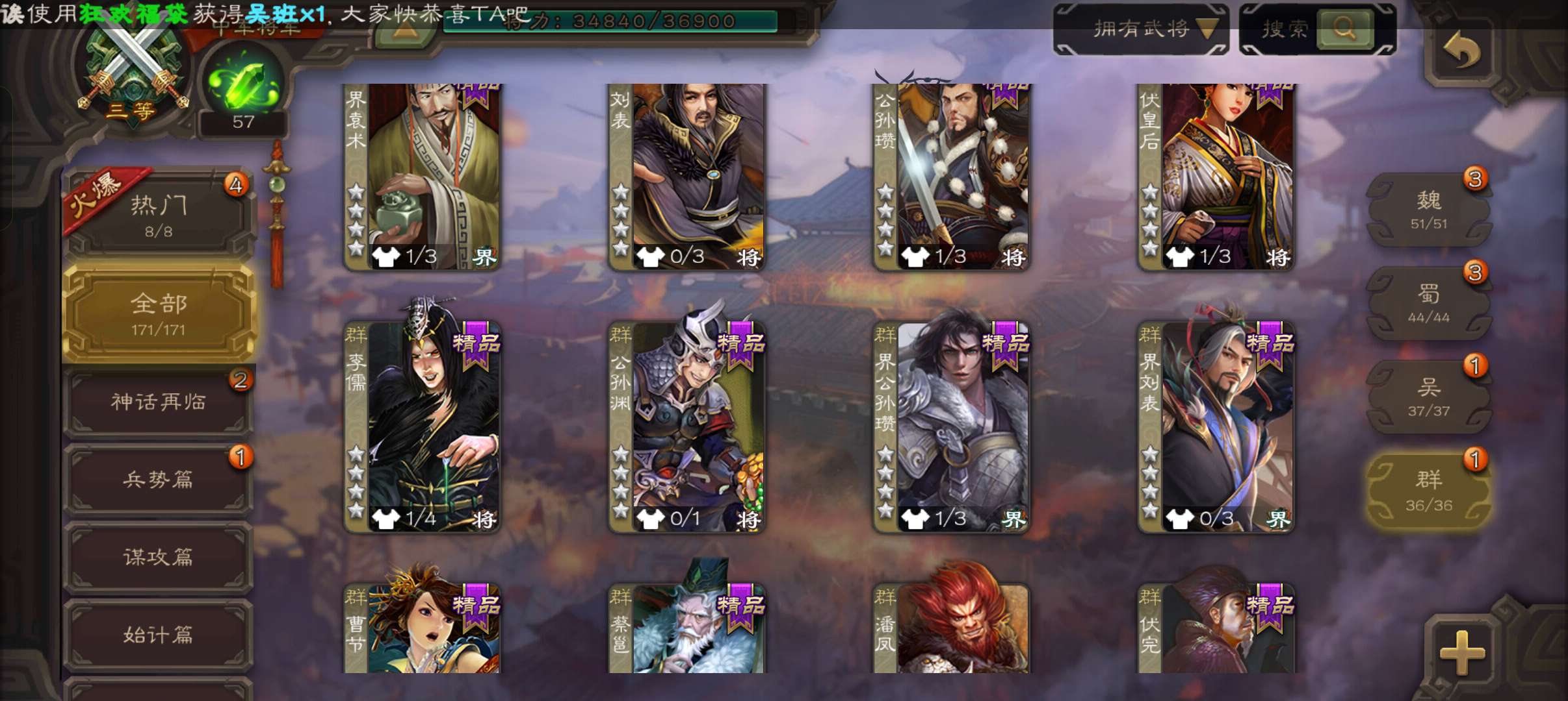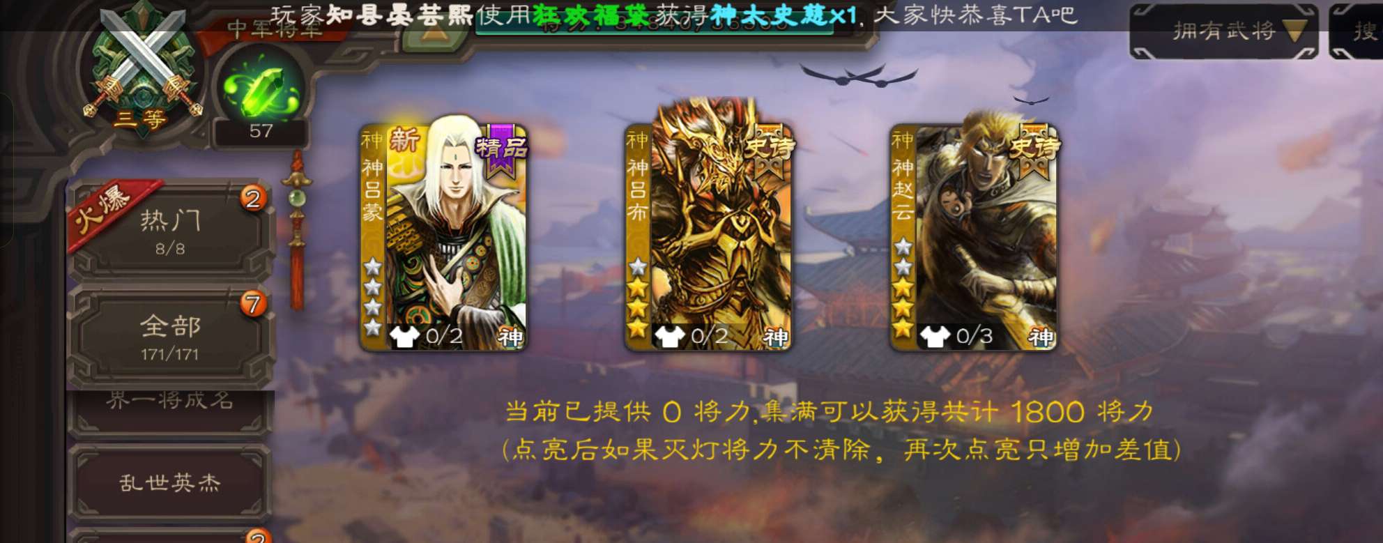 中军将军,8万羽毛7万豆,回廊动白马神赵云神吕布界钟会花鬘程昱6史诗,动态诸葛果神吕蒙谋高顺171将