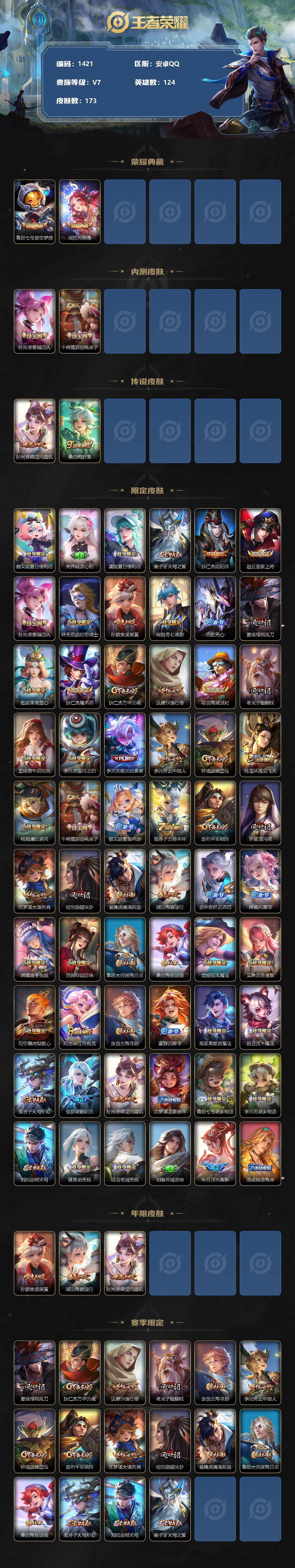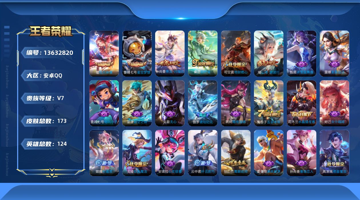 644-[13632820]安卓Q-V7-至尊星耀III段位-124英雄-173皮肤-2典藏-0珍品无双-0无双-0珍品传说-2传说-55史诗
