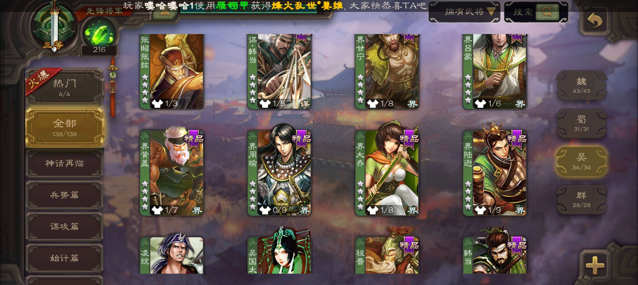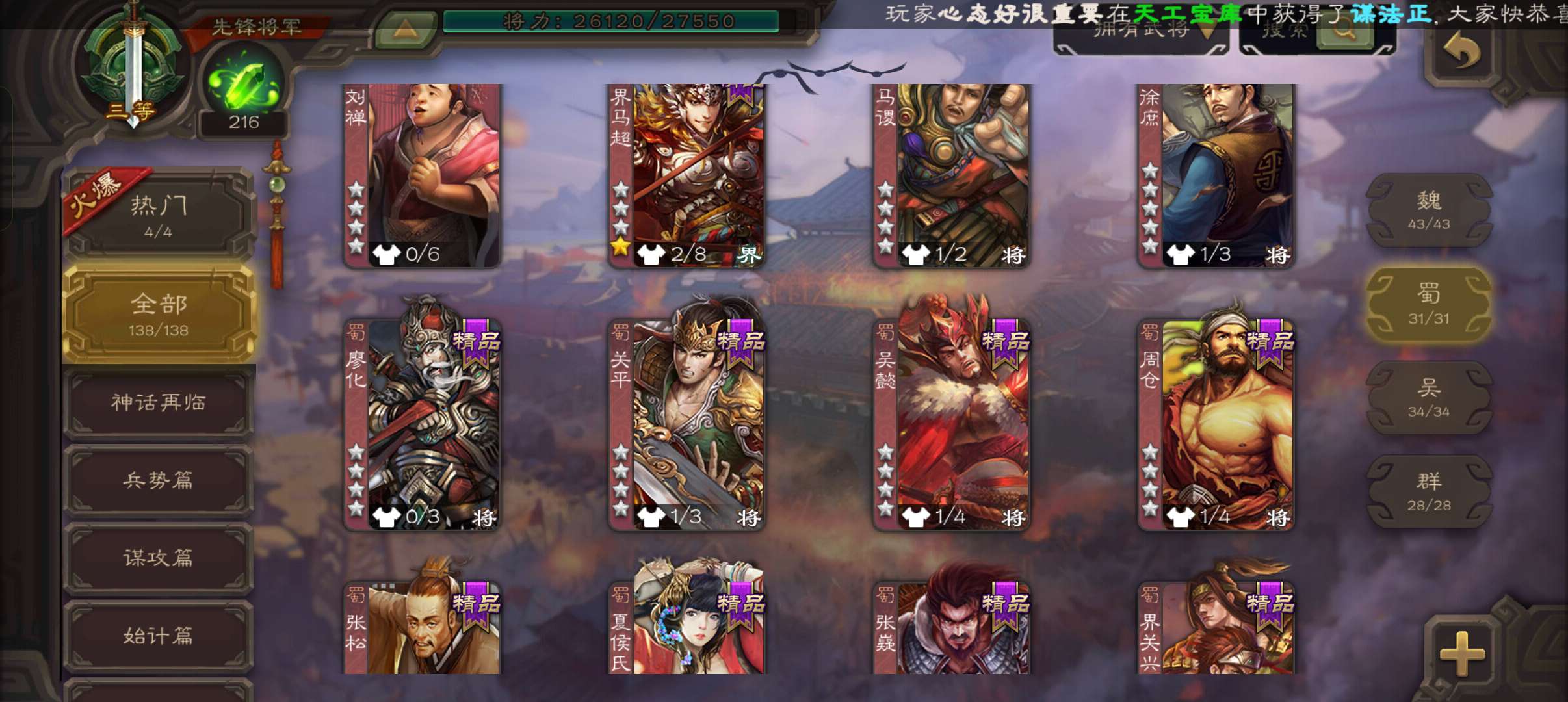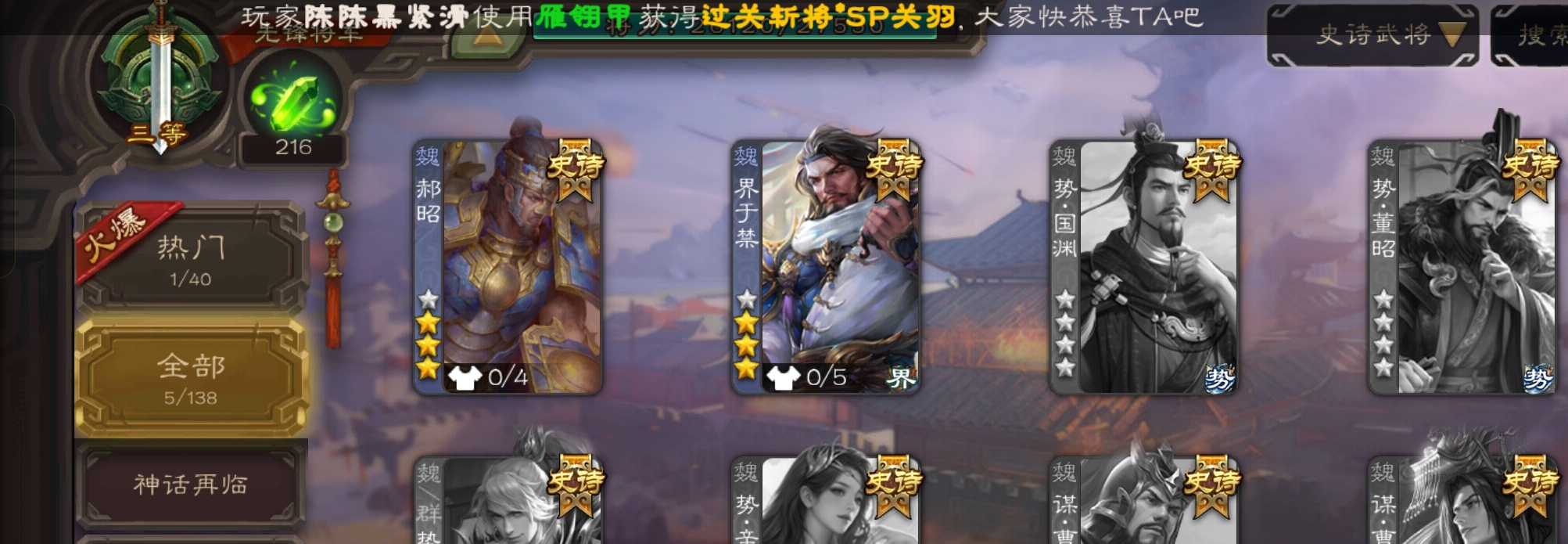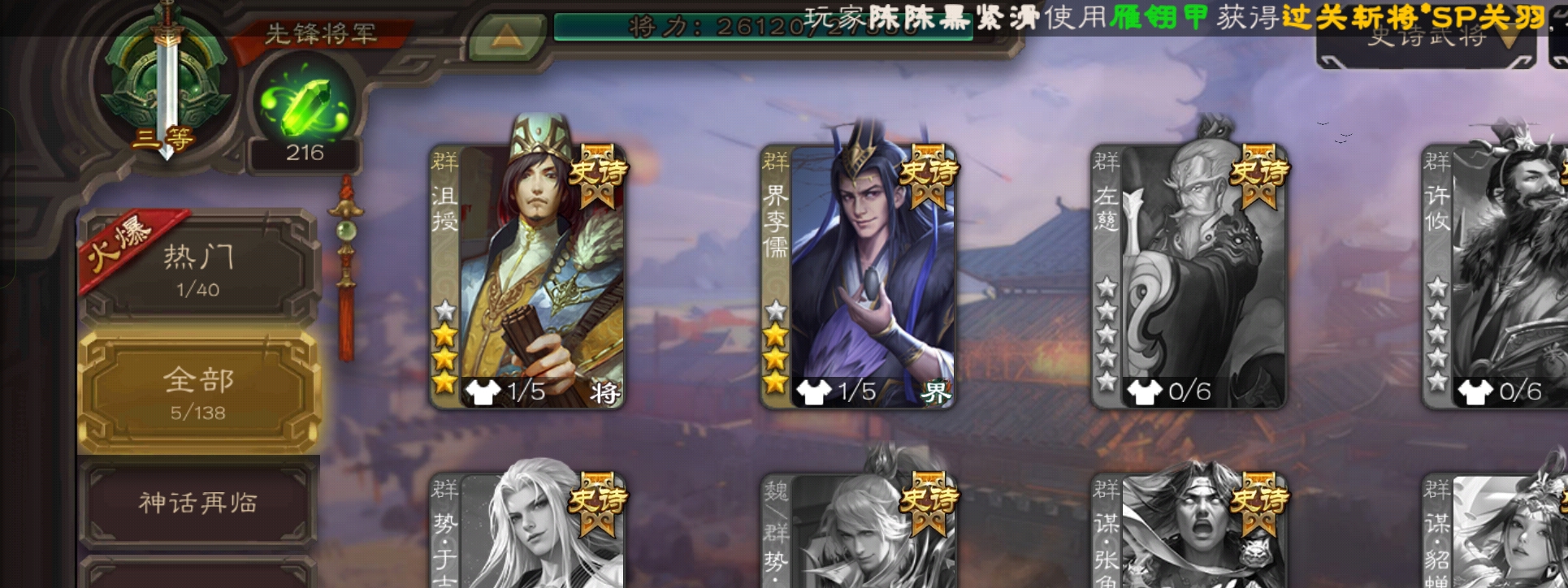 5史诗2神先锋,大宝界徐盛回廊界李儒沮授界于禁郝昭,天工李遗神吕蒙神周瑜动界曹植动界陆逊138将