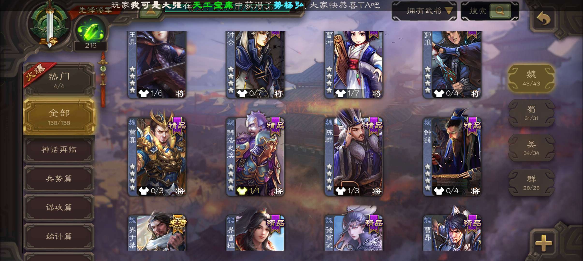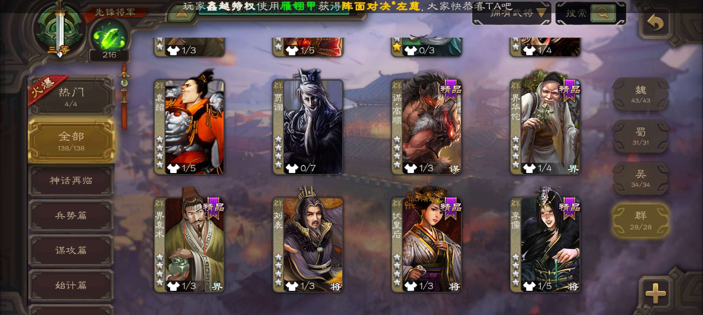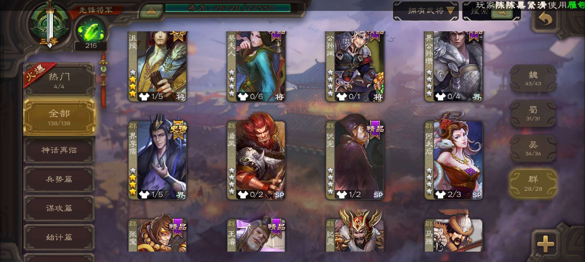 5史诗2神先锋,大宝界徐盛回廊界李儒沮授界于禁郝昭,天工李遗神吕蒙神周瑜动界曹植动界陆逊138将