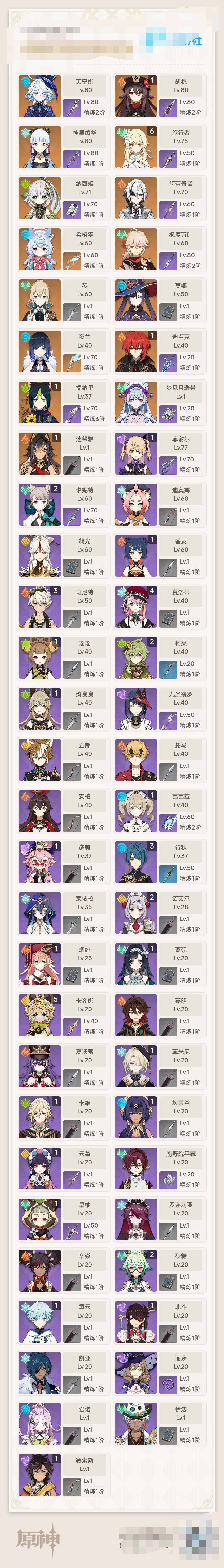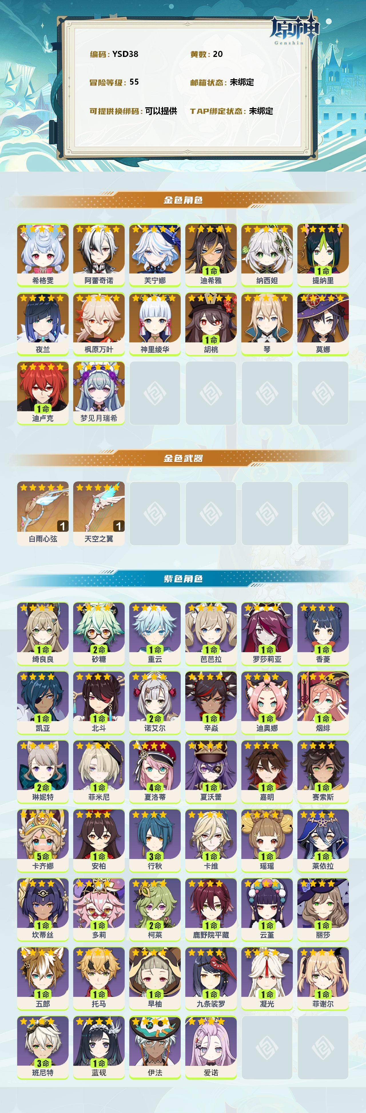 【YSD38】55级/20黄/女主/15个五星角色/2个五星武器/梦见月瑞希/希格雯/阿蕾奇诺/芙宁娜/1命迪希雅/纳西妲/1命提纳里/夜兰/神里绫华/枫原万叶/1命胡桃/琴/1命迪卢克/莫娜/白雨心弦/天空之翼/0命爱诺/0命伊法/1命蓝砚/5命卡齐娜/1命赛索斯/嘉明/夏沃蕾/4命夏洛蒂/1命菲米尼/2命琳妮特/1命绮良良/1命卡维/1命瑶瑶/莱依拉/1命坎蒂丝/1命多莉/2命柯莱/鹿野院平藏/1命云堇/0命五郎/0命托马/0命九条裟罗/1命早柚/1命烟绯/罗莎莉亚/辛焱/迪奥娜/2命砂糖/