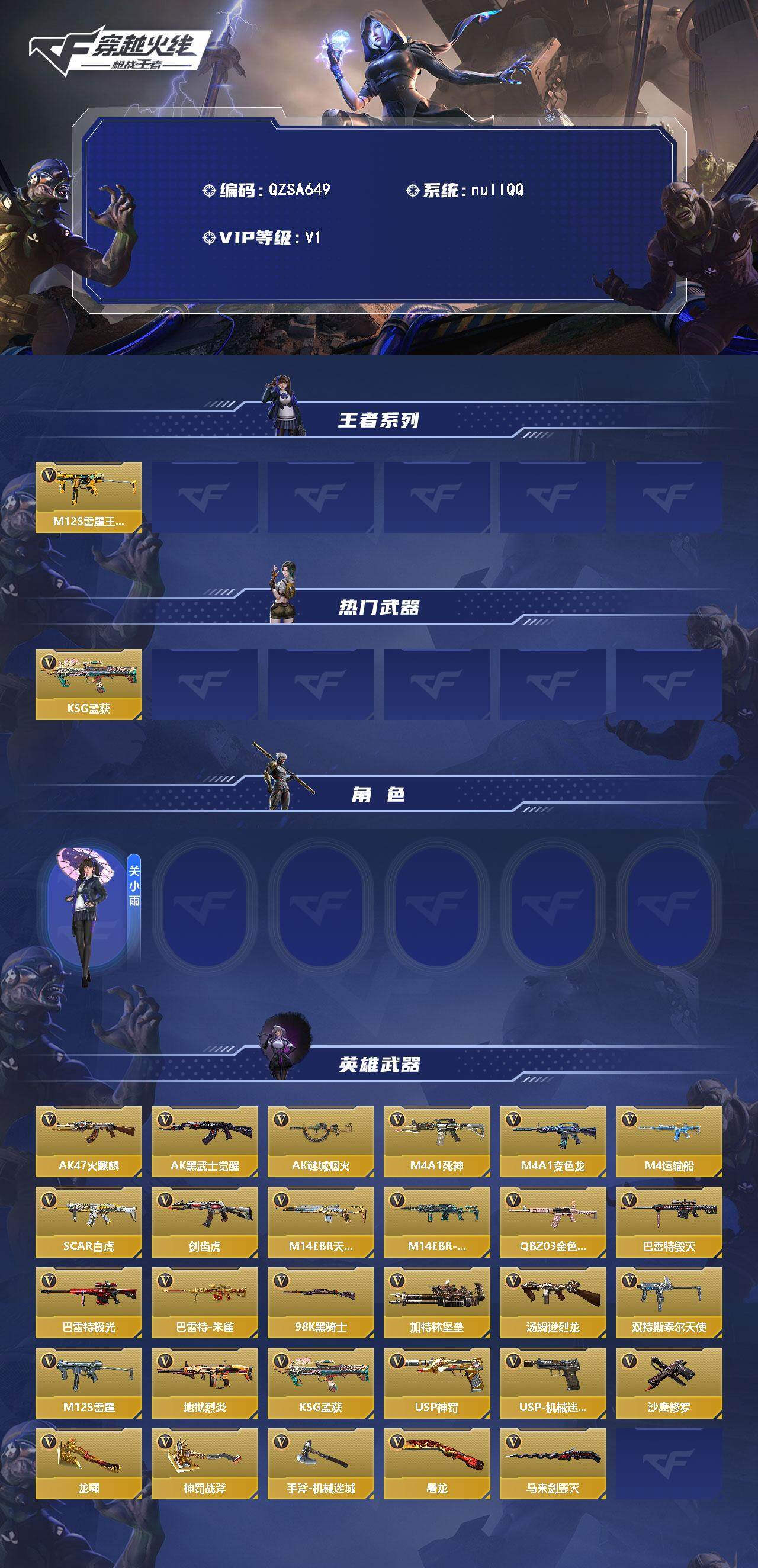 【QZSA649】VIP1/62V/1王者/M12S-雷霆王者/KSG-孟获/关小雨/AK47-火麒麟/AK47-黑武士觉醒/AK47-谜城烟火/M4A1-死神/M4A1-变色龙/M4A1-运输船/SCAR Light-白虎/剑齿虎/M14EBR-天神/M14EBR-玄武/QBZ03-金色蔷薇/巴雷特-毁灭/巴雷特-极光/巴雷特-朱雀/98K-黑骑士/加特林-堡垒/汤姆逊烈龙/双持斯泰尔-天使/M12S-雷霆/地狱烈炎/USP-神罚/USP-机械迷城/沙鹰-修罗/龙啸/神罚战斧/手斧-机械迷城/