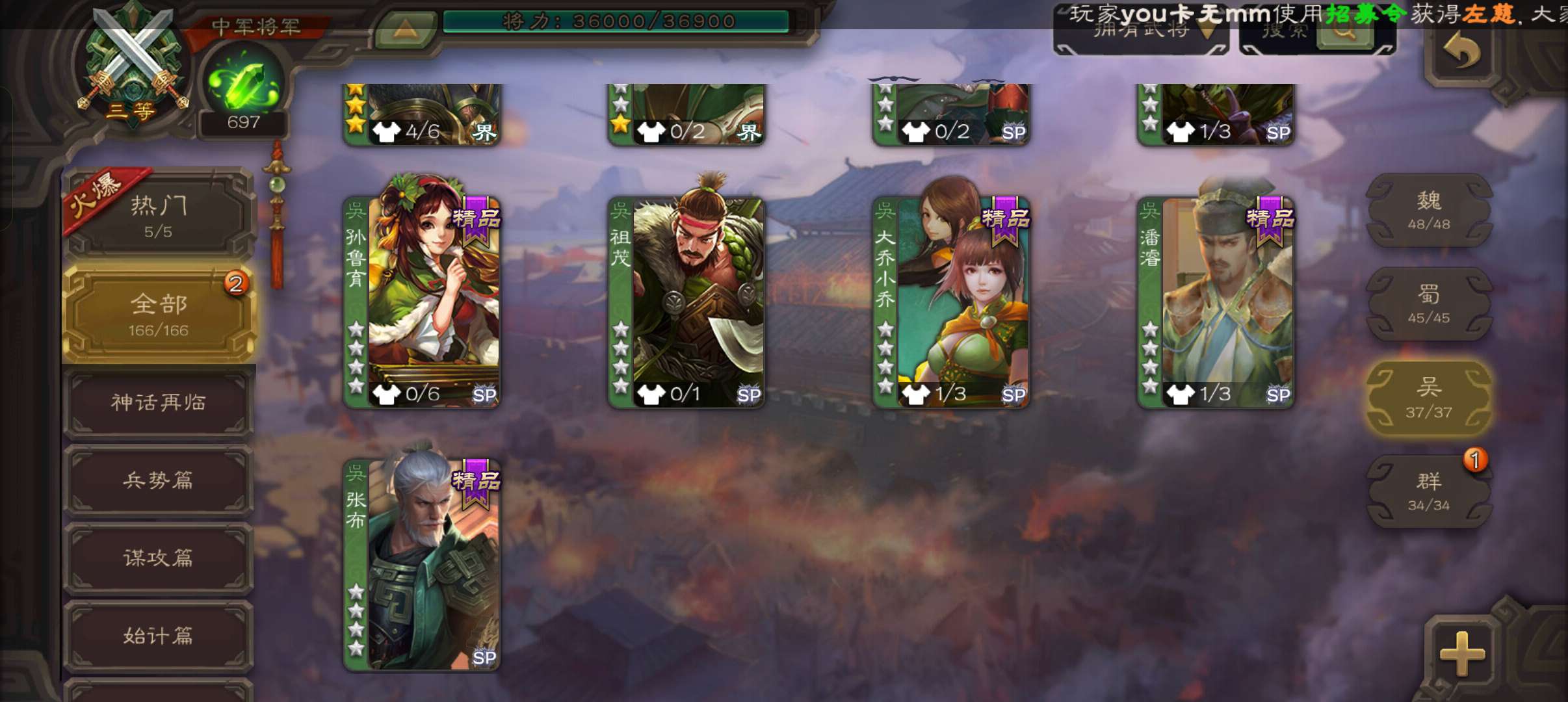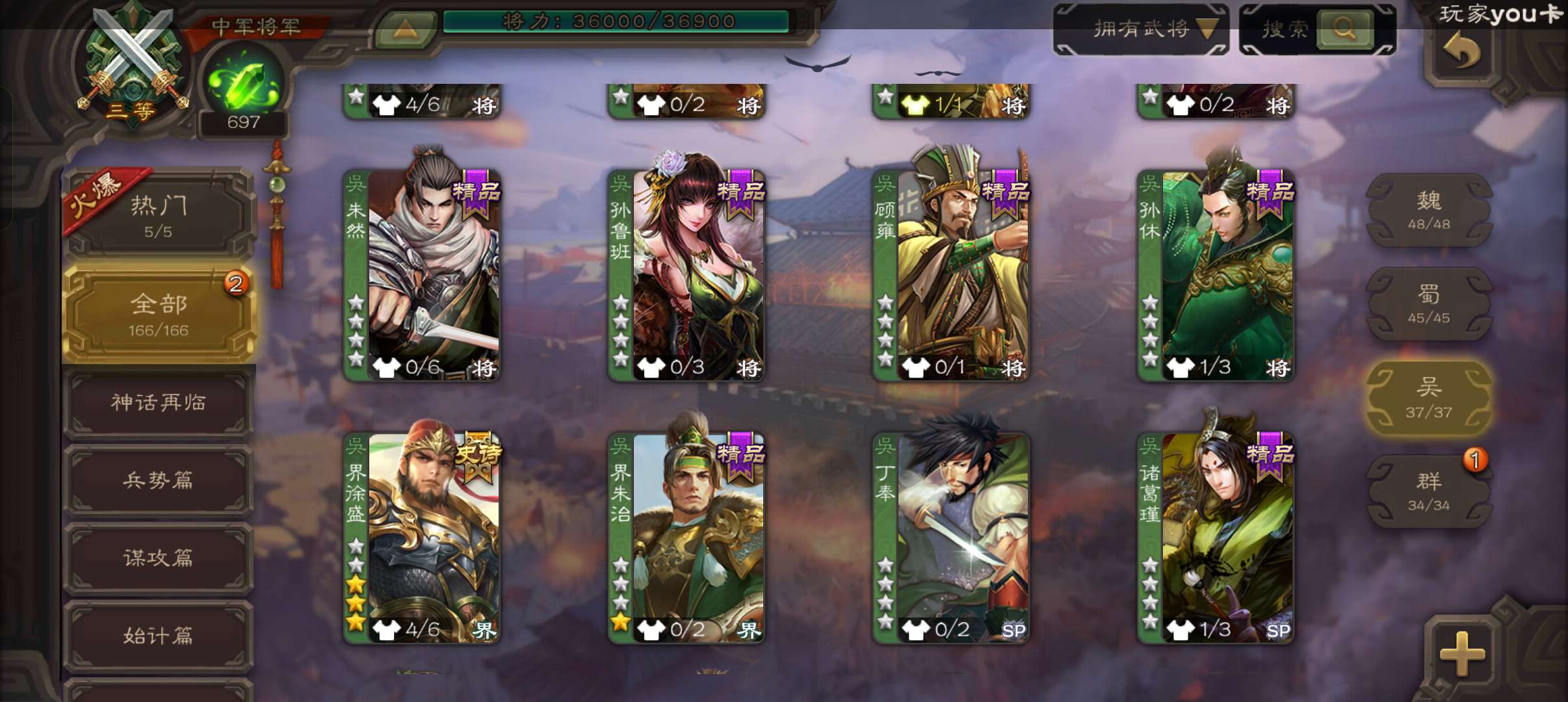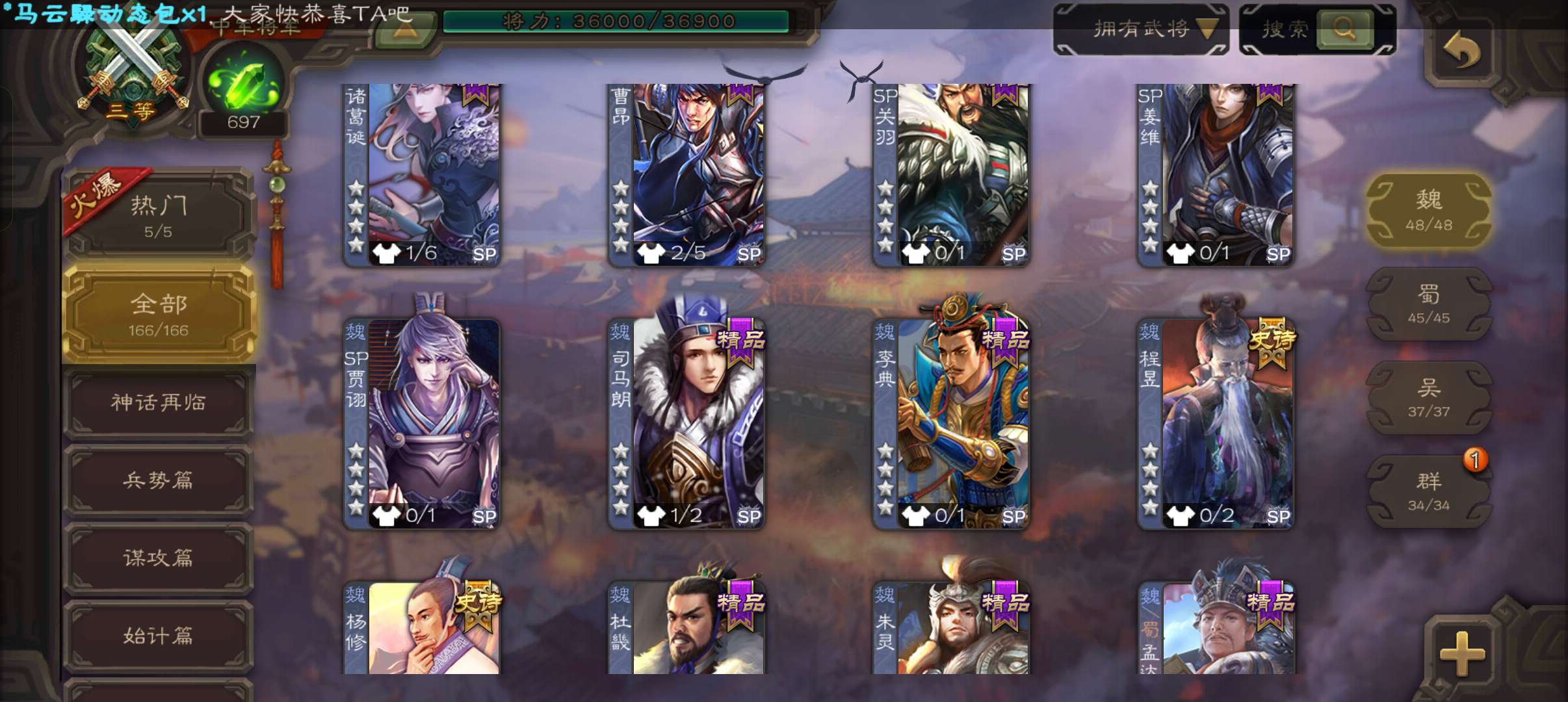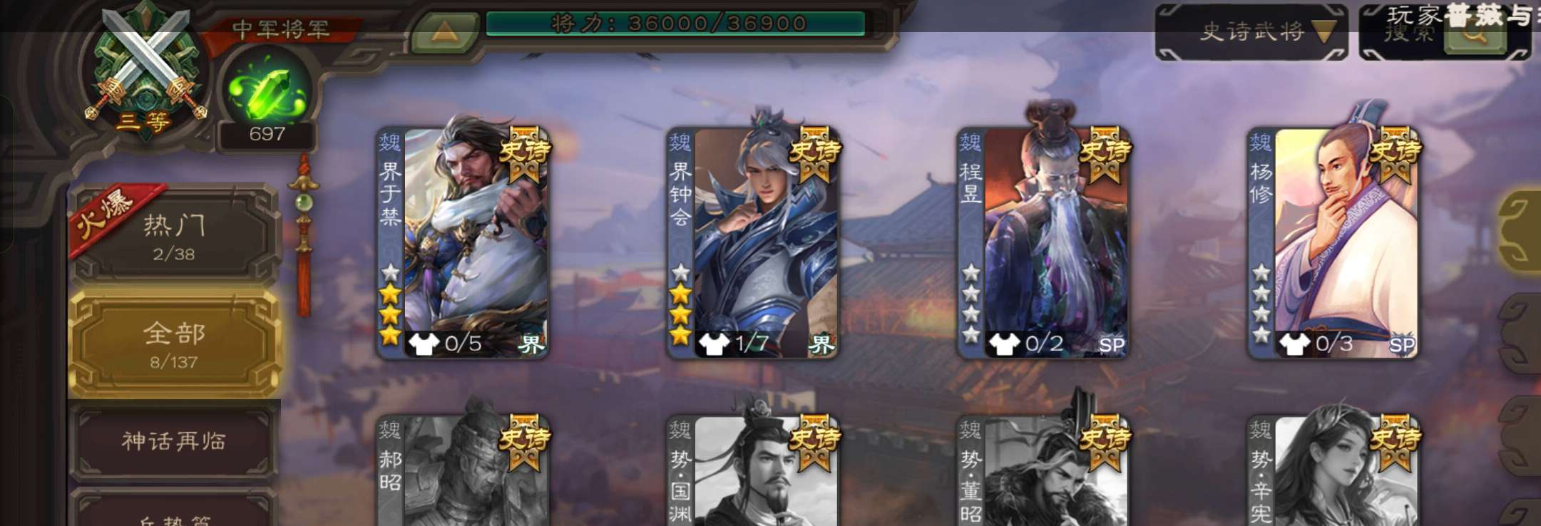 8史诗3神中军,6万豆,回廊动大宝神吕布界钟会沙摩柯谯周界于禁杨修程昱,神周瑜神吕蒙动界荀彧166将