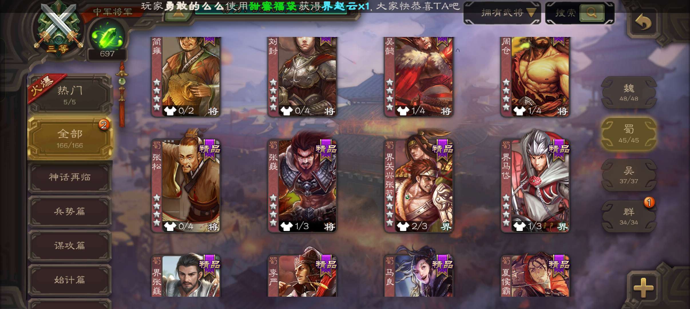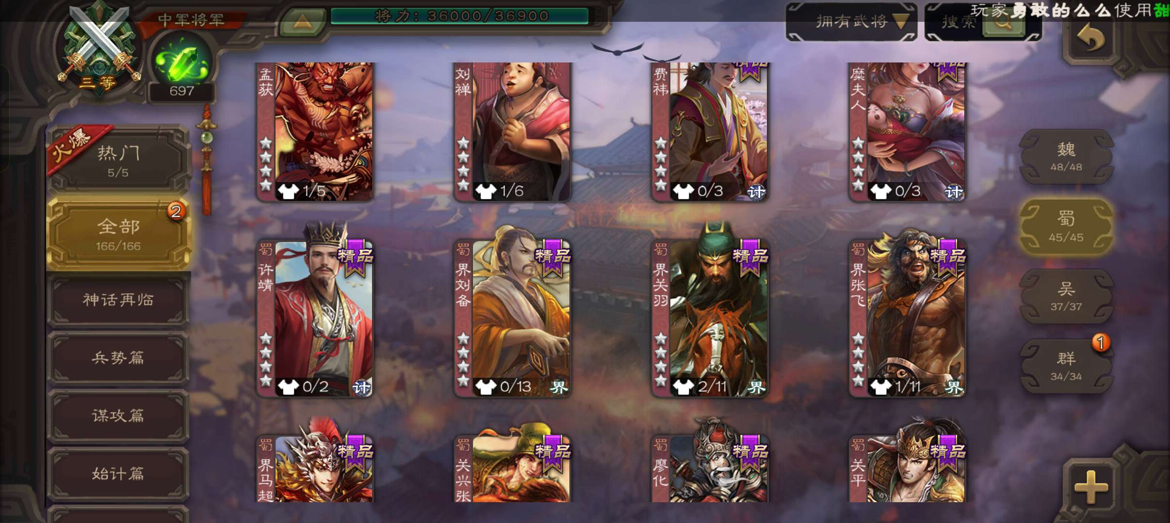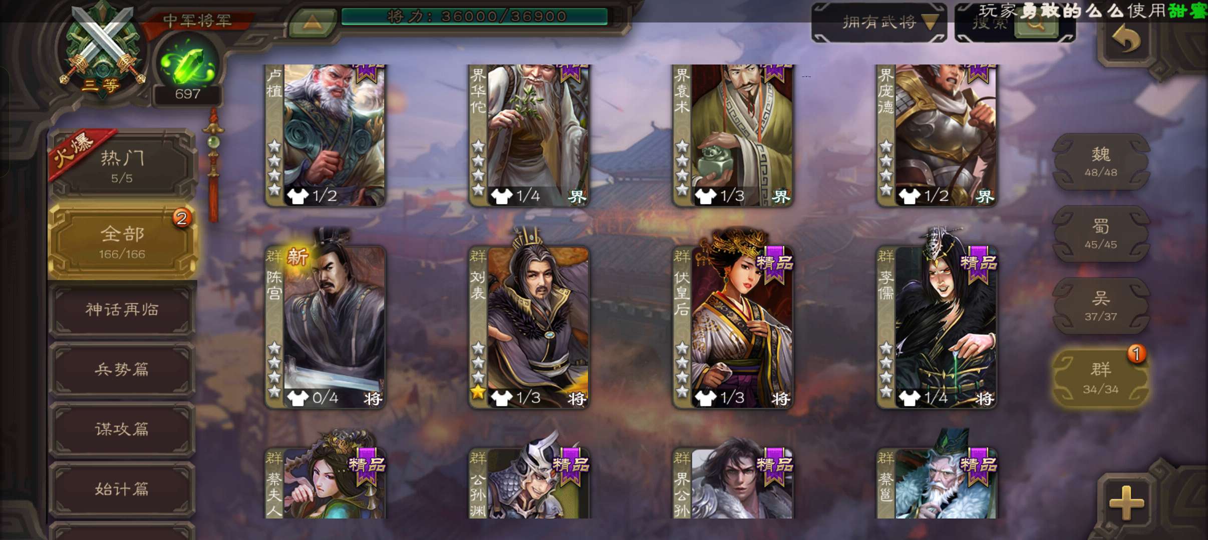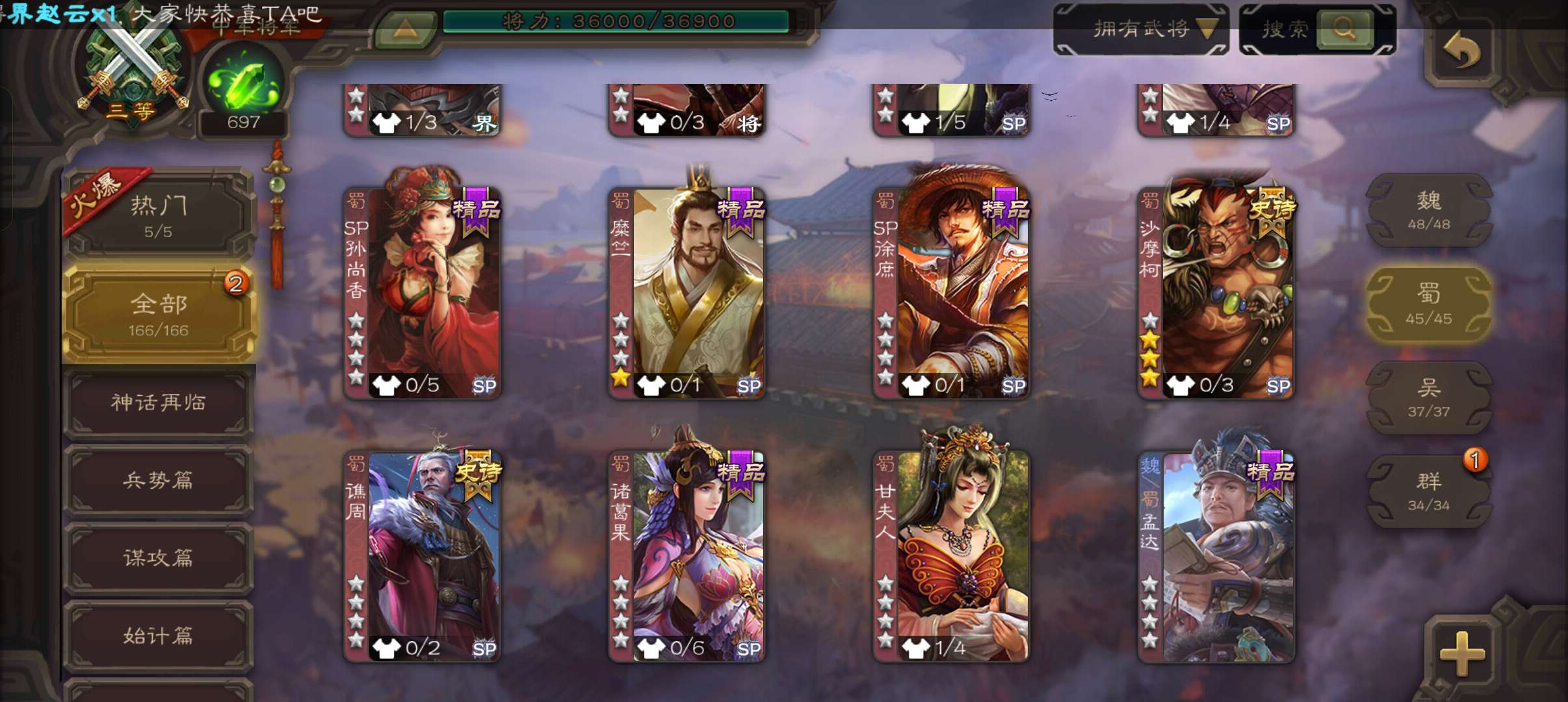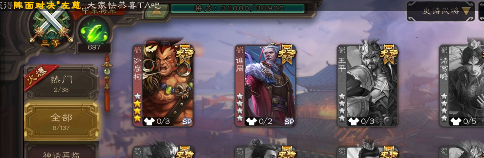 8史诗3神中军,6万豆,回廊动大宝神吕布界钟会沙摩柯谯周界于禁杨修程昱,神周瑜神吕蒙动界荀彧166将