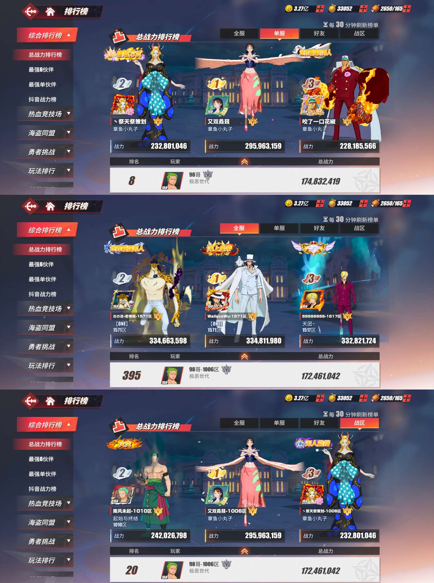 8神船1.74亿战全服395,6星凯多,和佐,明哥,青年卡普,新世界娜美等5星乌塔,魔神山治,奎因,