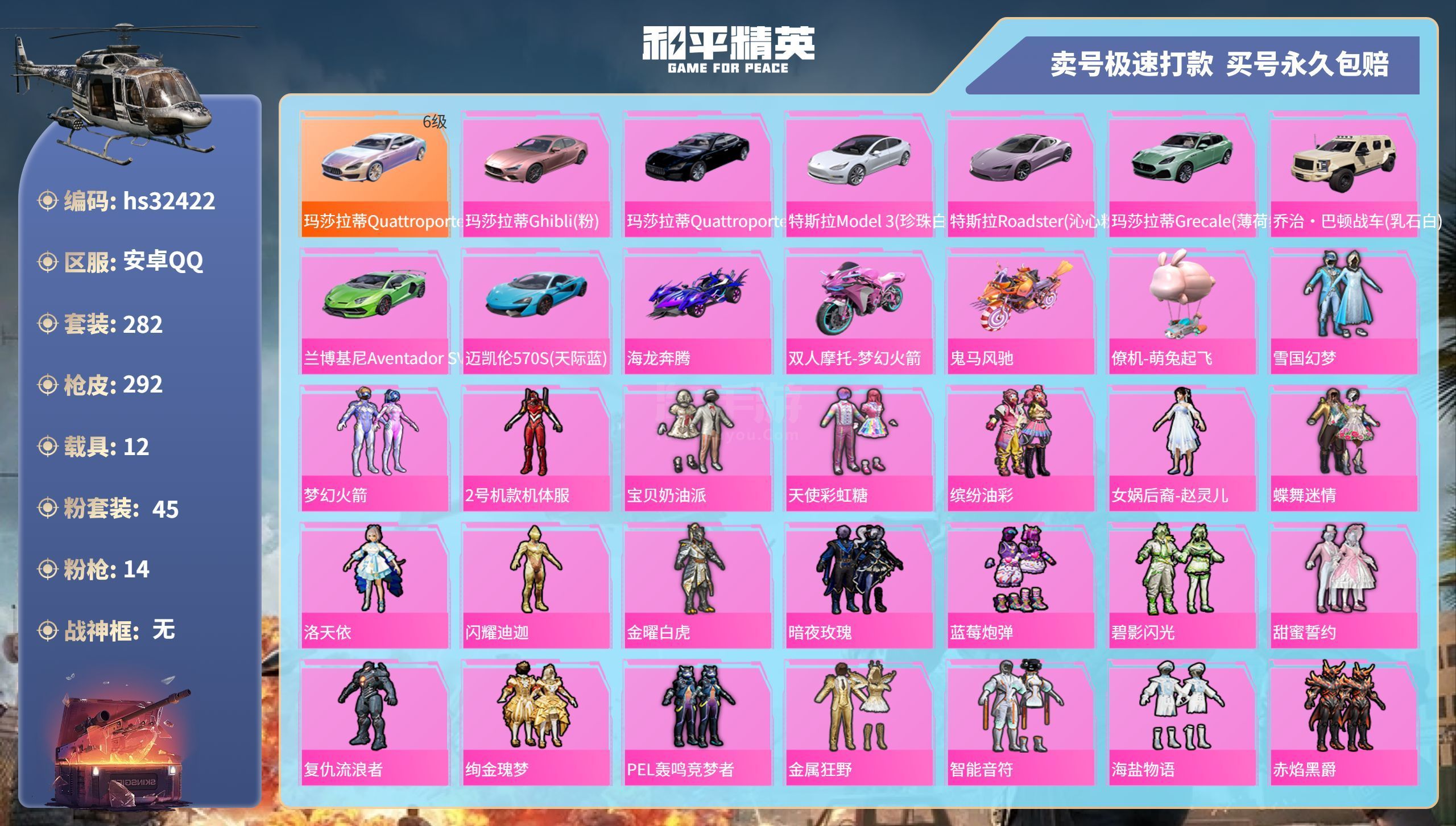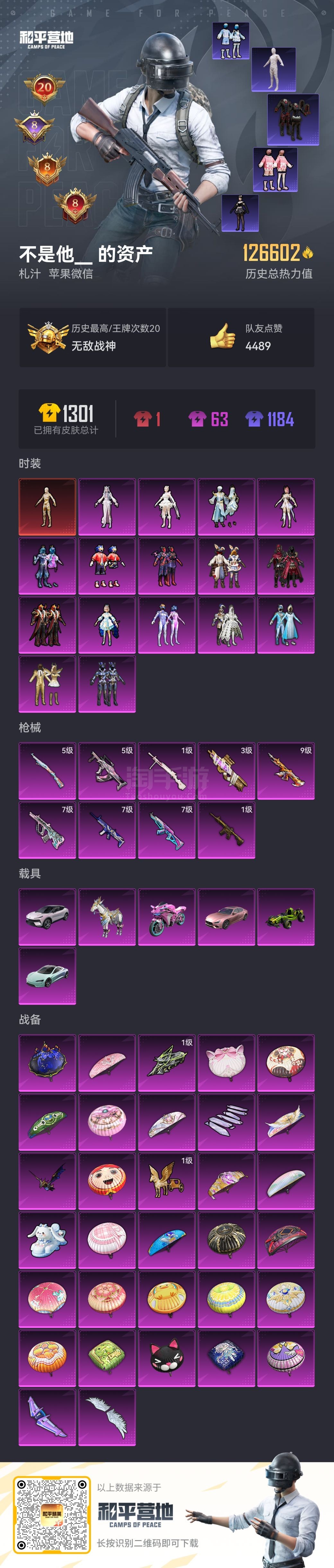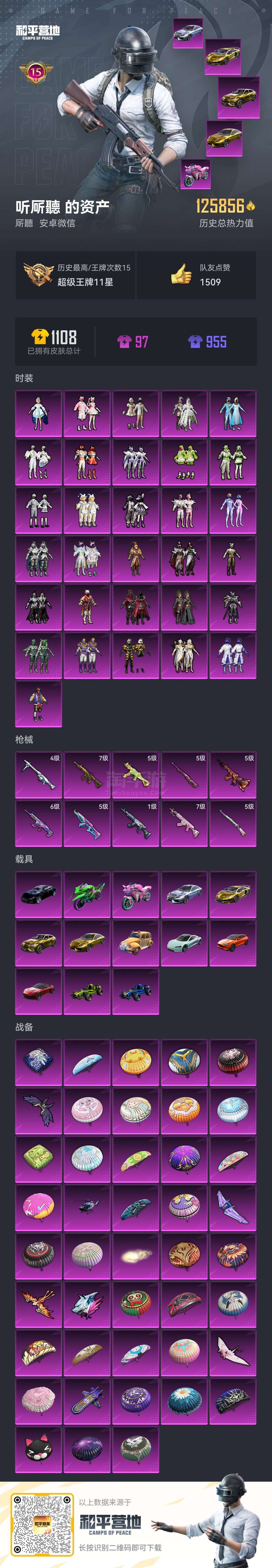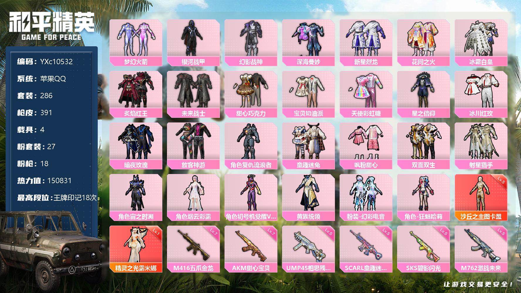 热力值:121335,2神装,33粉装,12粉枪,7载具,