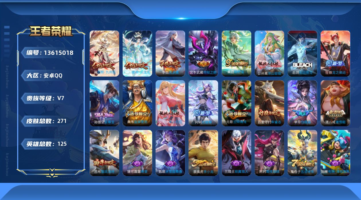 营地账号:431690039/【13615018】[13615018]实名: 可修改 贵族等级: V7 英雄数: 125 皮肤数: 271 传说皮: 地狱之眼 限定皮: 遇见飞天,李小龙,梁祝,御风骁将,白晶晶,凤求凰,瑞麟志,朱雀志,至尊宝,霸王别姬-虞姬,高山流水,猪悟能,五谷丰年,鸣野蒿,愿照·众生和,愿照·九州拓 亮点: 【精品号手慢无】v7对抗路练手小号,对抗路25段,消耗任意点券恢复
