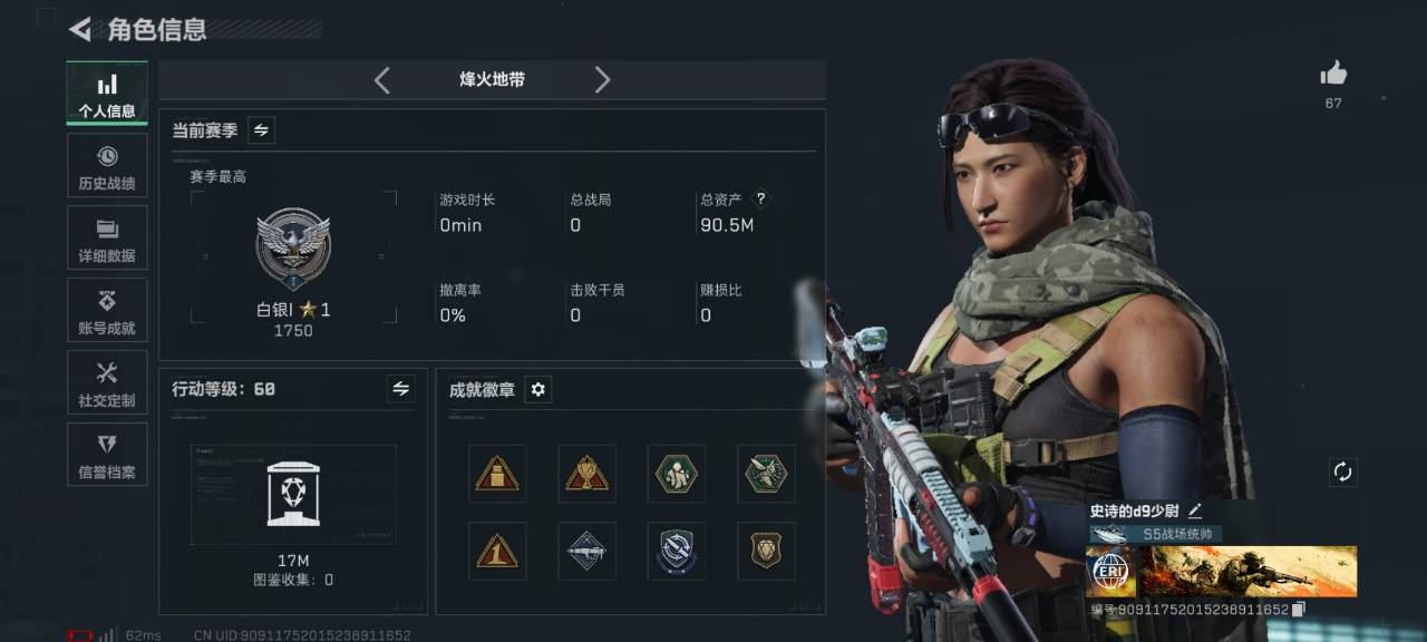 个人信息:行动等级:60级 烽火段位:白银哈夫币:12498k总资产:90.5M货币:220三角币 0曼德尔币 17三角券安全箱:基础安全箱通行证:通行证免费版1级特勤处:仓库LV.8,指挥中心LV.3,训练中心LV.4,靶场LV.4,潜水中心LV.1,收藏室LV.2角色皮肤:露娜黑天际线,蜂医送葬人无题密令,深蓝不破誓约近战皮肤:近战武器-黑鹰 典藏外观:M4A1突击步枪-棱镜攻势(优品C),