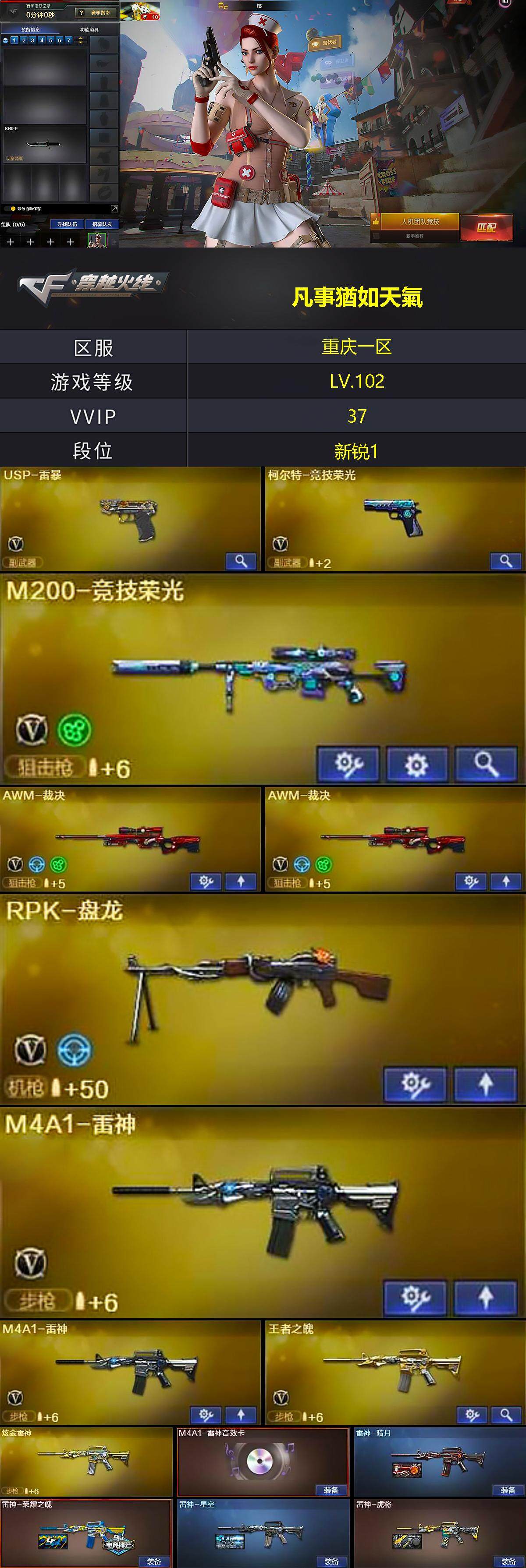 【热门武器】:HK417-朱雀,M200-竞技荣光,M4A1-黑骑士*2,RPK-盘龙,加特林-炼狱,USP-雷暴,沙鹰-修罗