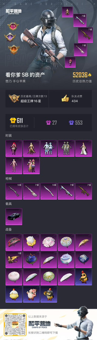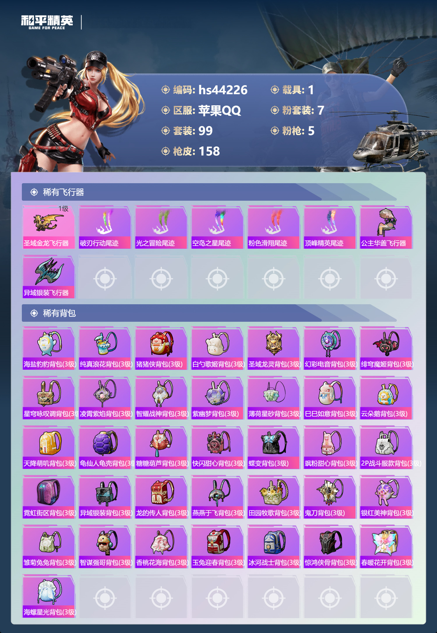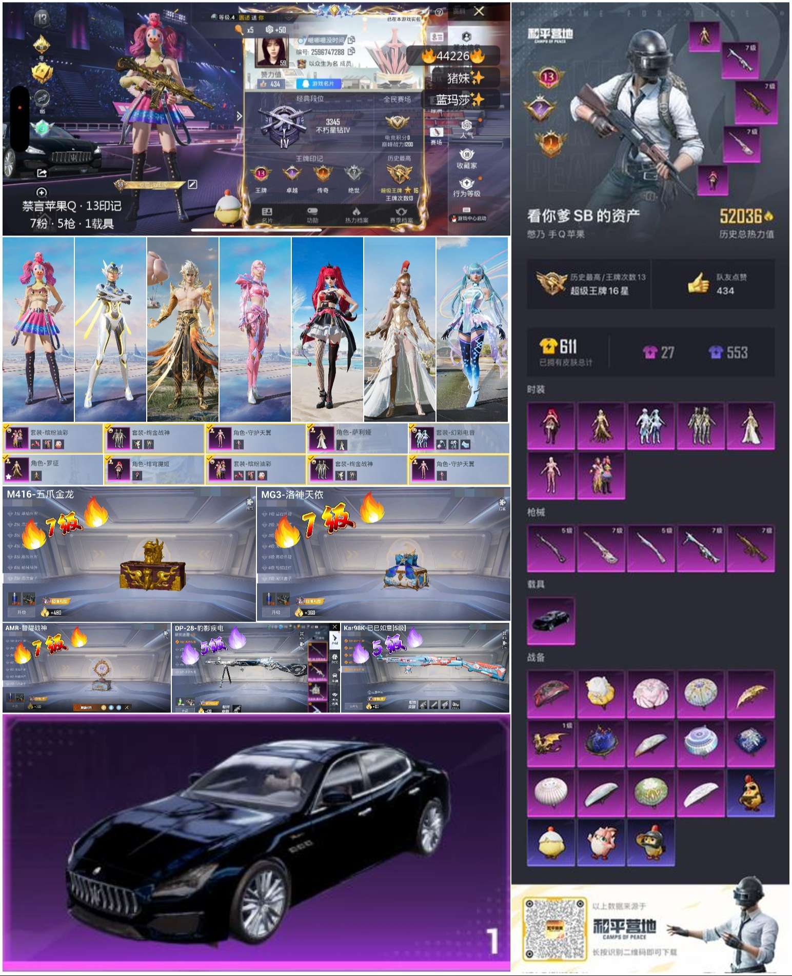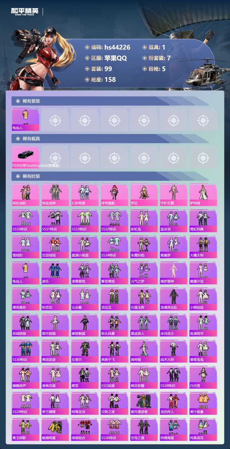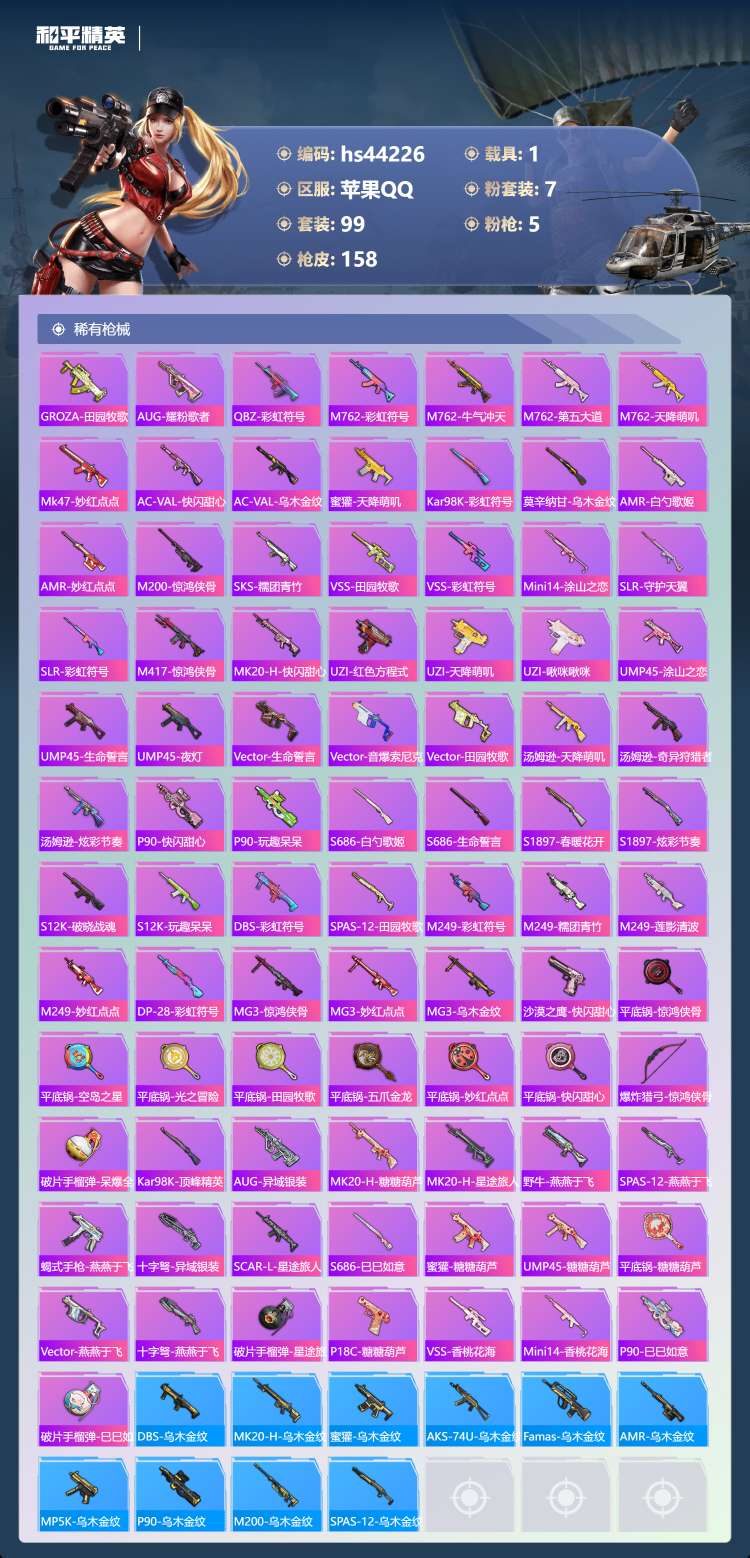 hs44226 苹果手Q-13王牌印记-7粉装-5特效枪-1载具-52086热力值-99套装-158