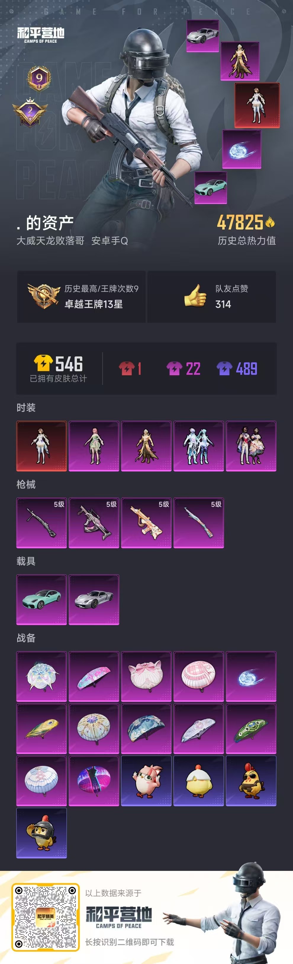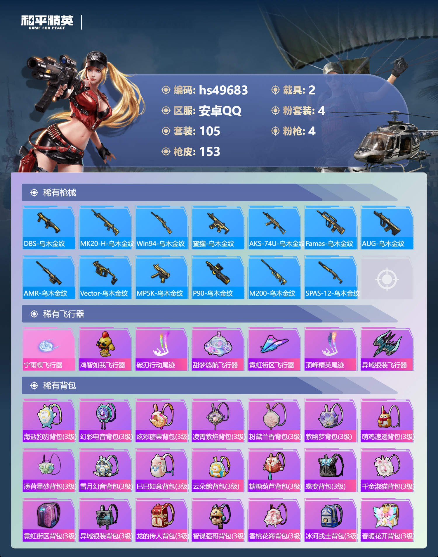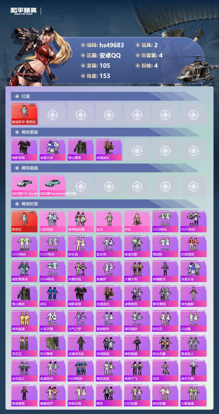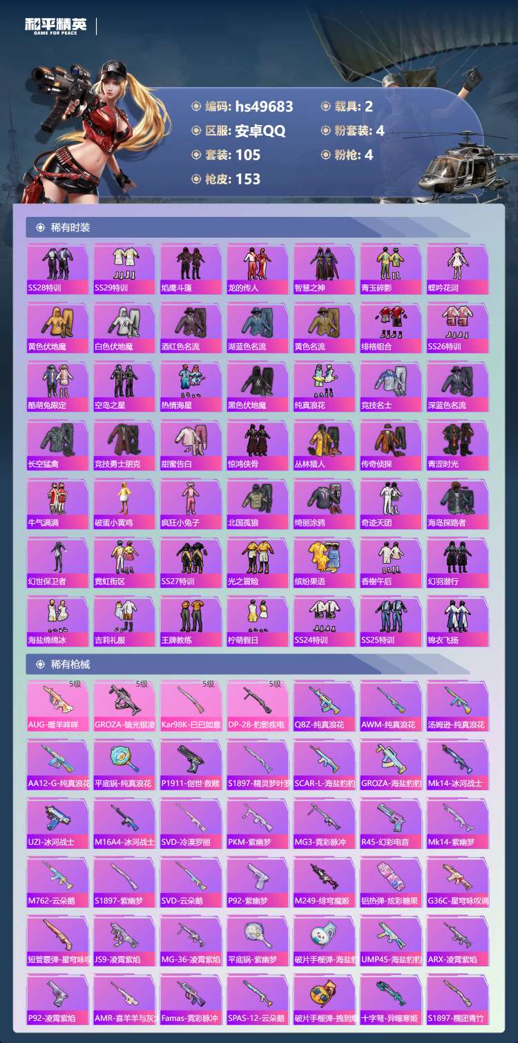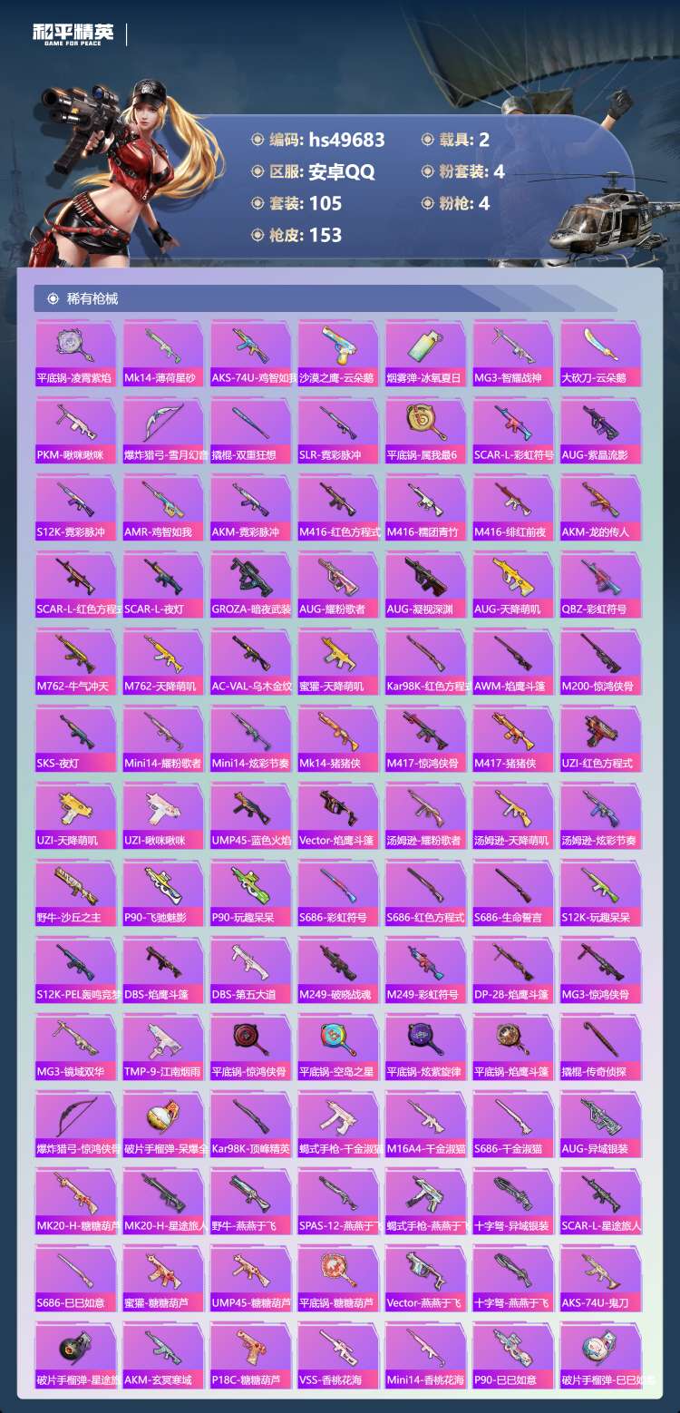 hs49683 安卓手Q-9王牌印记-1红装-4粉装-4特效枪-2载具-47825热力值-105套装