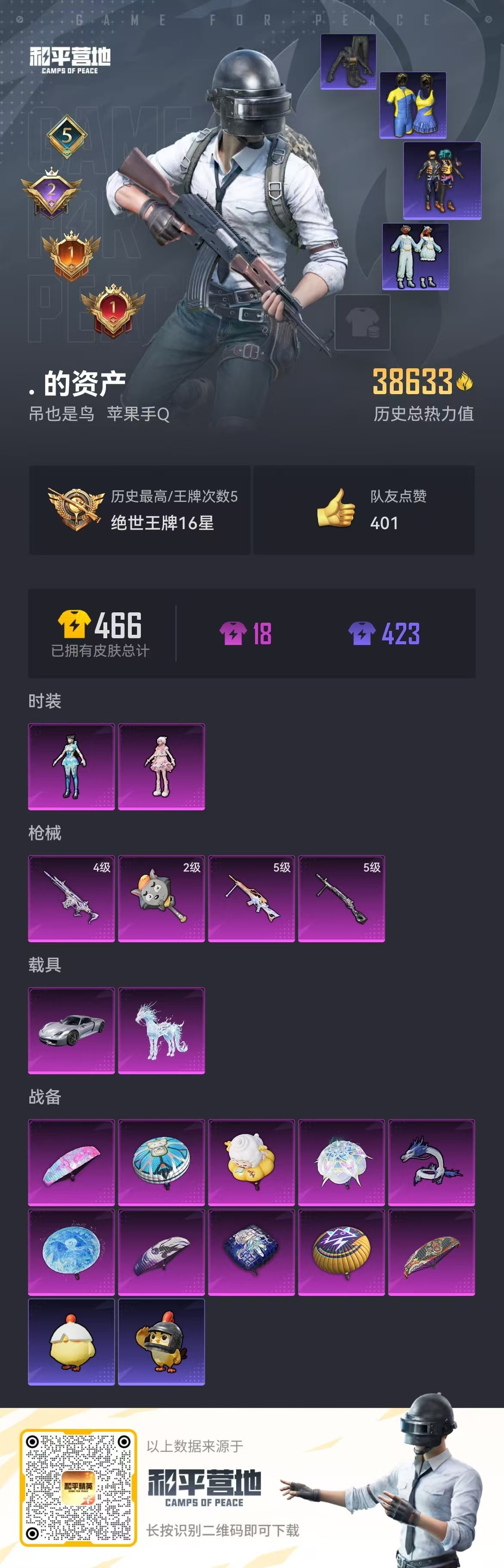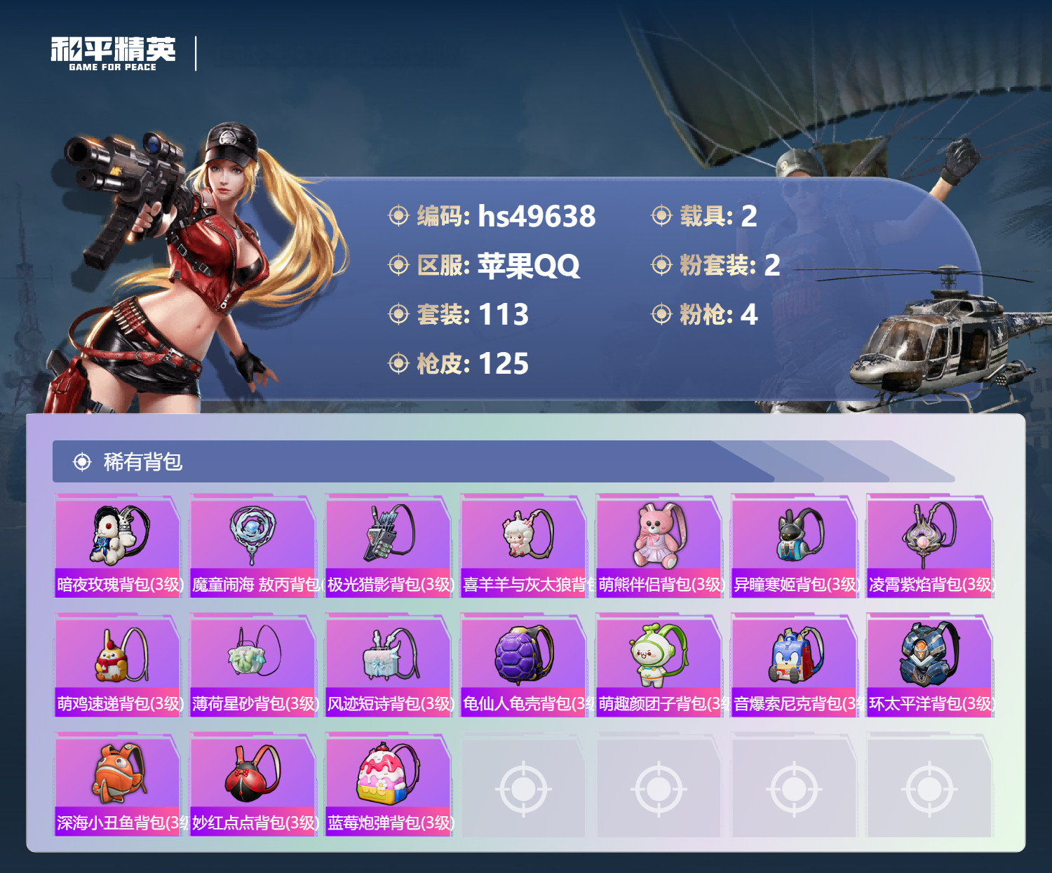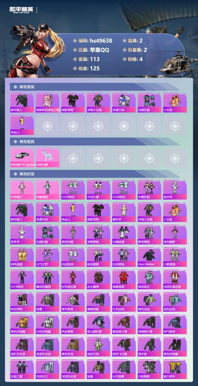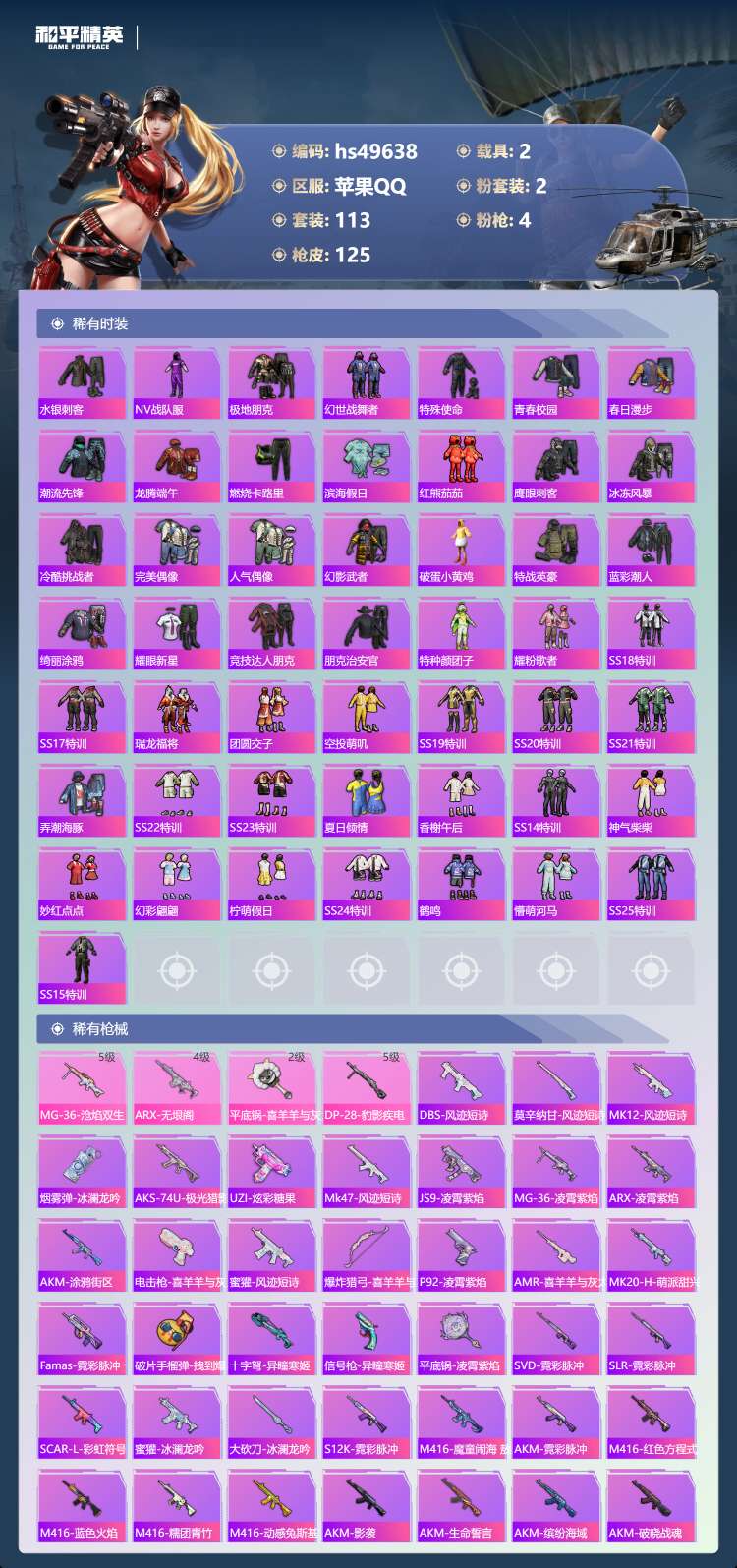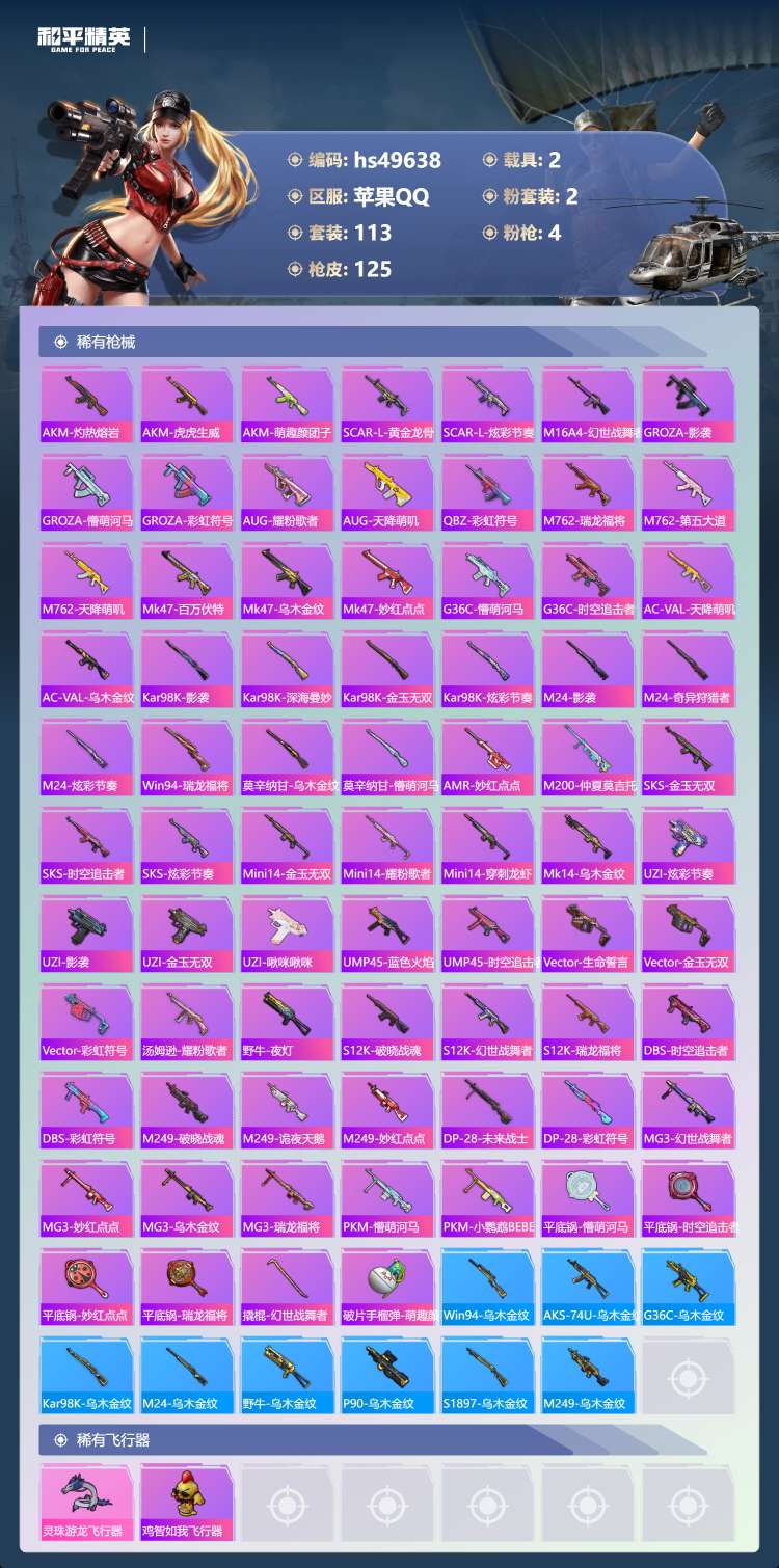 hs49638 苹果手Q-5王牌印记-2粉装-4特效枪-2载具-38633热力值-113套装-125