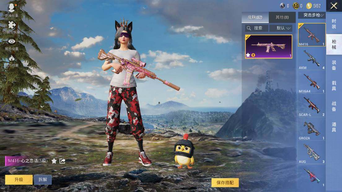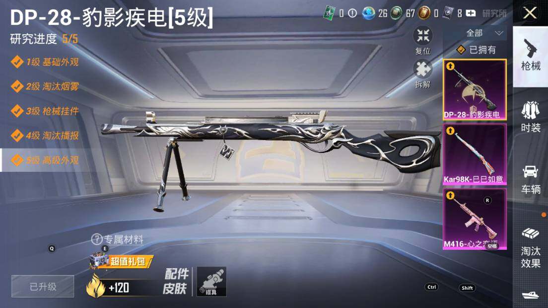 【粉色枪皮等级】:M416-心之恋语(五级),Kar98K-巳巳如意(五级),DP-28-豹影疾电(五级)