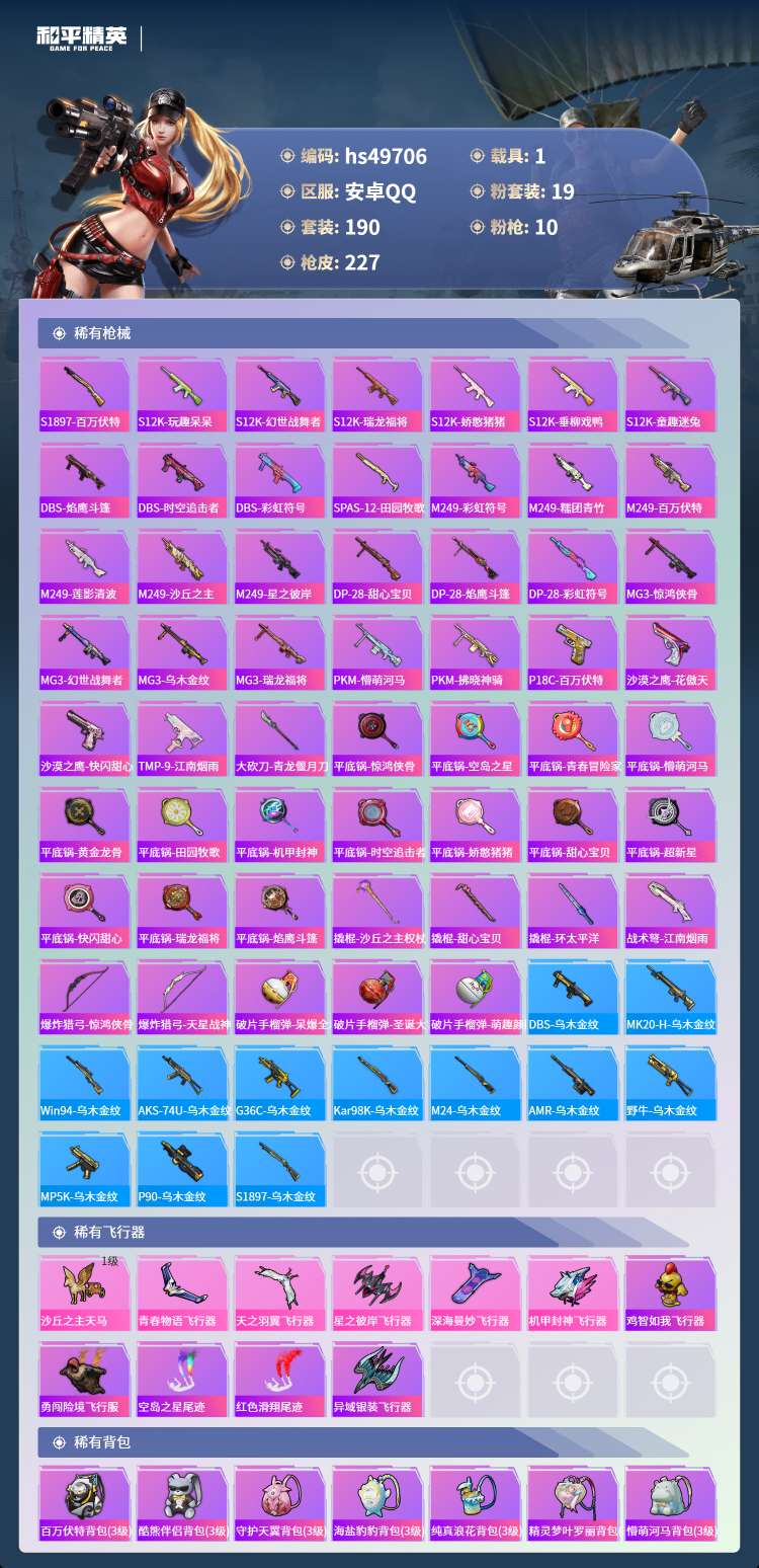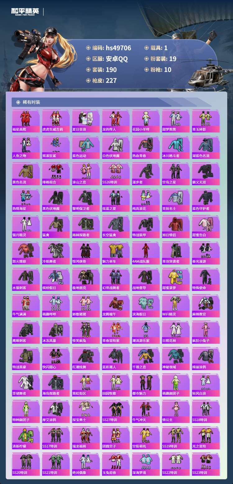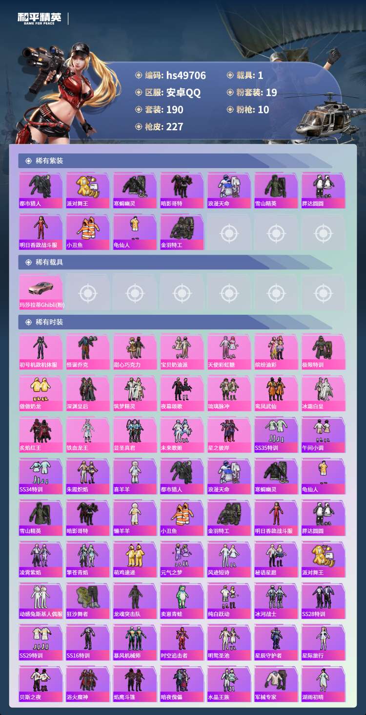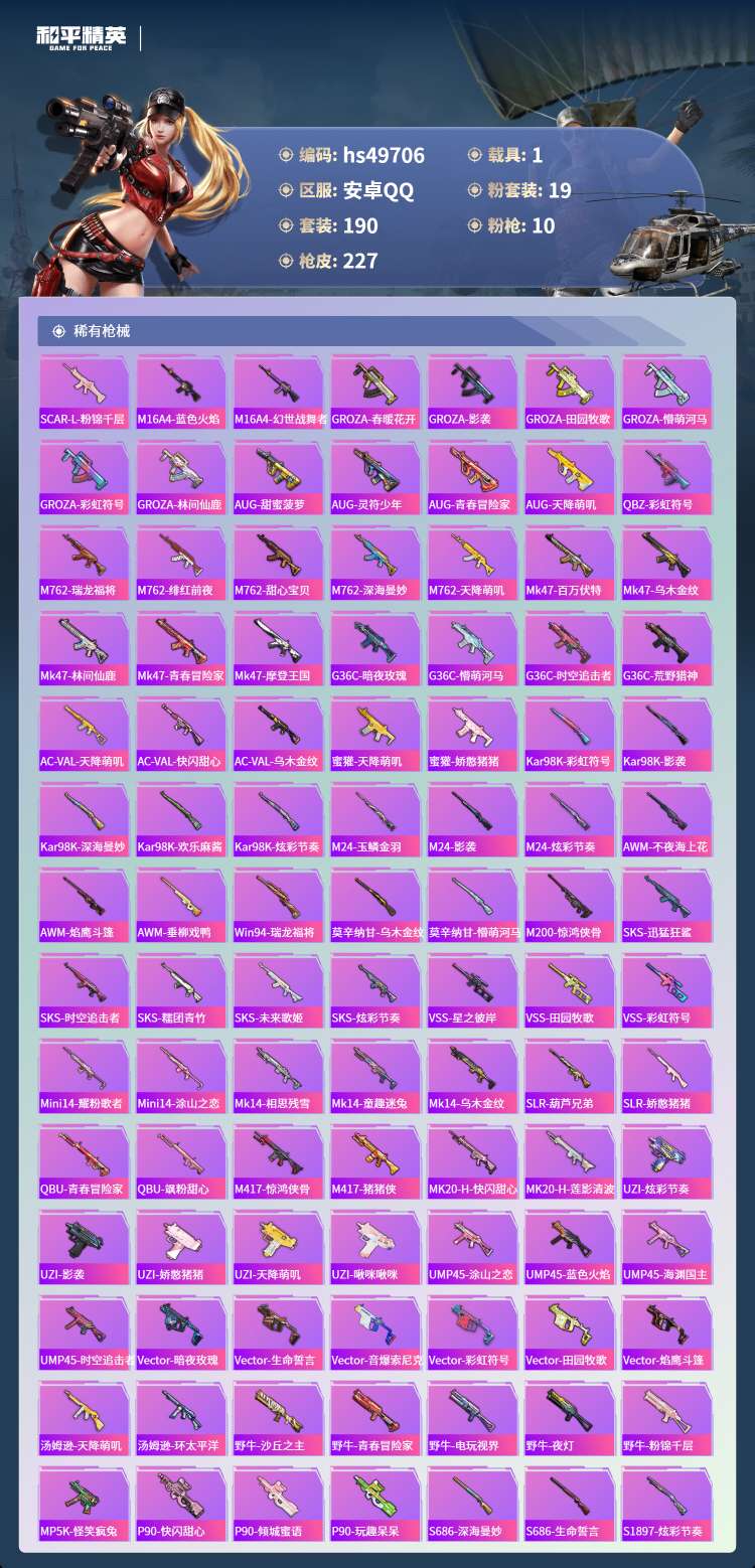 hs49706 安卓手Q-10王牌印记-19粉装-10特效枪-1载具-82137热力值-190套装-
