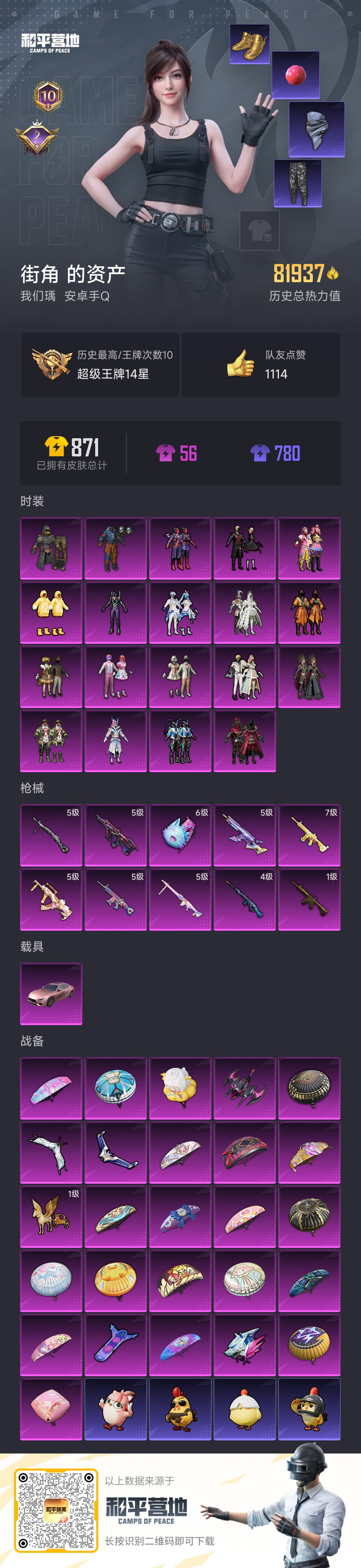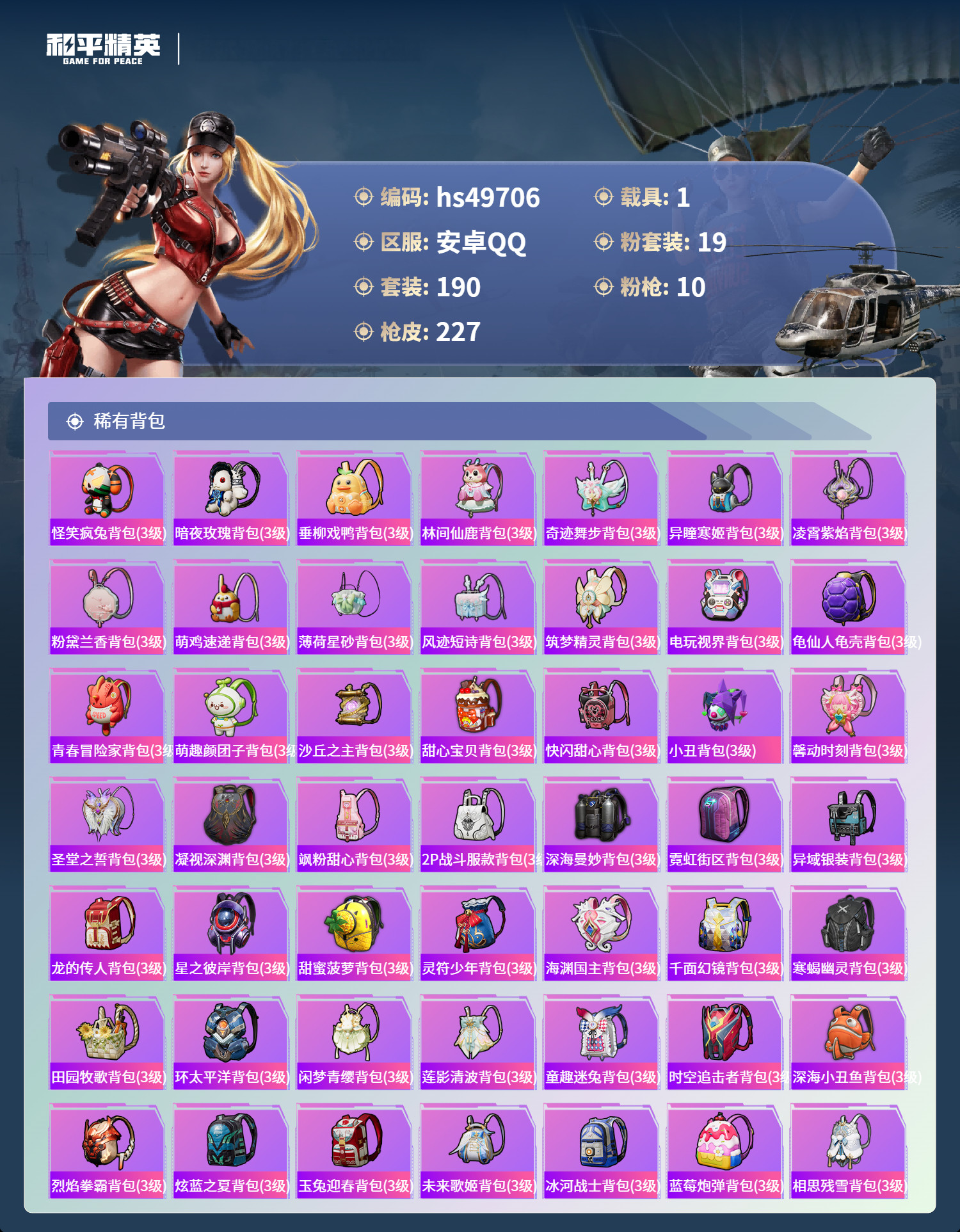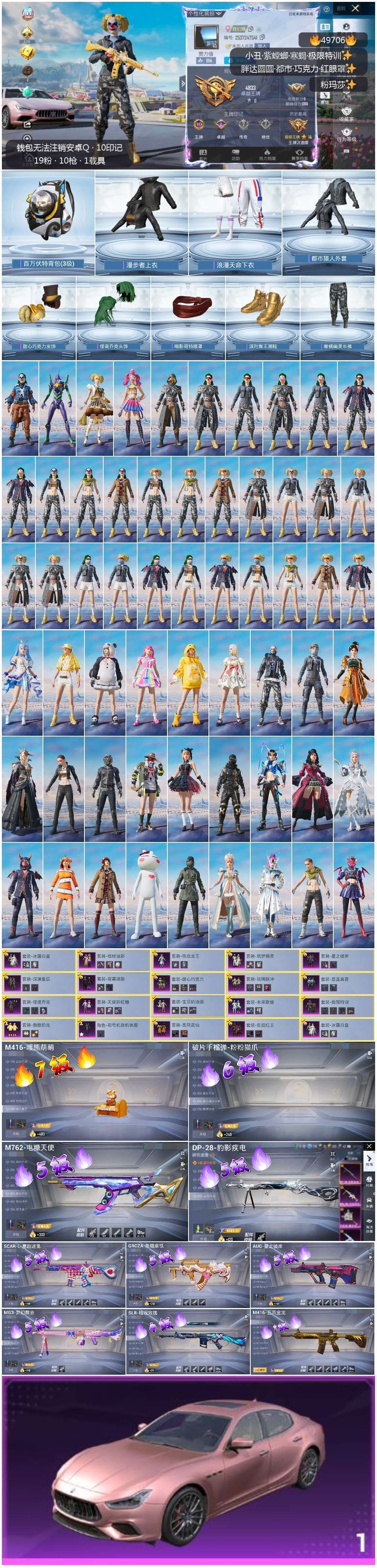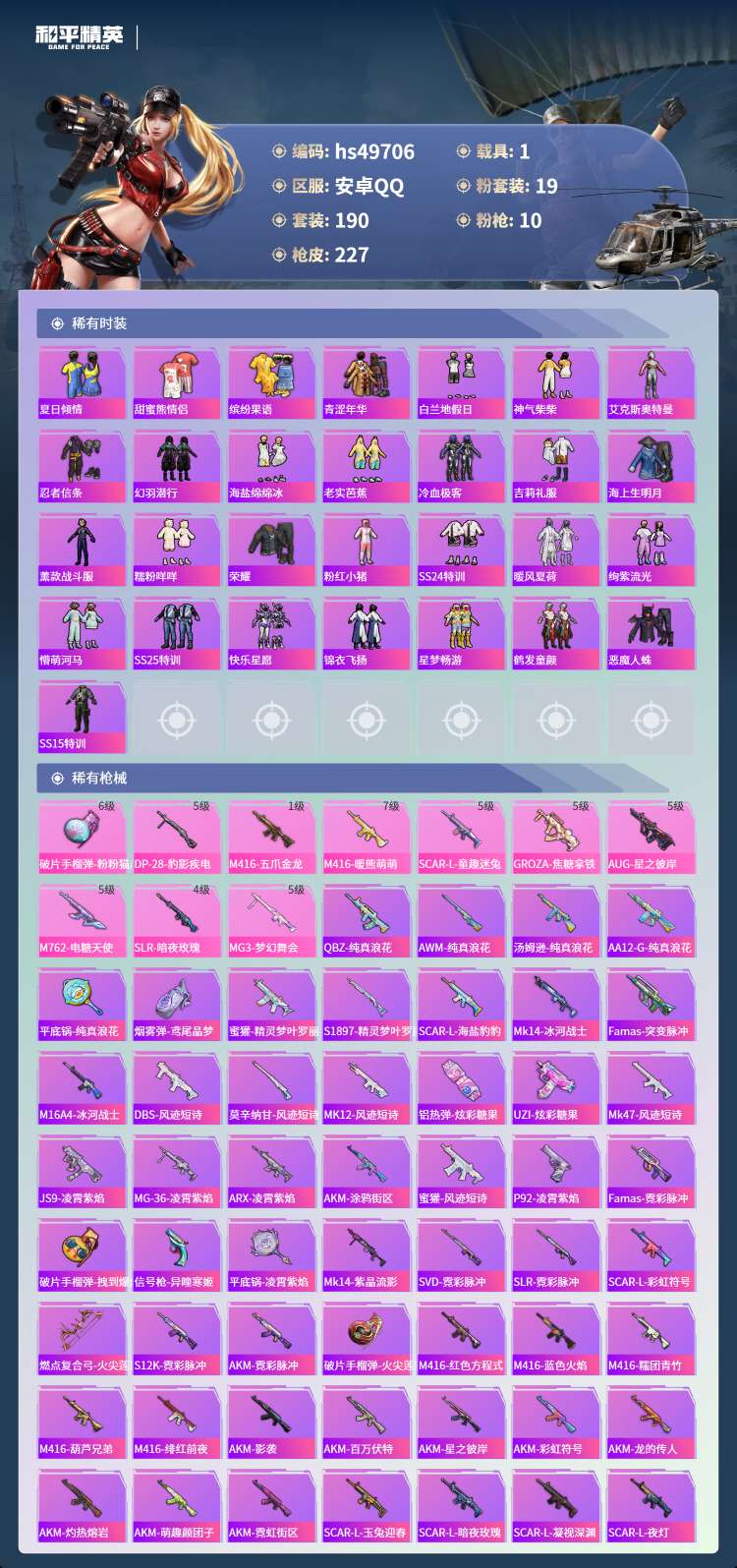 hs49706 安卓手Q-10王牌印记-19粉装-10特效枪-1载具-82137热力值-190套装-