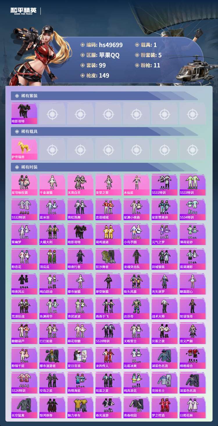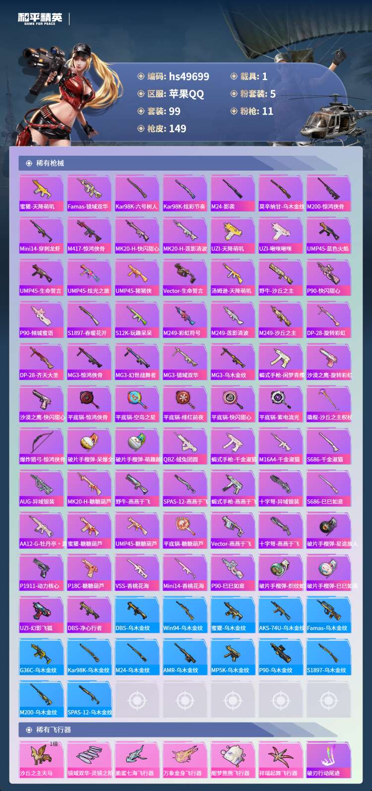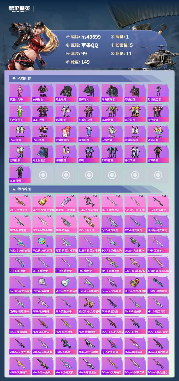 hs49699 苹果手Q-8王牌印记-5粉装-11特效枪-1载具-52245热力值-99套装-149