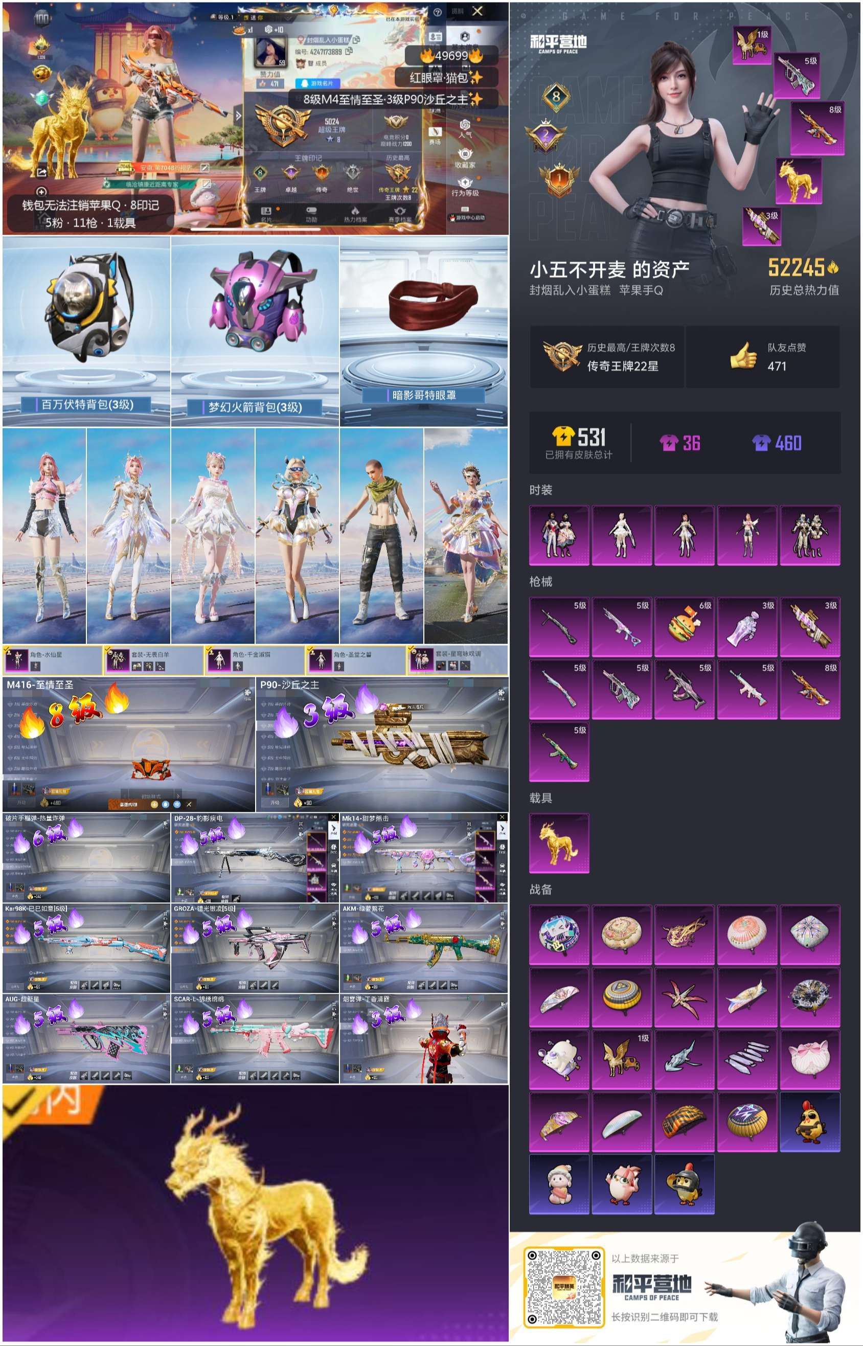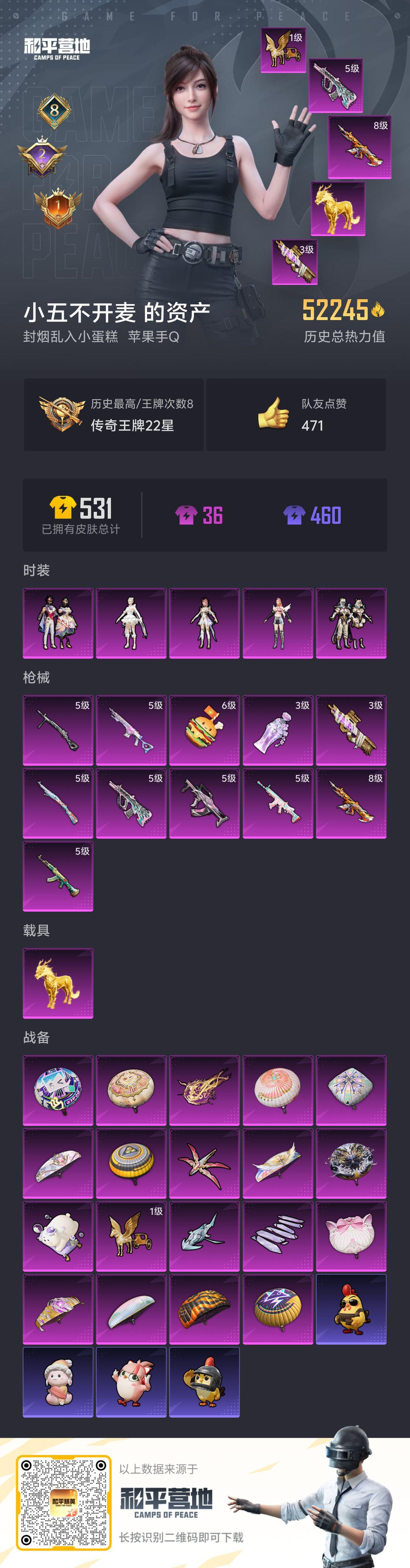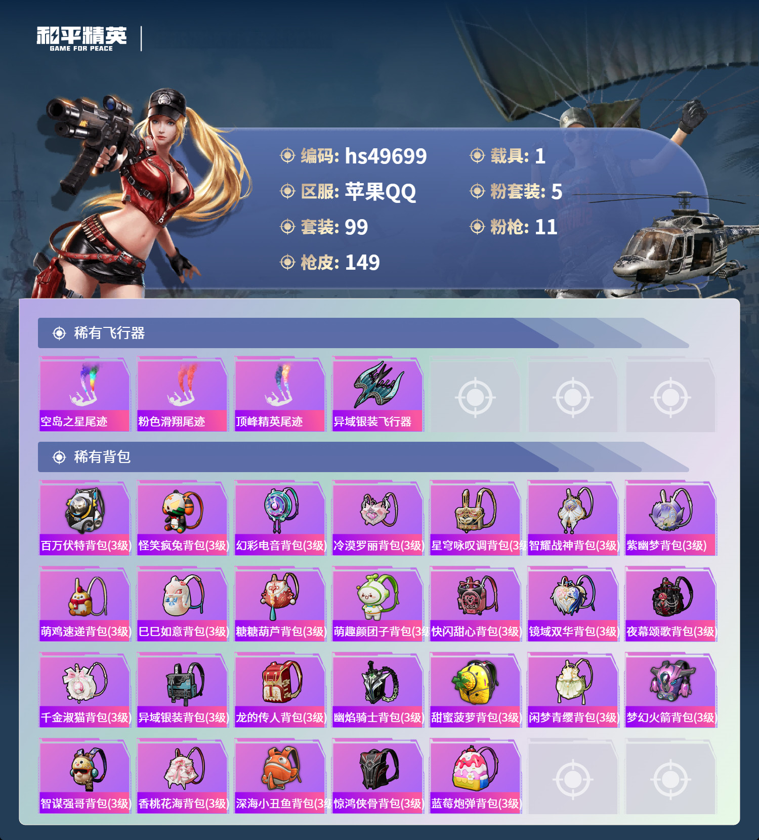 hs49699 苹果手Q-8王牌印记-5粉装-11特效枪-1载具-52245热力值-99套装-149