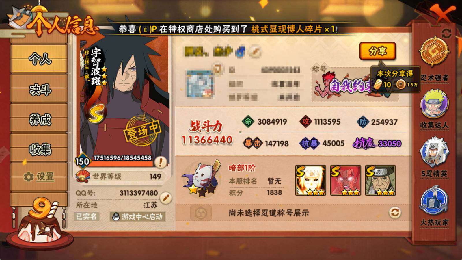 【HY3799】V9/战力1136W/S忍16/A忍40/2星大野木「侠隐江湖」/3星波风水门「九喇嘛连结」/五代目雷影-达鲁伊/死司凭血-飞段/5星猿飞阿斯玛/须佐能乎-旗木卡卡西/火影继承人-猿飞日斩/秽土转生-猿飞日斩/五代目水影-照美冥/5星迈特凯/六代目水影-长十郎/2星蝎「绯流琥」/2星桃地再不斩「秽土转生」/百豪-春野樱/白面具-宇智波斑/死门-迈特凯/3星自来也「传说中的三忍」/四代目土影-黑土/秽土转生-迪达拉/半蛇斗篷-药师兜/2星神农「羁绊」/忍界大战-我爱罗/迪达拉/4星