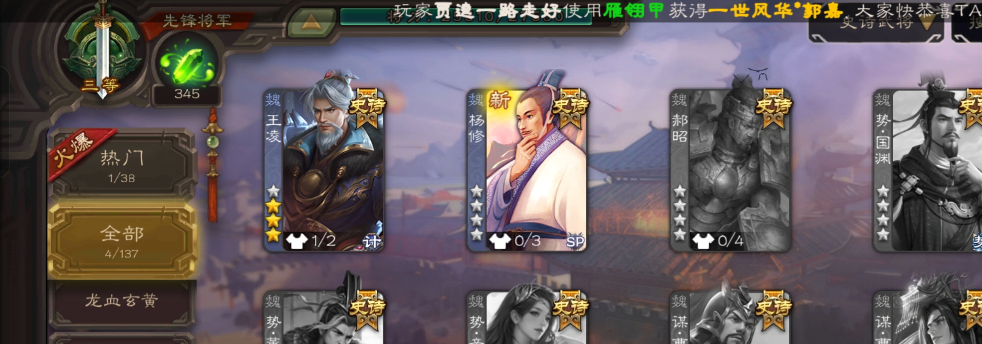 4史诗双神先锋,天工谋大乔,大宝界徐盛动王凌花鬘杨修,神周瑜神吕蒙谋高顺贾充135将