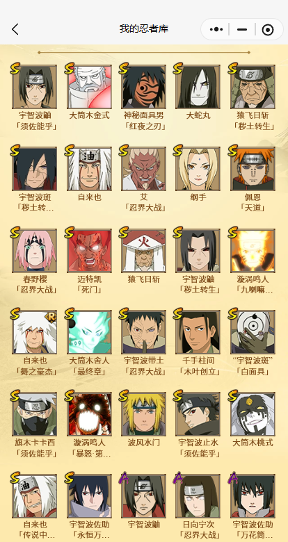 【S忍者】宇智波止水「须佐能乎」,艾「忍界大战」,大筒木桃式,宇智波斑「秽土转生·解」,千手柱间「木叶创立」,宇智波佐助「永恒万花筒」,神秘面具男「红夜之刃」,春野樱「忍界大战」,大筒木金式,漩涡鸣人「九喇嘛连结」,迈特凯「S门」,宇智波带土「忍界大战」,自来也「舞之豪杰」,旗木卡卡西「须佐能乎」,大筒木舍人「最终章」